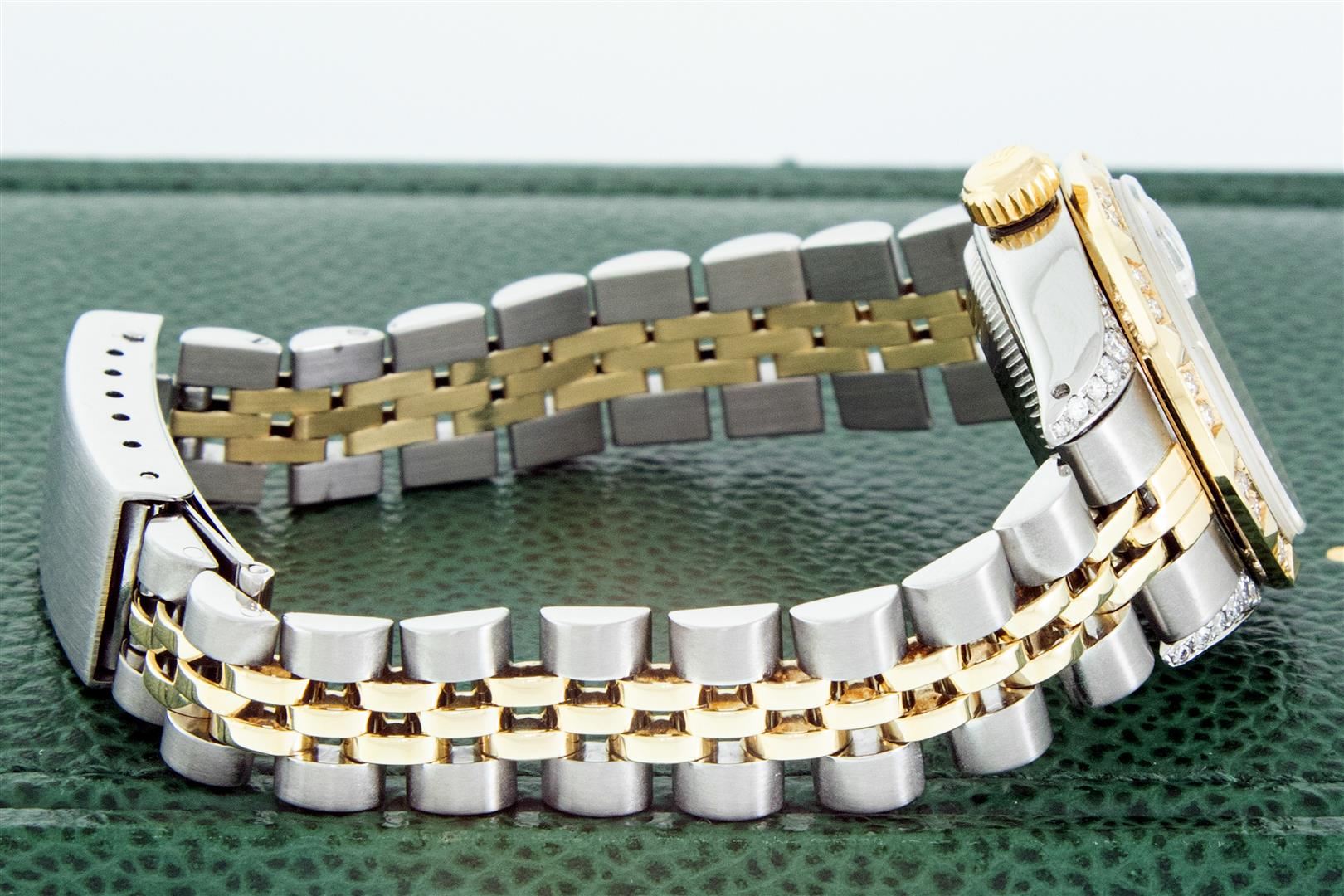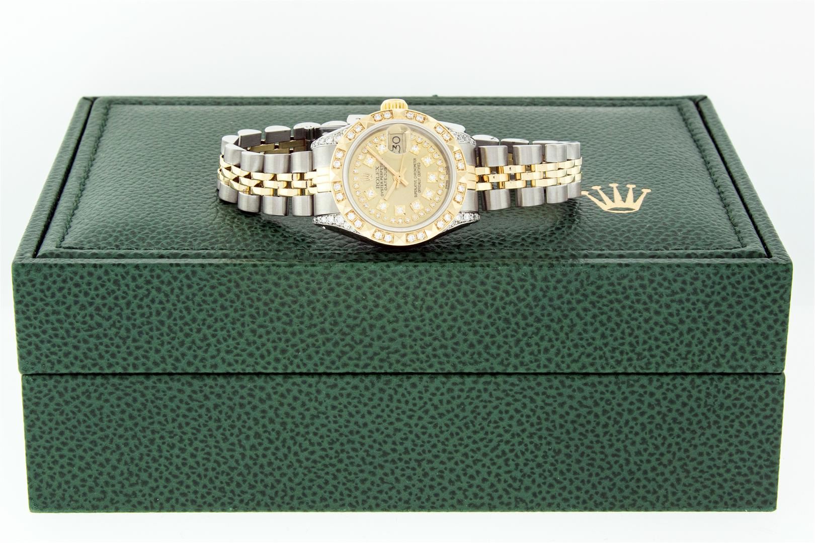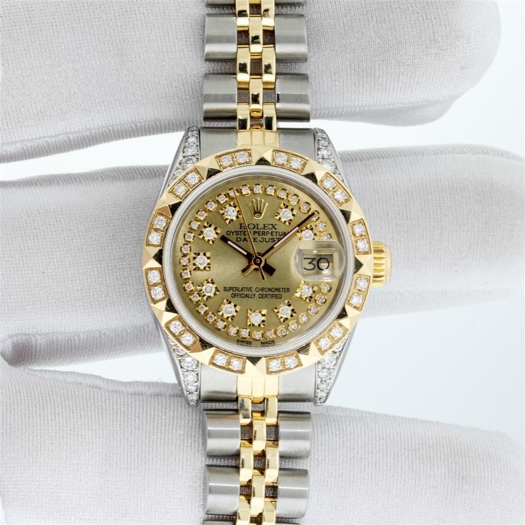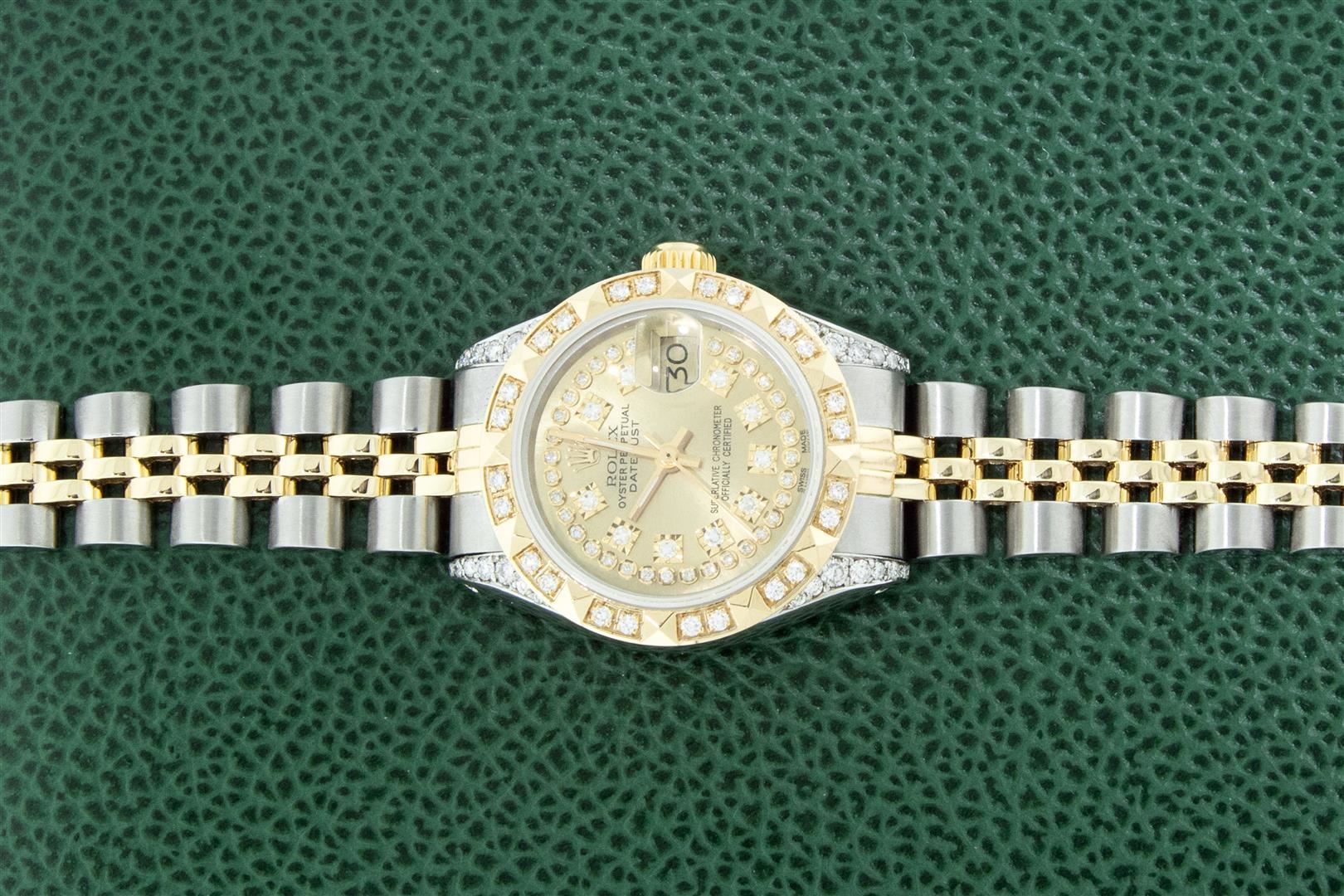 One Ladies Two Tone Rolex Datejust Polished, Serviced & Electronically Tested, Rolex Yellow Gold & Stainless Steel Case: 26mm, Rolex Yellow Gold Crown, Custom Diamond Lugs: 24 Diamonds On Lugs, Clarity: SI-VS, Color: G to H, Clarity SI-VS. Custom Bezel: New 18K Yellow Gold Pyramid Diamond Bezel, Diamond Count: 24 Diamonds, Total Weight For Bezel .50 Carat, Clarity: SI-VS, Color: G to H. Custom Crystal: New Scratch Resistant Synthetic Sapphire Cyclops Lens. Custom Hands: New Luminescent Hands. Rolex Movement: Automatic Winding Movement. Custom Dial: Refinished To Champagne With Added Diamond Hour Markers, Diamond Count: 43 Diamonds In Dial, Clarity: SI-VS, Color: G to H. Date Window: 3 O'clock Position Date Display, Model: Datejust. Condition: G-6 Extra Fine. Rolex Bracelet: Two Tone Yellow Gold & Stainless Steel Jubilee Band. Bright Polish. 6.0 Inch Length, Adjustable. Standard Clasp, With Rolex Logo. This Pre Owned Watch Has Been Serviced Time Tested And Is In Excellent Condition It Is Free Of All Scratches And Dents. This Watch Comes With A Rolex Box.