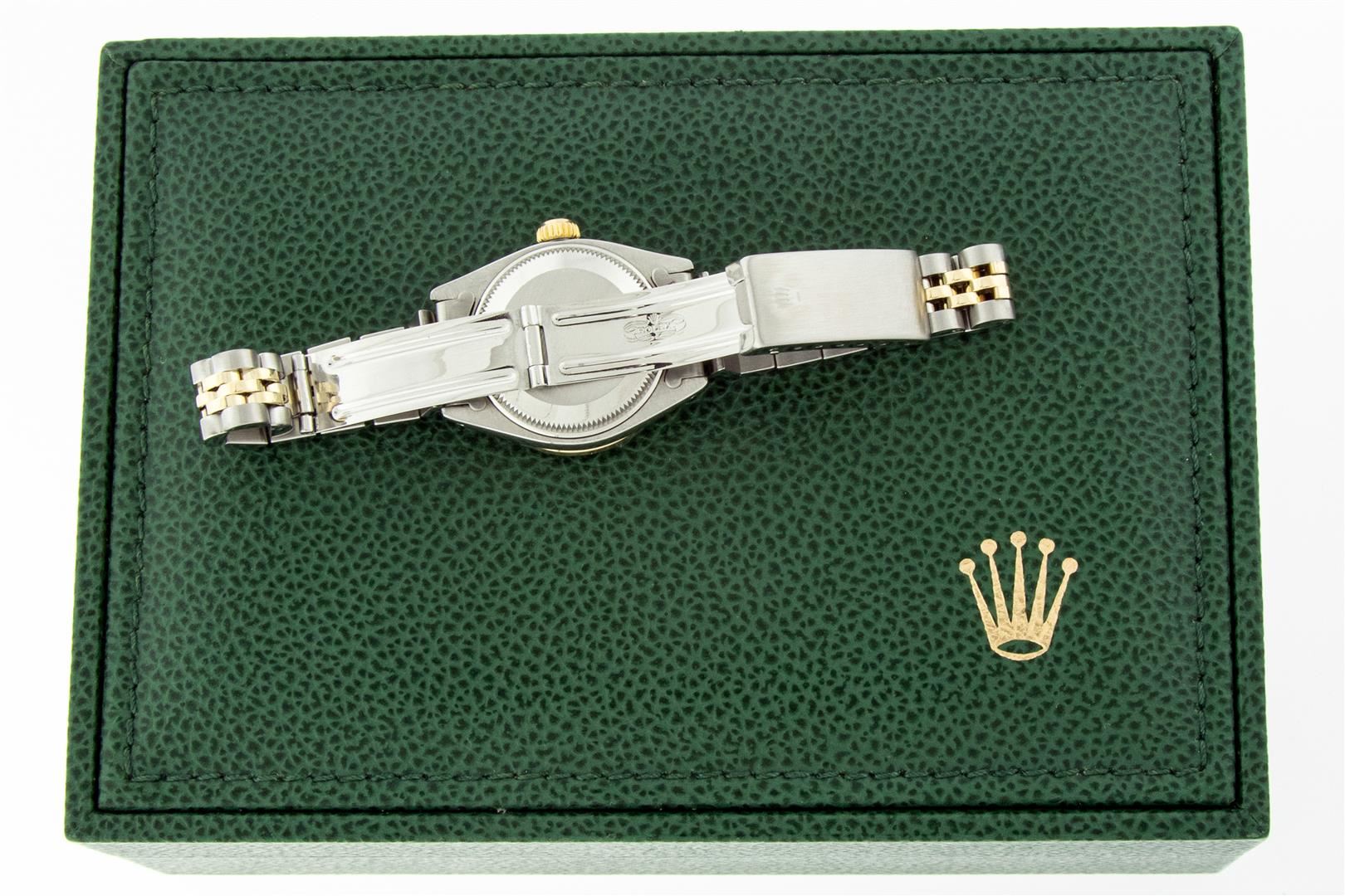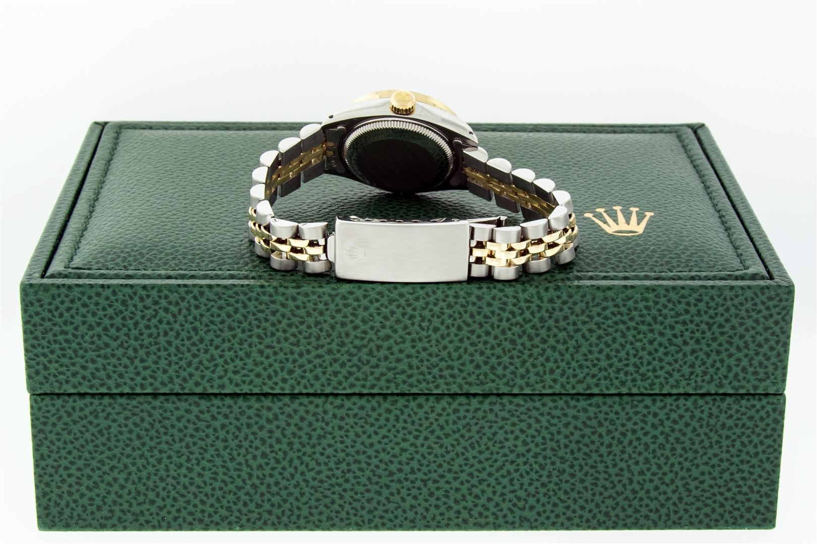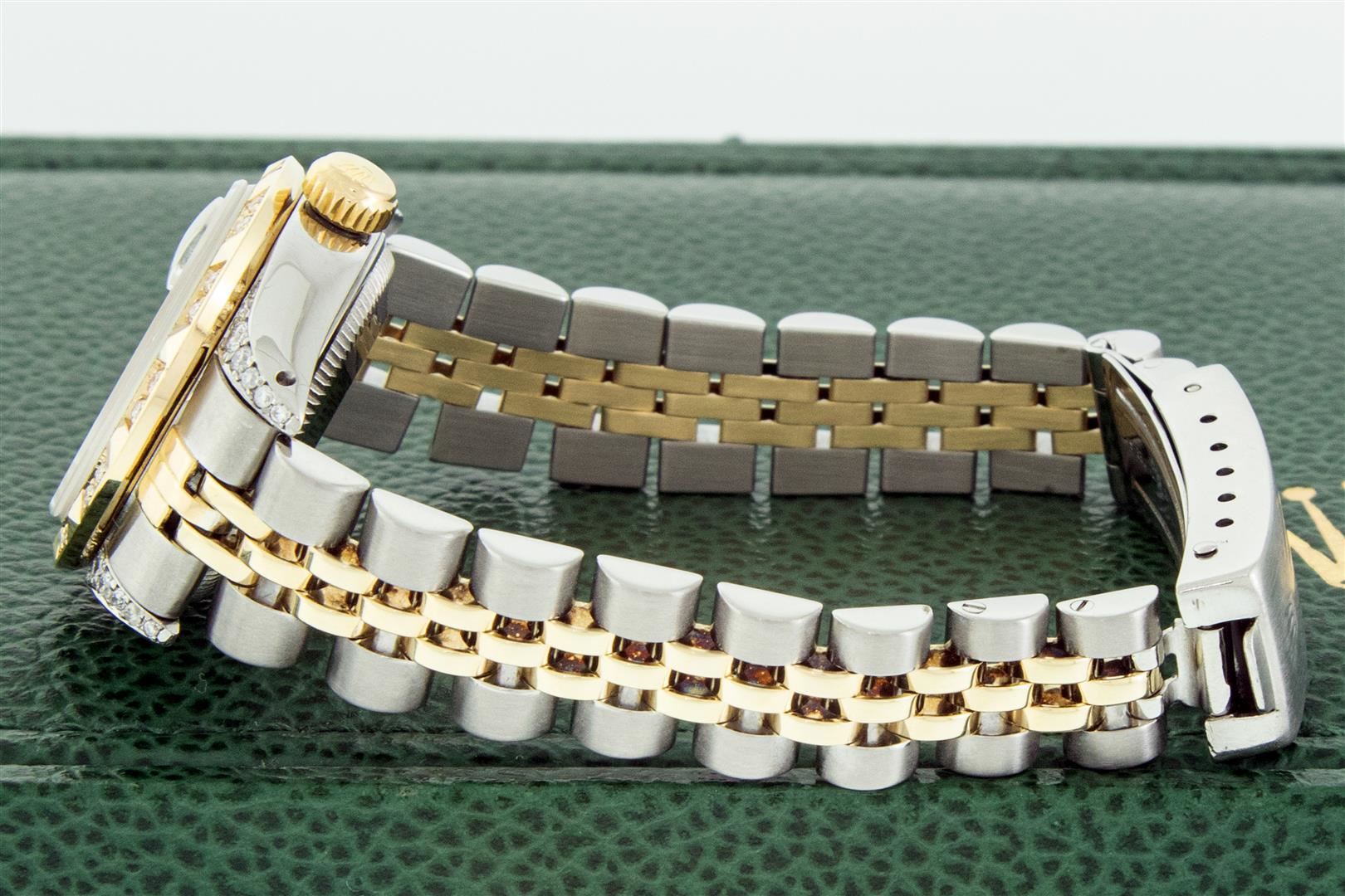 One Ladies Two Tone Rolex Datejust Polished, Serviced & Electronically Tested, Rolex Yellow Gold & Stainless Steel Case: 26mm, Rolex Yellow Gold Crown, Custom Diamond Lugs: 24 Diamonds On Lugs, Clarity: SI-VS, Color: G to H, Clarity SI-VS. Custom Bezel: New 18K Yellow Gold Pyramid Diamond Bezel, Diamond Count: 24 Diamonds, Total Weight For Bezel .50 Carat, Clarity: SI-VS, Color: G to H. Custom Crystal: New Scratch Resistant Synthetic Sapphire Cyclops Lens. Custom Hands: New Luminescent Hands. Rolex Movement: Automatic Winding Movement. Custom Dial: Refinished To Champagne With Added Diamond Hour Markers, Diamond Count: 43 Diamonds In Dial, Clarity: SI-VS, Color: G to H. Date Window: 3 O'clock Position Date Display, Model: Datejust. Condition: G-6 Extra Fine. Rolex Bracelet: Two Tone Yellow Gold & Stainless Steel Jubilee Band. Bright Polish. 6.0 Inch Length, Adjustable. Standard Clasp, With Rolex Logo. This Pre Owned Watch Has Been Serviced Time Tested And Is In Excellent Condition It Is Free Of All Scratches And Dents. This Watch Comes With A Rolex Box.