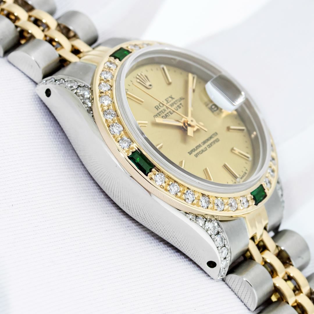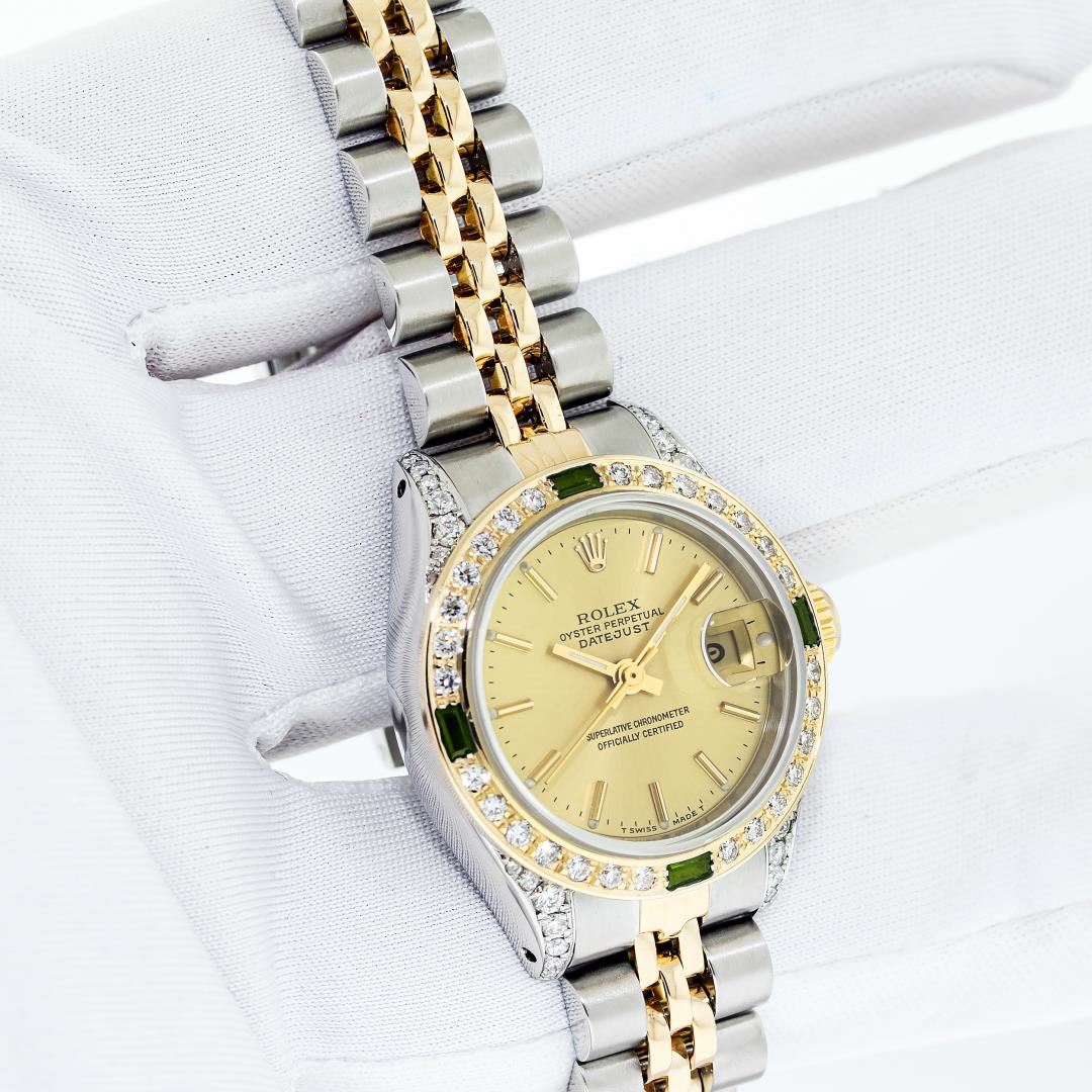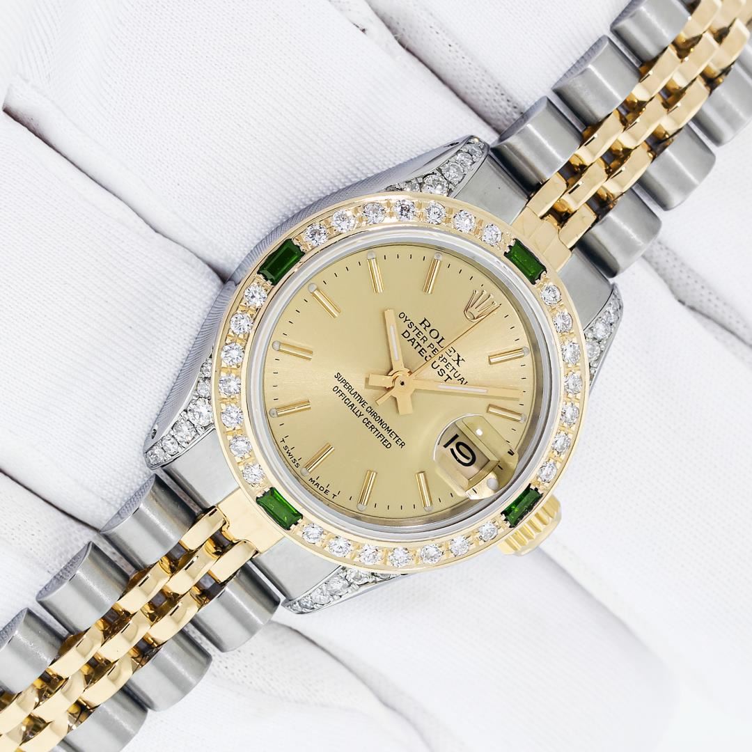 Rolex Ladies Pre Owned Quickset 18K Yellow Gold and Stainless Steel Two Tone Wristwatch Polished Bright with Satin Finish, Serviced & Electronically Tested, Rolex Stainless Steel Case: 26mm, Custom Diamond Lugs: Added Diamonds On Lugs, Diamond Count: 24 Diamonds On Lugs, Color: G To H, Clarity: SI-VS. Rolex Yellow Gold Crown, Custom Bezel: New 18K Yellow Gold Beadset And Emerald Diamond Bezel, Stone Count: 28 Diamonds + 4 Emeralds On Bezel. Custom Crystal: New Sapphire With Magnified Date Window. Custom Hands: New Hands. Rolex Movement: Automatic Winding Movement. Rolex Dial: Champagne Dial With Dash Track & Lumi Dots, Date Window: 3 O'Clock Position Date Display, Model: Quickset Datejust, Condition: G-6 Extra Fine. Rolex Bracelet: Stainless Steel and 18K Yellow Gold Jubilee Band. Bright Polish & Satin Finish. 6.0 Inch Length, Adjustable. Standard Clasp, With Rolex Logo. This Watch Has Been Serviced Time Tested And Is In Excellent Condition It Is Free Of All Scratches And Dents.