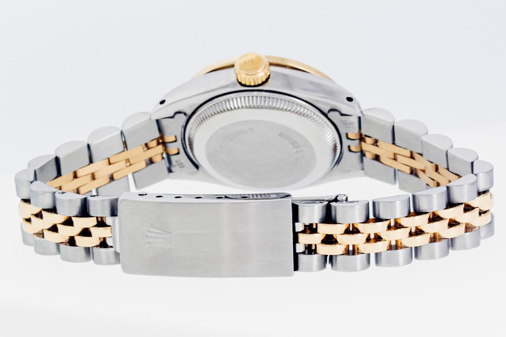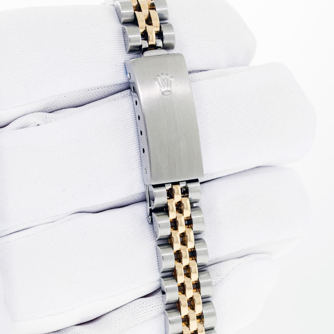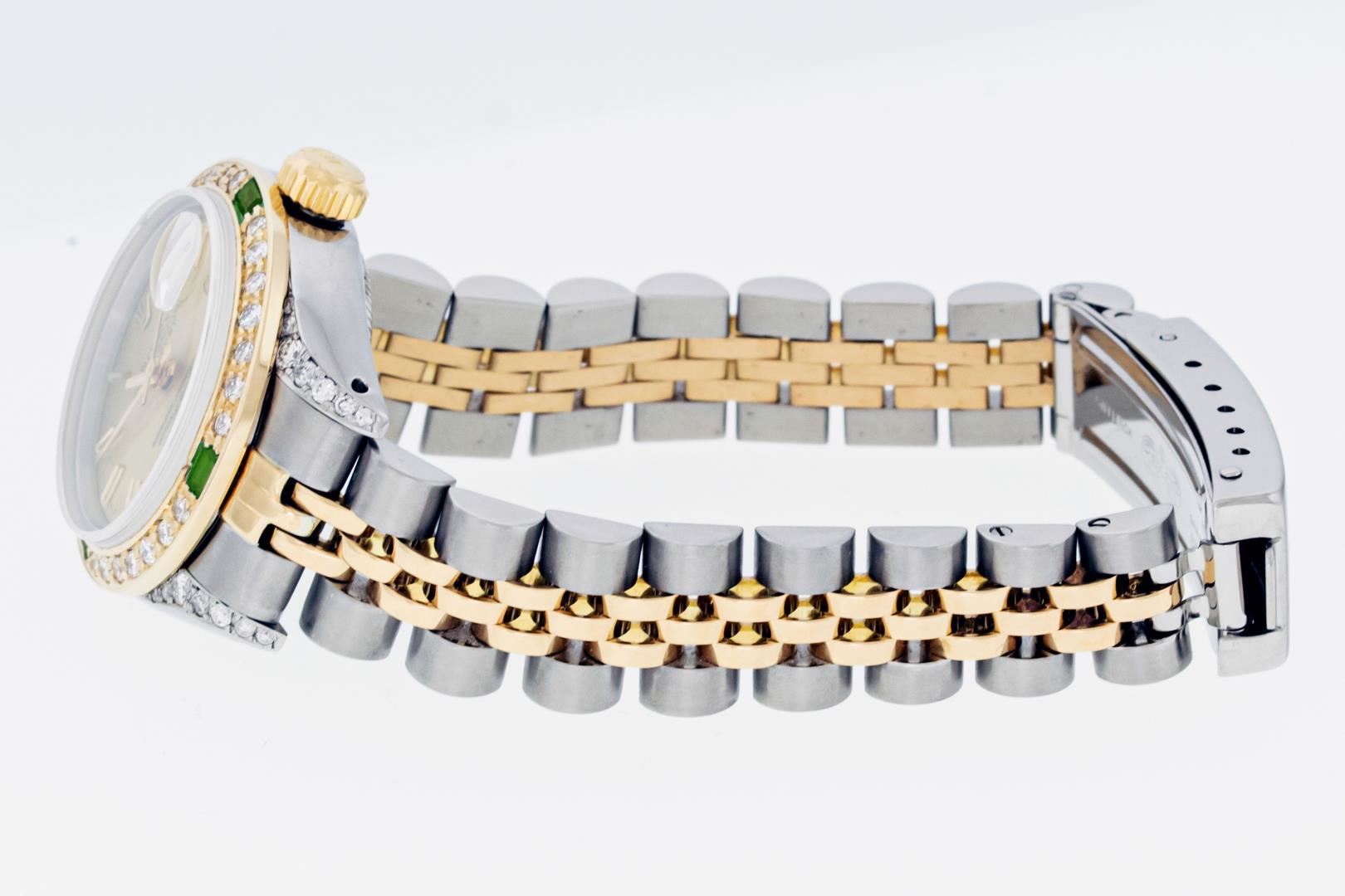 Rolex Ladies Pre Owned Quickset 18K Yellow Gold and Stainless Steel Two Tone Wristwatch Polished Bright with Satin Finish, Serviced & Electronically Tested, Rolex Stainless Steel Case: 26mm, Custom Diamond Lugs: Added Diamonds On Lugs, Diamond Count: 24 Diamonds On Lugs, Color: G To H, Clarity: SI-VS. Rolex Yellow Gold Crown, Custom Bezel: New 18K Yellow Gold Beadset And Emerald Diamond Bezel, Stone Count: 28 Diamonds + 4 Emeralds On Bezel. Custom Crystal: New Sapphire With Magnified Date Window. Custom Hands: New Hands. Rolex Movement: Automatic Winding Movement. Rolex Dial: Champagne Dial With Dash Track & Lumi Dots, Date Window: 3 O'Clock Position Date Display, Model: Quickset Datejust, Condition: G-6 Extra Fine. Rolex Bracelet: Stainless Steel and 18K Yellow Gold Jubilee Band. Bright Polish & Satin Finish. 6.0 Inch Length, Adjustable. Standard Clasp, With Rolex Logo. This Watch Has Been Serviced Time Tested And Is In Excellent Condition It Is Free Of All Scratches And Dents.