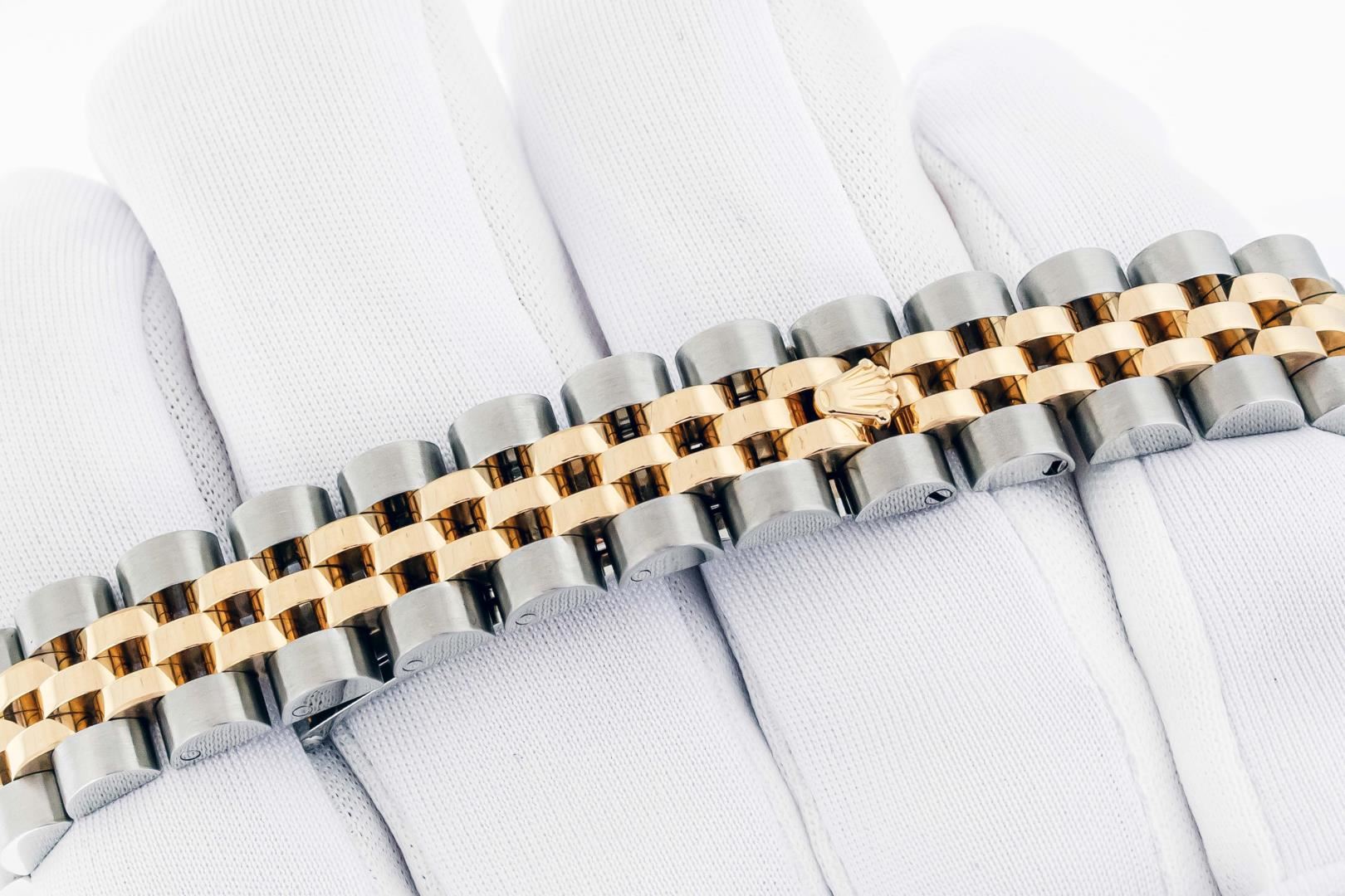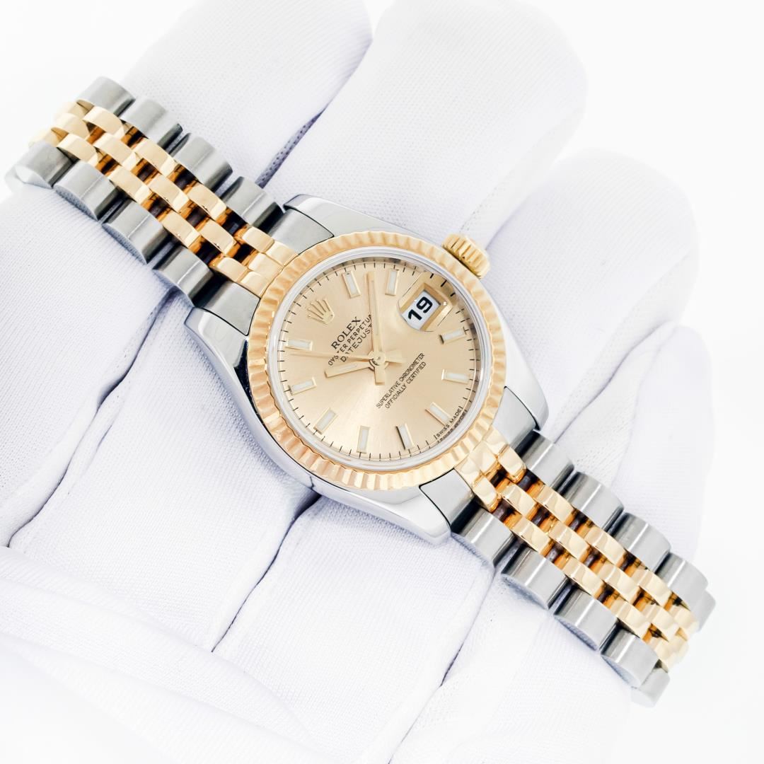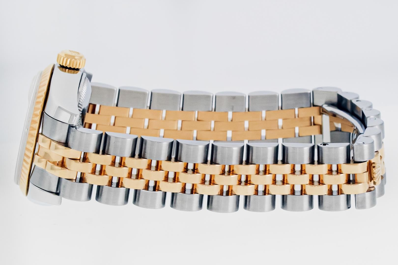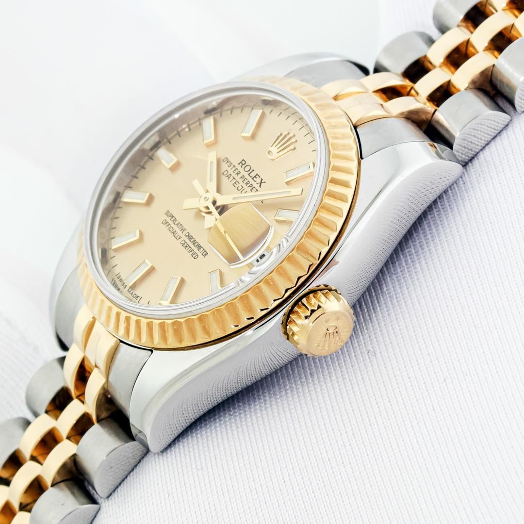 One Ladies Pre Owned Quickset Sapphire 2T 18K Yellow Gold & Stainless Steel Rolex Datejust Polished Bright with Satin Finish, Serviced & Electronically Tested, Rolex Stainless Steel Case: 26mm, Rolex 18K Yellow Gold Crown, Rolex Bezel: 18K Yellow Gold Fluted Bezel. Crystal: Sapphire With Magnified Date Window. Hands: Luminescent Hands. Rolex Movement: Automatic Winding Movement 2235. Rolex Dial: Champagne Index With Dash Track. Date Window: 3 O'Clock Position Date Display, Model: Sapphire Quickset Datejust. Condition: G-6 Extra Fine. Rolex Bracelet: 18K Yellow Gold & Stainless Steel Jubilee Band. Bright Polish & Satin Finish. 6.0 Inch Length, Adjustable. Hidden Clap, With Rolex Logo. This Watch Has Been Serviced Time Tested And Is In Excellent Condition It Is Free Of All Scratches And Dents.