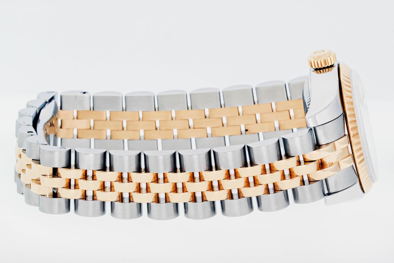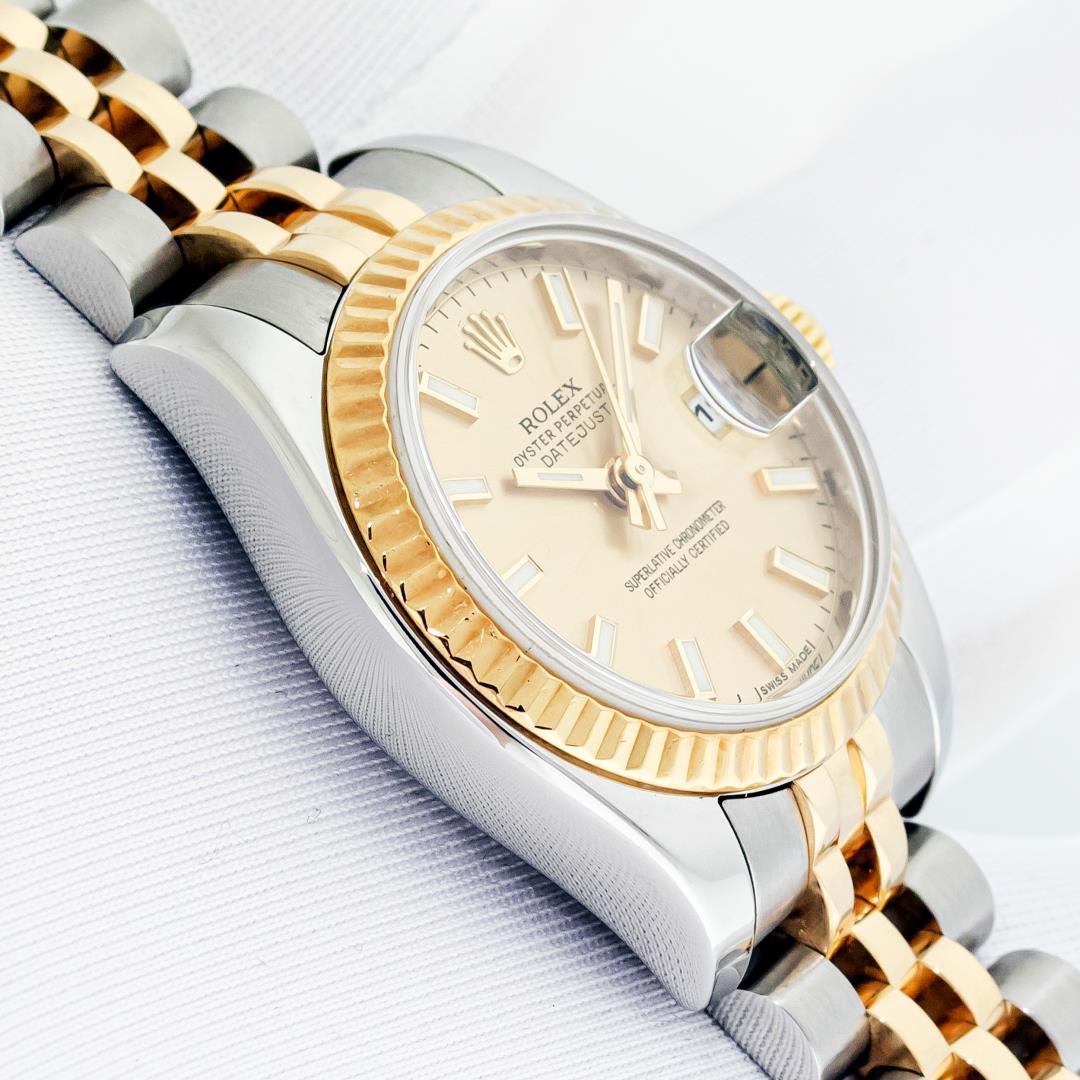 One Ladies Pre Owned Quickset Sapphire 2T 18K Yellow Gold & Stainless Steel Rolex Datejust Polished Bright with Satin Finish, Serviced & Electronically Tested, Rolex Stainless Steel Case: 26mm, Rolex 18K Yellow Gold Crown, Rolex Bezel: 18K Yellow Gold Fluted Bezel. Crystal: Sapphire With Magnified Date Window. Hands: Luminescent Hands. Rolex Movement: Automatic Winding Movement 2235. Rolex Dial: Champagne Index With Dash Track. Date Window: 3 O'Clock Position Date Display, Model: Sapphire Quickset Datejust. Condition: G-6 Extra Fine. Rolex Bracelet: 18K Yellow Gold & Stainless Steel Jubilee Band. Bright Polish & Satin Finish. 6.0 Inch Length, Adjustable. Hidden Clap, With Rolex Logo. This Watch Has Been Serviced Time Tested And Is In Excellent Condition It Is Free Of All Scratches And Dents.