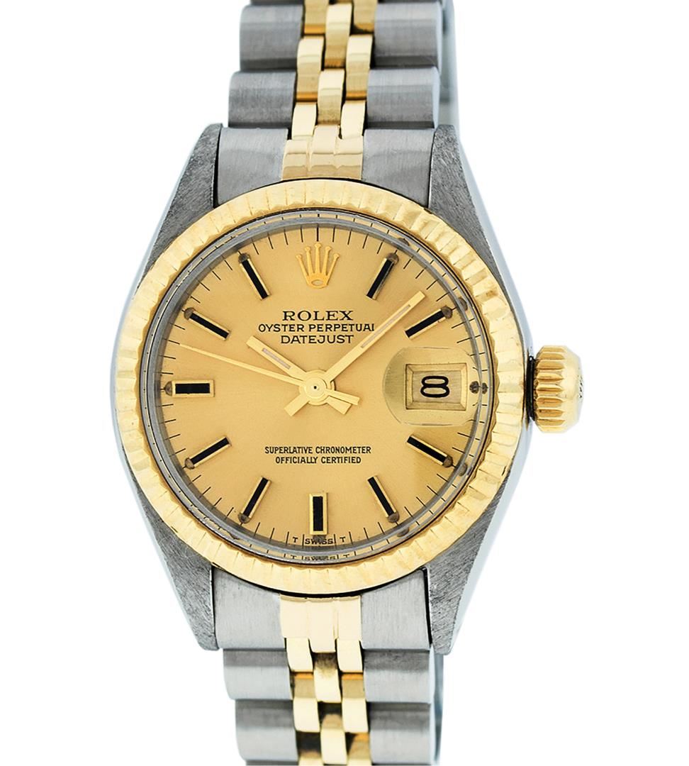 One Ladies Pre Owned Two Tone 14K Yellow Gold & Stainless Steel Rolex Polished, Serviced & Electronically Tested, Rolex Yellow Gold & Stainless Steel Case: 26mm, Rolex Yellow Gold Crown, Rolex Bezel: 14K Yellow Gold Fluted Bezel. Custom Crystal: New Plexiglass With Date Window. Custom Hands: New Luminescent Hands. Rolex Movement: Automatic Winding Movement 2030. Rolex Dial: Champagne Index With Dash Track & Lumi Dots. Date Window: 3 O'Clock Position Date Display, Model: Datejust. Condition: G-6 Extra Fine. Rolex Bracelet: Two Tone 14K Yellow Gold & Stainless Steel Jubilee Band. Bright Polish. 6.0 Inch Length, Adjustable. Standard Clasp, With Rolex Logo. This Watch Has Been Serviced Time Tested And Is In Excellent Condition It Is Free Of All Scratches And Dents.