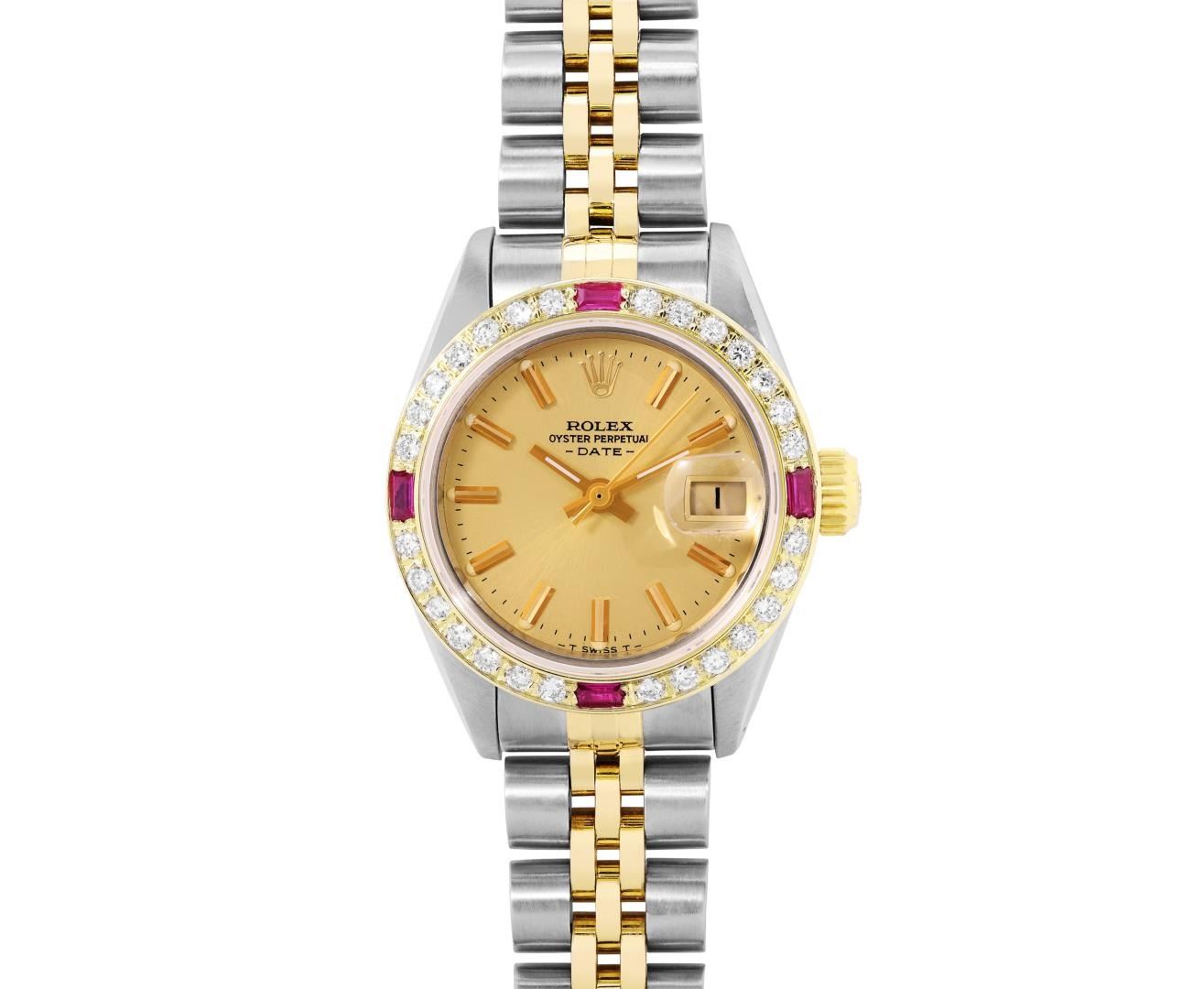 One Rolex Ladies Pre Owned Two Tone 14K Yellow Gold And Stainless Steel Rolex Date Polished, Serviced And Electronically Tested, Rolex Yellow Gold And Stainless Steel Case: 26mm, Rolex Yellow Gold Crown, Custom Bezel: New 18K Yellow Gold Ruby Beadset Diamond Bezel, Diamond + Gem Count: 36 Diamonds + 4 Rubies. Custom Crystal: New Acrylic With Magnifying Date Window. Custom Hands: New Luminescent Hands. Rolex Movement: Automatic Winding Movement 2035. Rolex Factory Dial: Champagne With Index Hour Markers And Dash Track. Date Window: 3 O'Clock Position Date Display, Condition: G-6 Extra Fine. Rolex Bracelet: Two Tone 14K Yellow Gold And Stainless Steel Jubilee Band. Bright Polish And Satin Finish. 6.0 Inch Length, Adjustable. Standard Clasp, With Rolex Logo. This Watch Has Been Serviced Time Tested And Is In Excellent Condition It Is Free Of All Scratches And Dents. This Watch Comes With A Rolex Box.