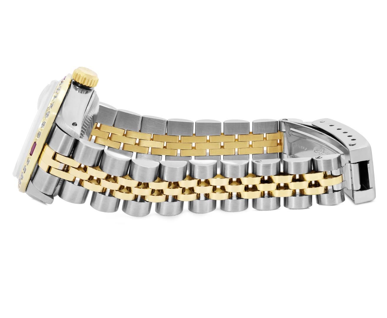 One Rolex Ladies Pre Owned Two Tone 14K Yellow Gold And Stainless Steel Rolex Date Polished, Serviced And Electronically Tested, Rolex Yellow Gold And Stainless Steel Case: 26mm, Rolex Yellow Gold Crown, Custom Bezel: New 18K Yellow Gold Ruby Beadset Diamond Bezel, Diamond + Gem Count: 36 Diamonds + 4 Rubies. Custom Crystal: New Acrylic With Magnifying Date Window. Custom Hands: New Luminescent Hands. Rolex Movement: Automatic Winding Movement 2035. Rolex Factory Dial: Champagne With Index Hour Markers And Dash Track. Date Window: 3 O'Clock Position Date Display, Condition: G-6 Extra Fine. Rolex Bracelet: Two Tone 14K Yellow Gold And Stainless Steel Jubilee Band. Bright Polish And Satin Finish. 6.0 Inch Length, Adjustable. Standard Clasp, With Rolex Logo. This Watch Has Been Serviced Time Tested And Is In Excellent Condition It Is Free Of All Scratches And Dents. This Watch Comes With A Rolex Box.