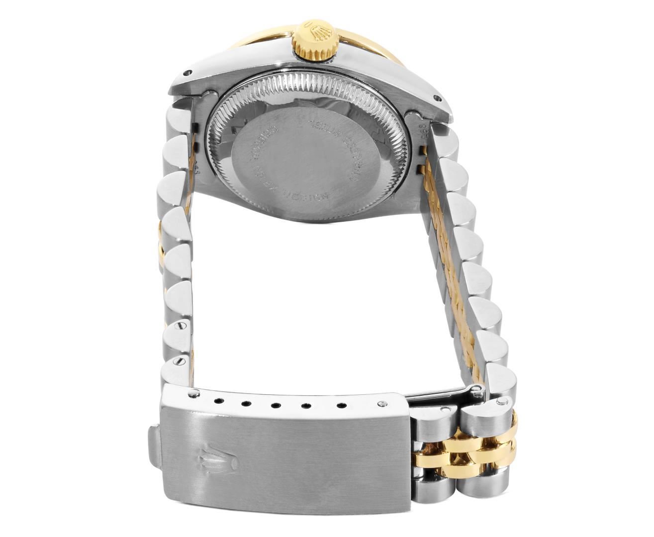 One Rolex Ladies Pre Owned Two Tone 14K Yellow Gold And Stainless Steel Rolex Date Polished, Serviced & Electronically Tested, Rolex Yellow Gold And Stainless Steel Case: 26mm, Rolex Yellow Gold Crown, Custom Bezel: New 18K Yellow Gold Ruby Beadset Diamond Bezel, Diamond + Gem Count: 36 Diamonds + 4 Rubies. Custom Crystal: New Acrylic With Magnifying Date Window. Custom Hands: New Luminescent Hands. Rolex Movement: Automatic Winding Movement 2035. Rolex Factory Dial: Champagne With Index Hour Markers And Dash Track. Date Window: 3 O'Clock Position Date Display, Condition: G-6 Extra Fine. Rolex Bracelet: Two Tone 14K Yellow Gold And Stainless Steel Jubilee Band. Bright Polish And Satin Finish. 6.0 Inch Length, Adjustable. Standard Clasp, With Rolex Logo. This Watch Has Been Serviced Time Tested And Is In Excellent Condition It Is Free Of All Scratches And Dents.