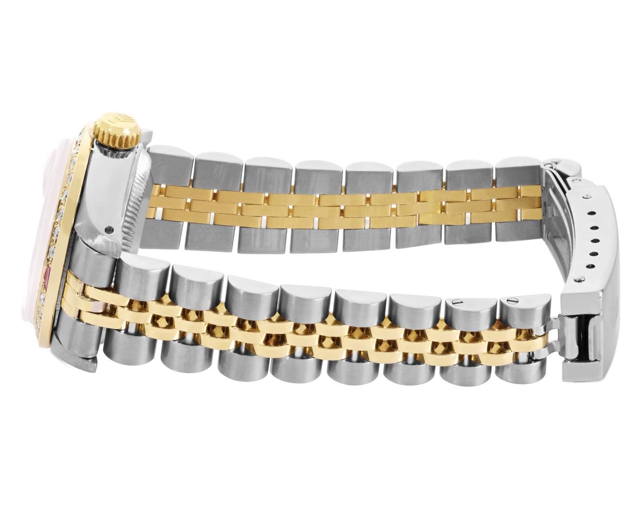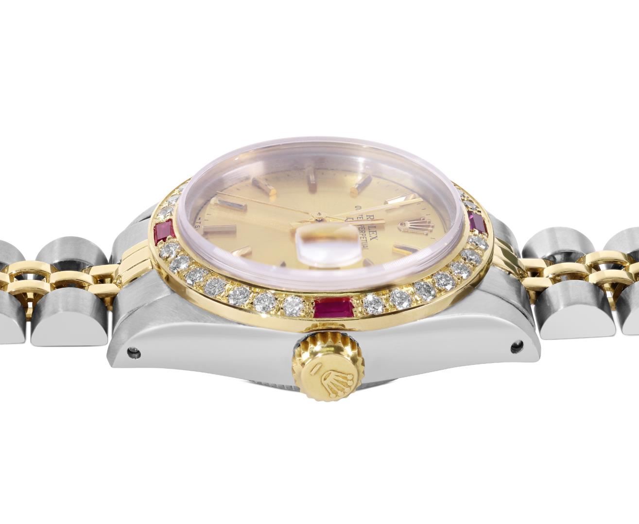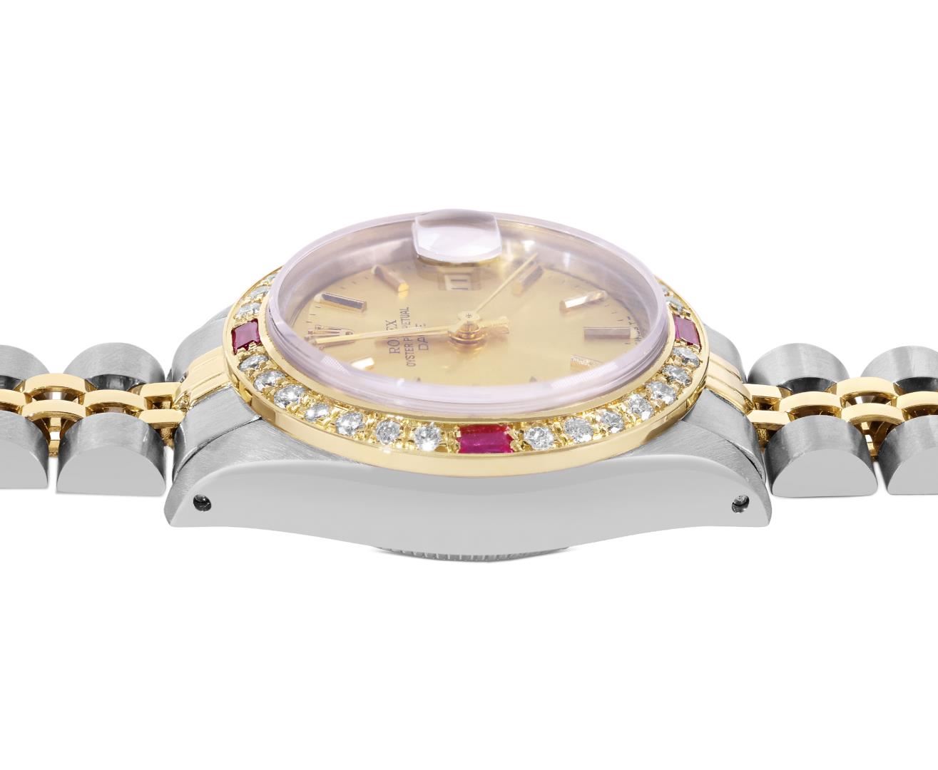 One Rolex Ladies Pre Owned Two Tone 14K Yellow Gold And Stainless Steel Rolex Date Polished, Serviced & Electronically Tested, Rolex Yellow Gold And Stainless Steel Case: 26mm, Rolex Yellow Gold Crown, Custom Bezel: New 18K Yellow Gold Ruby Beadset Diamond Bezel, Diamond + Gem Count: 36 Diamonds + 4 Rubies. Custom Crystal: New Acrylic With Magnifying Date Window. Custom Hands: New Luminescent Hands. Rolex Movement: Automatic Winding Movement 2035. Rolex Factory Dial: Champagne With Index Hour Markers And Dash Track. Date Window: 3 O'Clock Position Date Display, Condition: G-6 Extra Fine. Rolex Bracelet: Two Tone 14K Yellow Gold And Stainless Steel Jubilee Band. Bright Polish And Satin Finish. 6.0 Inch Length, Adjustable. Standard Clasp, With Rolex Logo. This Watch Has Been Serviced Time Tested And Is In Excellent Condition It Is Free Of All Scratches And Dents.