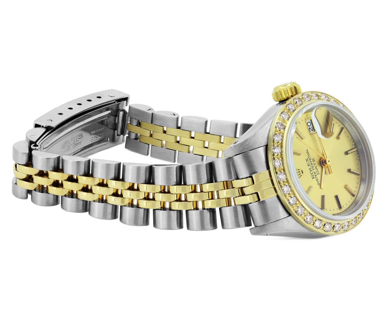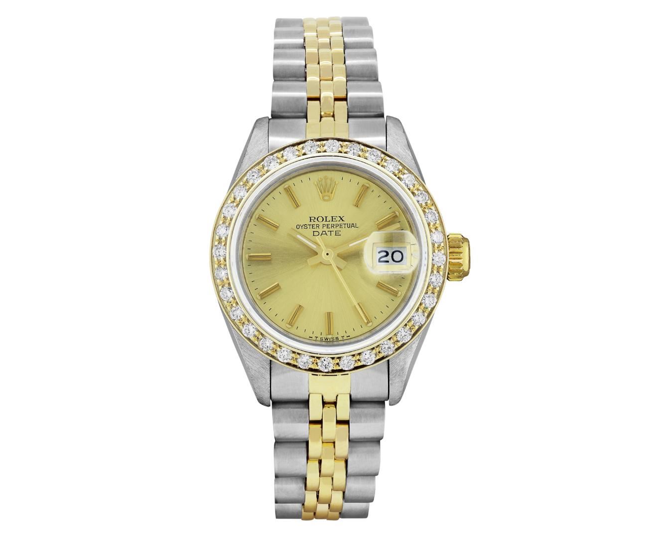 One Rolex Ladies Pre Owned Two Tone Yellow Gold And Stainless Steel Rolex Date Polished, Serviced & Electronically Tested, Rolex Yellow Gold And Stainless Steel Case: 26mm, Rolex Yellow Gold Crown. Custom Bezel: New 18K Yellow Gold Beadset Diamond Bezel, Diamond Count: 32 Diamonds On Bezel. Custom Crystal: Sapphire Crystal With Date Window. Custom Hands: Luminescent Hands. Rolex Movement: Automatic Winding Movement 2035. Rolex Factory Dial: Champagne With Index Hour Markers And Dash Track. Date Window: 3 O'clock Position Date Display, Condition: G-6 Extra Fine. Rolex Bracelet: Two Tone 18K Yellow Gold And Stainless Steel Jubilee Band. Bright Polish & Satin Finish. 6.0 Inch Length, Adjustable. Standard Clasp, With Rolex Logo. This Watch Has Been Serviced Time Tested And Is In Excellent Condition It Is Free Of All Scratches And Dents. This Watch Comes With A Rolex Box.
