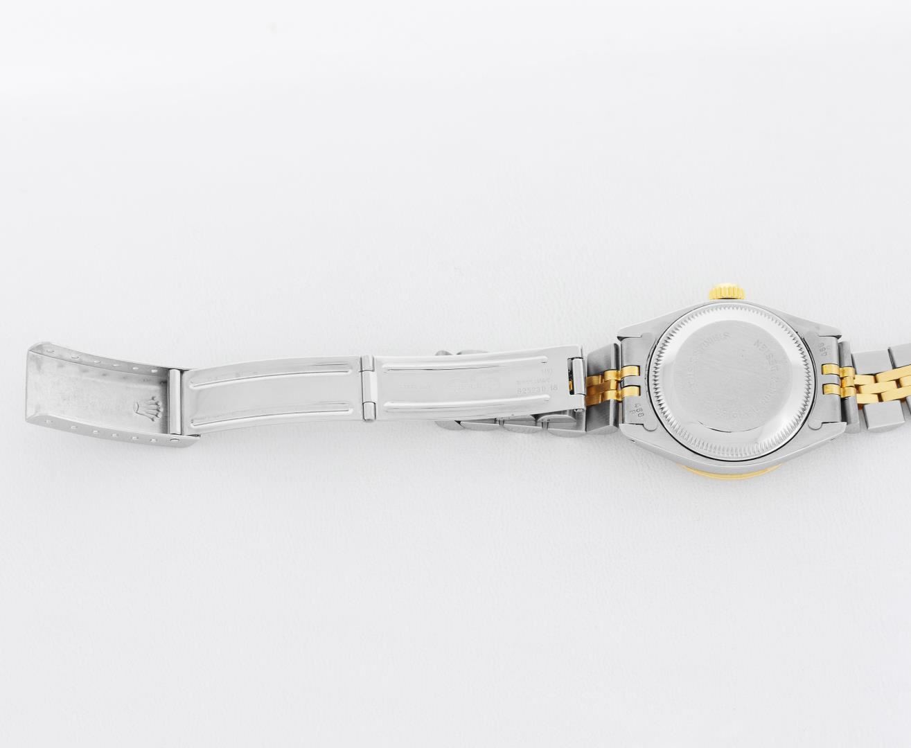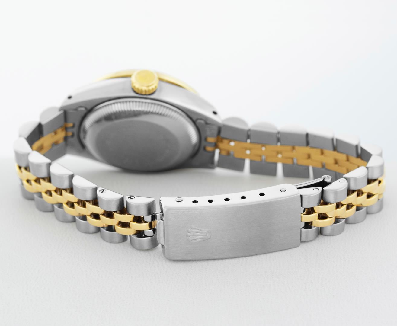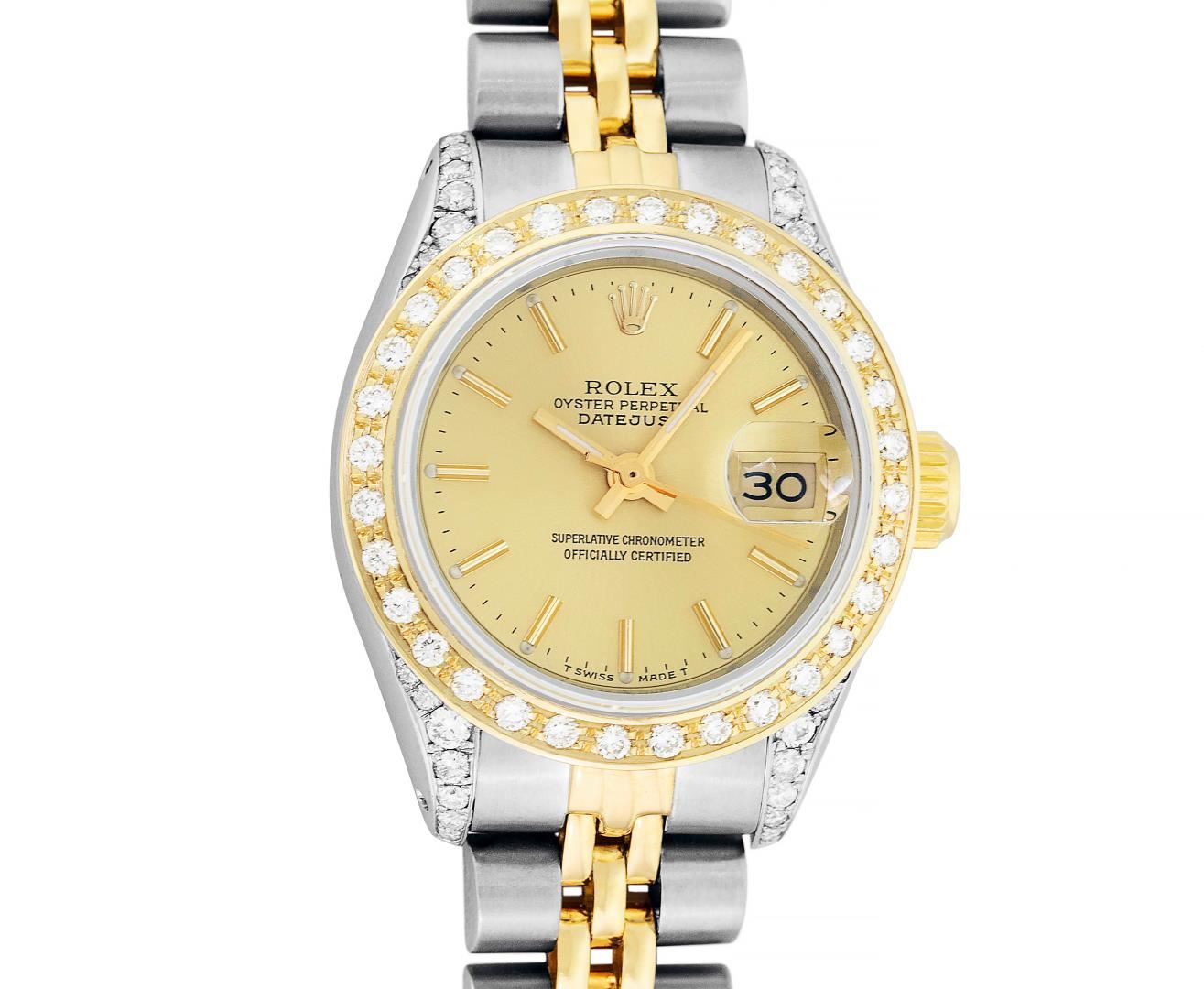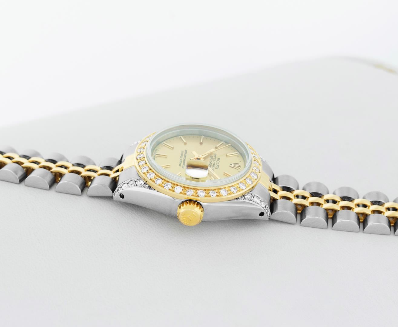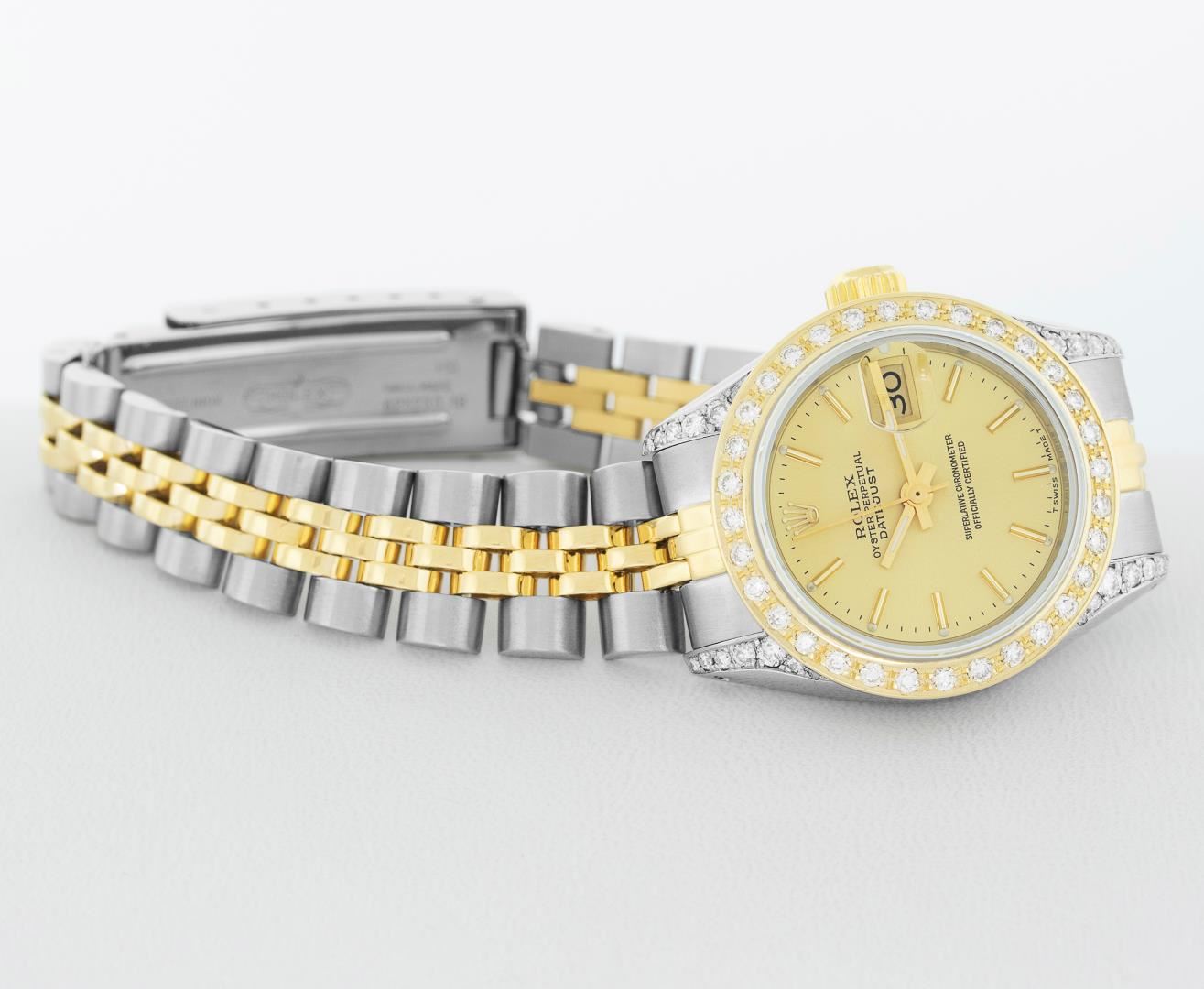 One Pre Owned Quickset Ladies Two Tone 18K Yellow Gold & Stainless Rolex Polished, Serviced & Electronically Tested, Rolex 18K Yellow Gold & Stainless Steel Case: 26mm, Custom Diamond Lugs: Added Diamonds On Lugs, Diamond Count: 24 Diamonds On Lugs. Rolex Yellow Gold Crown, Custom Bezel: New 18K Yellow Gold Diamond Bezel, Diamond Count: 32 Diamonds, Clarity: SI-VS, Color: G to H. Custom Crystal: New Sapphire With Magnified Date Window. Custom Hands: New Gold Hands. Rolex Movement: Automatic Quickset Winding Movement. Rolex Dial: Champagne Index With Lumi Dots And Dash Track. Date Window: 3 O'Clock Position Date Display, Model: Date, Condition: G-6 Extra Fine. Rolex Bracelet: Two Tone 18K Yellow Gold & Stainless Steel Jubilee Band. Bright Polish. 6.0 Inch Length, Adjustable. Standard Clasp, With Rolex Logo. This Watch Has Been Serviced Time Tested And Is In Excellent Condition It Is Free Of All Scratches And Dents.