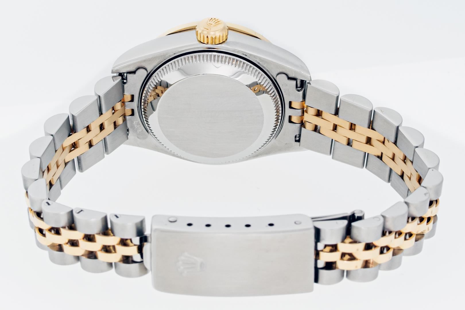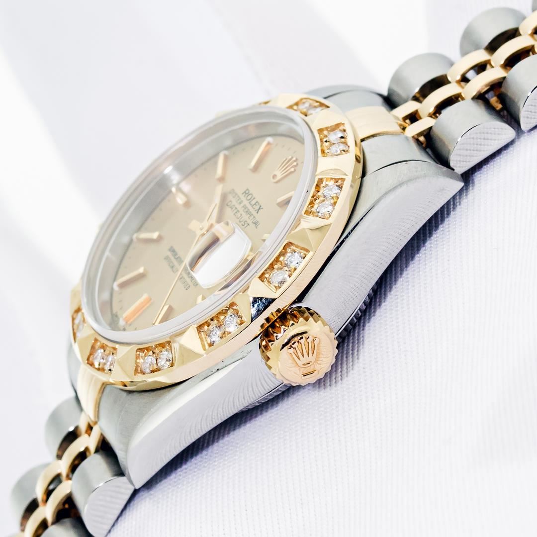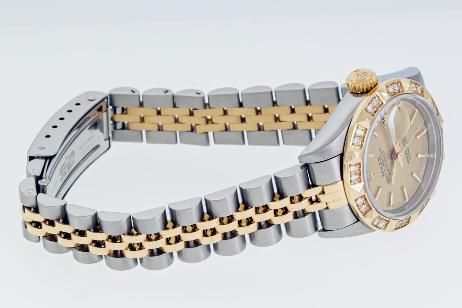 Rolex Ladies Pre Owned Sapphire Quickset 18K Yellow Gold and Stainless Steel Two Tone Datejust Polished Bright with Satin Finish, Serviced & Electronically Tested, Rolex Stainless Steel Case: 26mm, Rolex 18K Yellow Gold Crown, Custom Bezel: New Pyramid Diamond Bezel, Diamond Count: 24 Diamonds On Bezel. Custom Crystal: New Sapphire With Magnified Date Window. Custom Hands: New Hands. Rolex Movement: Automatic Winding Movement 2235. Rolex Dial: Champagne With Index Hour Markers And Dash Track. Date Window: 3 O'Clock Position Date Display, Model: Quickset Datejust, Condition: G-6 Extra Fine. Rolex Bracelet: 18K Yellow Gold & Stainless Steel Jubilee Band. Bright Polish & Satin Finish. 6.0 Inch Length, Adjustable. Standard Clasp, With Rolex Logo. This Watch Has Been Serviced Time Tested And Is In Excellent Condition It Is Free Of All Scratches And Dents.