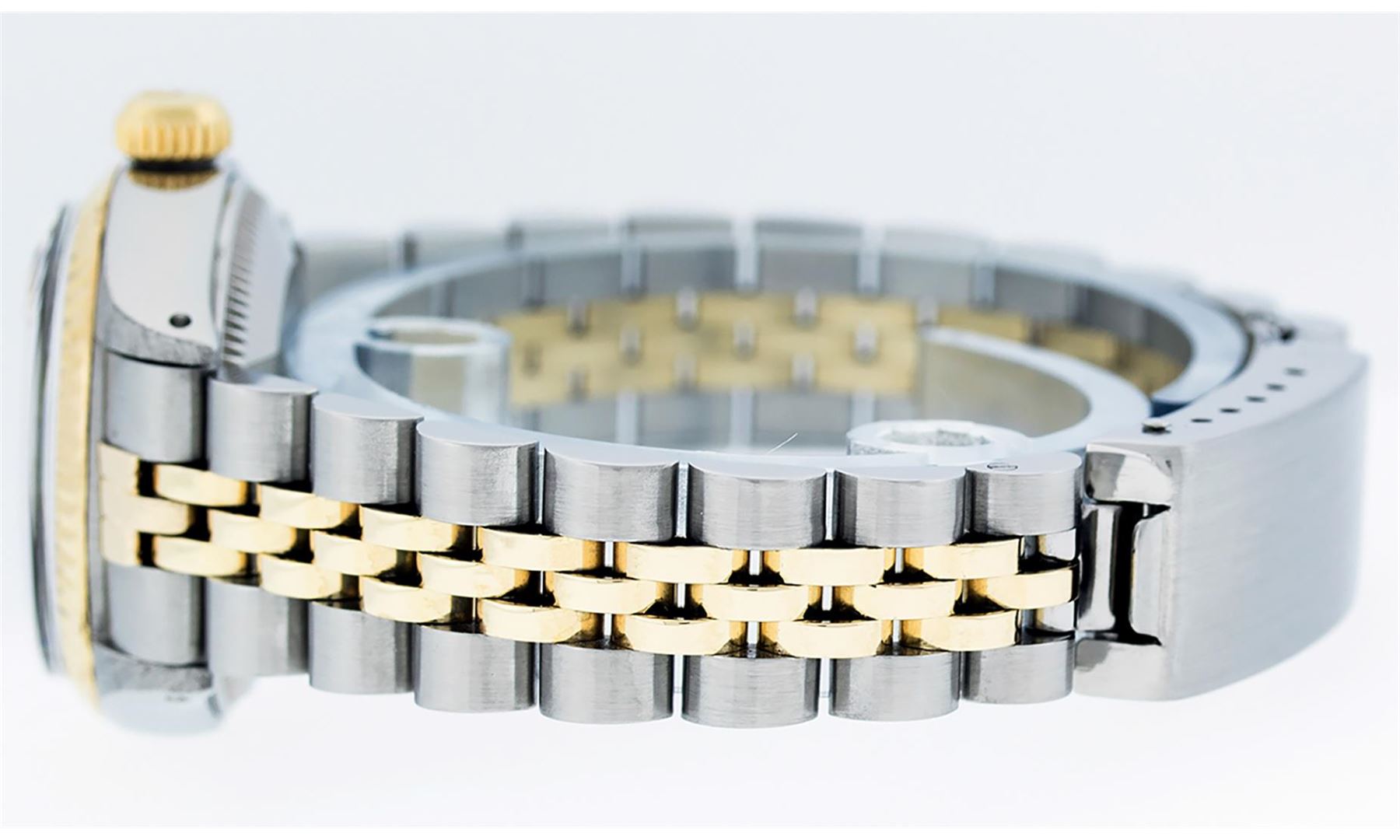 One Ladies Pre Owned Two Tone Rolex Datejust Polished, Serviced & Electronically Tested, Rolex Yellow Gold & Stainless Steel Case: 26mm, Rolex Yellow Gold Crown, Rolex Bezel: Yellow Gold Fluted Bezel. Custom Crystal: New Acrylic Cyclops Lens. Custom Hands