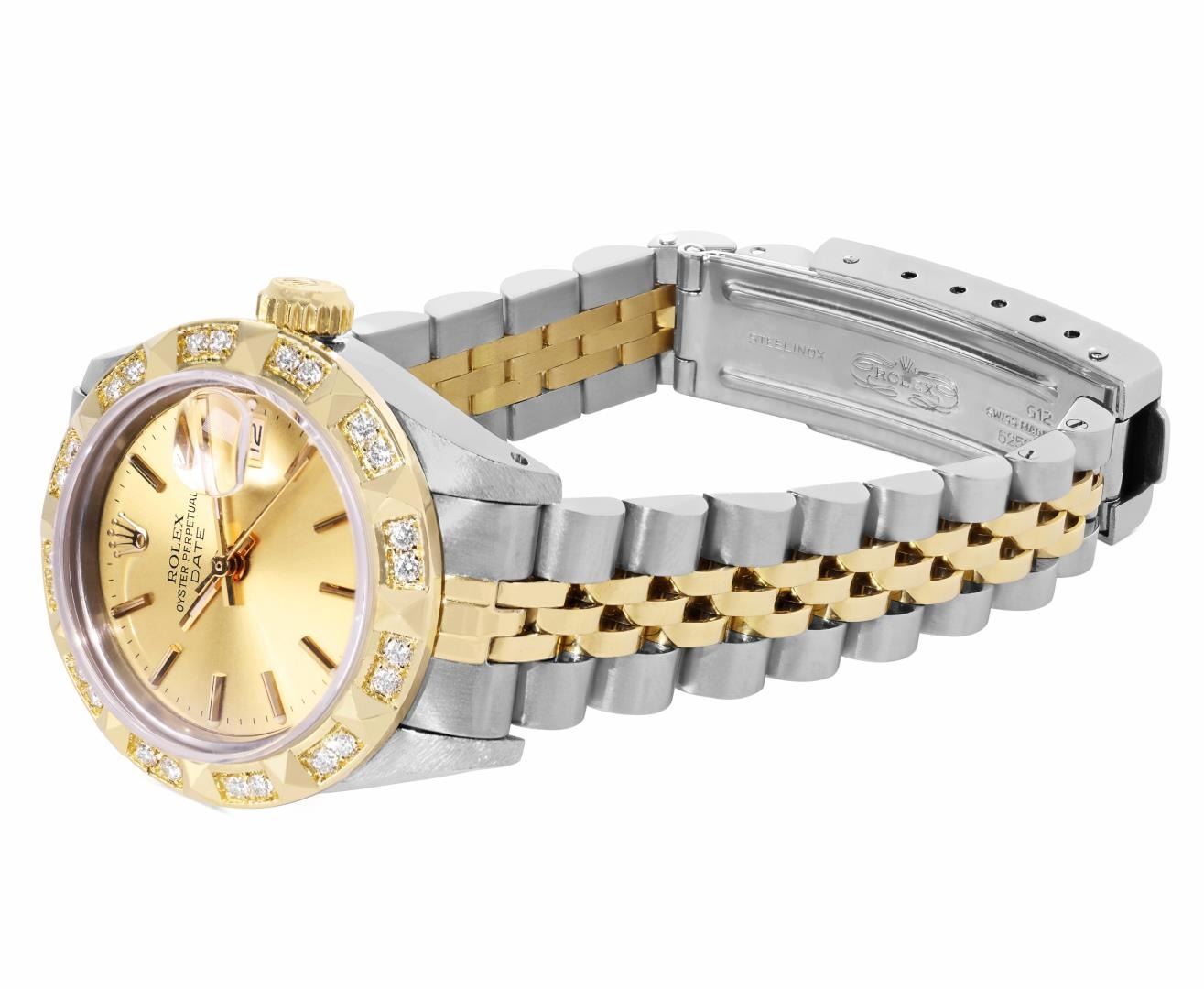 One Rolex Ladies Pre Owned Two Tone 14K Yellow Gold And Stainless Steel Rolex Date Polished, Serviced And Electronically Tested, Rolex Yellow Gold And Stainless Steel Case: 26mm, Rolex Yellow Gold Crown. Custom Bezel: New 18K Yellow Gold Pyramid Diamond Bezel, Diamond Count: 24 Diamonds On Bezel. Custom Crystal: New Sapphire Crystal With Date Window. Custom Hands: New Luminescent Hands. Rolex Movement: Automatic Winding Movement 2035. Rolex Factory Dial: Champagne With Index Hour Markers, Dash Track, and Lumi Dots. Date Window: 3 O'Clock Position Date Display, Condition: G-6 Extra Fine. Rolex Bracelet: Two Tone 14K Yellow Gold And Stainless Steel Jubilee Band. Bright Polish & Satin Finish. 6.0 Inch Length, Adjustable. Standard Clasp, With Rolex Logo. This Watch Has Been Serviced Time Tested And Is In Excellent Condition It Is Free Of All Scratches And Dents. This Watch Comes With A Rolex Box.