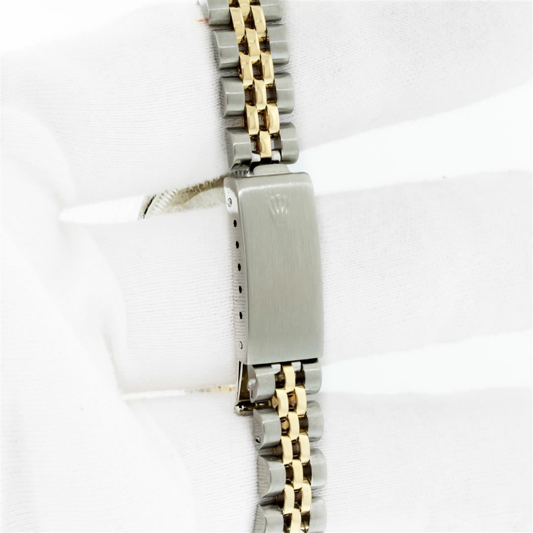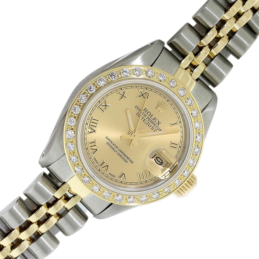 One Pre Owned Ladies Two Tone Rolex Datejust Polished, Serviced & Electronically Tested, Rolex Yellow Gold & Stainless Steel Case: 26mm, Rolex Yellow Gold Crown, Custom Bezel: New 18K Yellow Gold Diamond Bezel, Diamond Count: 32 Diamonds, Clarity: SI-VS, Color: G to H. Custom Crystal: New Scratch Resistant Synthetic Sapphire Cyclops Lens. Custom Hands: New Gold Hands. Rolex Movement: Automatic Winding Movement. Rolex Dial: Champagne Roman With Square Track. Date Window: 3 O'Clock Position Date Display, Model: Datejust, Condition: G-6 Extra Fine. Rolex Bracelet: Two Tone Yellow Gold & Stainless Steel Jubilee Band. Bright Polish. 6.0 Inch Length, Adjustable. Standard Clasp, With Rolex Logo. This Watch Has Been Serviced Time Tested And Is In Excellent Condition It Is Free Of All Scratches And Dents.