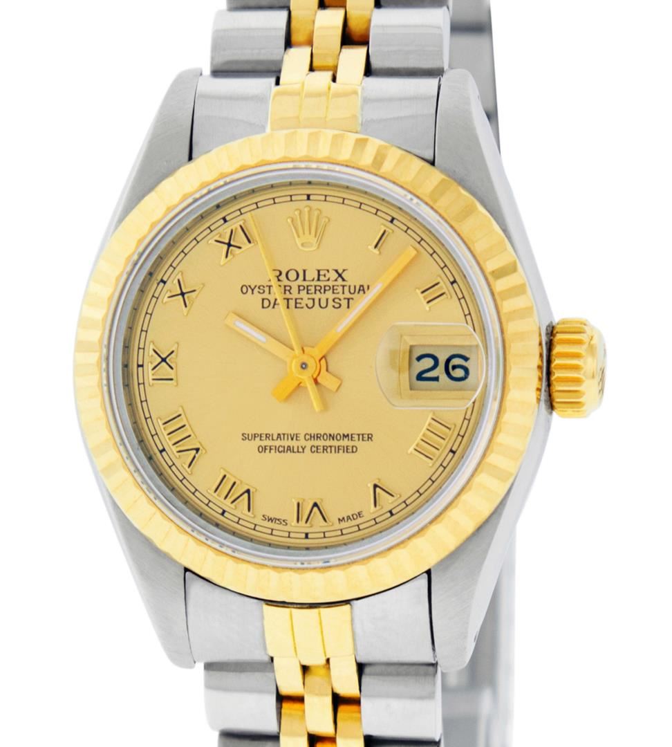 One Ladies Pre Owned Two Tone 14K Yellow Gold & Stainless Steel Rolex Polished, Serviced & Electronically Tested, Rolex Yellow Gold & Stainless Steel Case: 26mm, Rolex Yellow Gold Crown, Rolex Bezel: 14K Yellow Gold Fluted Bezel. Custom Crystal: New Plexiglass With Date Window. Hands: Luminescent Hands. Rolex Movement: Automatic Winding Movement 2030. Rolex Dial: Champagne Roman With Square Track. Date Window: 3 O'Clock Position Date Display, Model: Datejust. Condition: G-6 Extra Fine. Rolex Bracelet: Two Tone 14K Yellow Gold & Stainless Steel Jubilee Band. Bright Polish. 6.0 Inch Length, Adjustable. Standard Clasp, With Rolex Logo. This Watch Has Been Serviced Time Tested And Is In Excellent Condition It Is Free Of All Scratches And Dents.