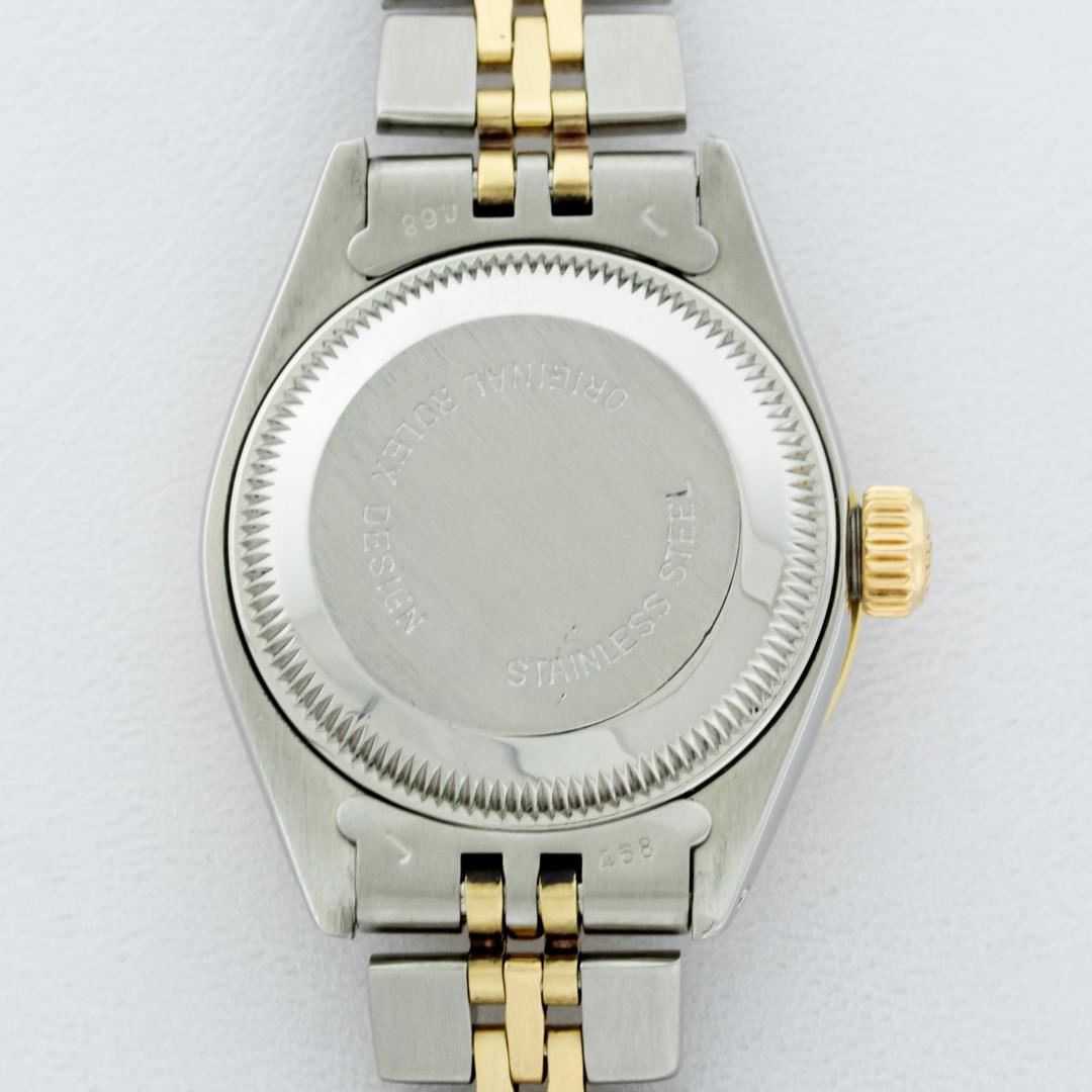 One Pre Owned Ladies Two Tone 14K Yellow Gold & Stainless Rolex Polished, Serviced & Electronically Tested, Rolex 14K Yellow Gold & Stainless Steel Case: 26mm, Rolex Yellow Gold Crown, Custom Bezel: New 18K Yellow Gold Diamond Bezel, Diamond Count: 32 Diamonds, Clarity: SI-VS, Color: G to H. Custom Crystal: New Sapphire With Magnified Date Window. Custom Hands: New Gold Hands. Rolex Movement: Automatic Winding Movement 2030. Rolex Dial: Champagne Roman With Square Track. Date Window: 3 O'Clock Position Date Display, Model: Date, Condition: G-6 Extra Fine. Rolex Bracelet: Two Tone 14K Yellow Gold & Stainless Steel Jubilee Band. Bright Polish. 6.0 Inch Length, Adjustable. Standard Clasp, With Rolex Logo. This Watch Has Been Serviced Time Tested And Is In Excellent Condition It Is Free Of All Scratches And Dents.