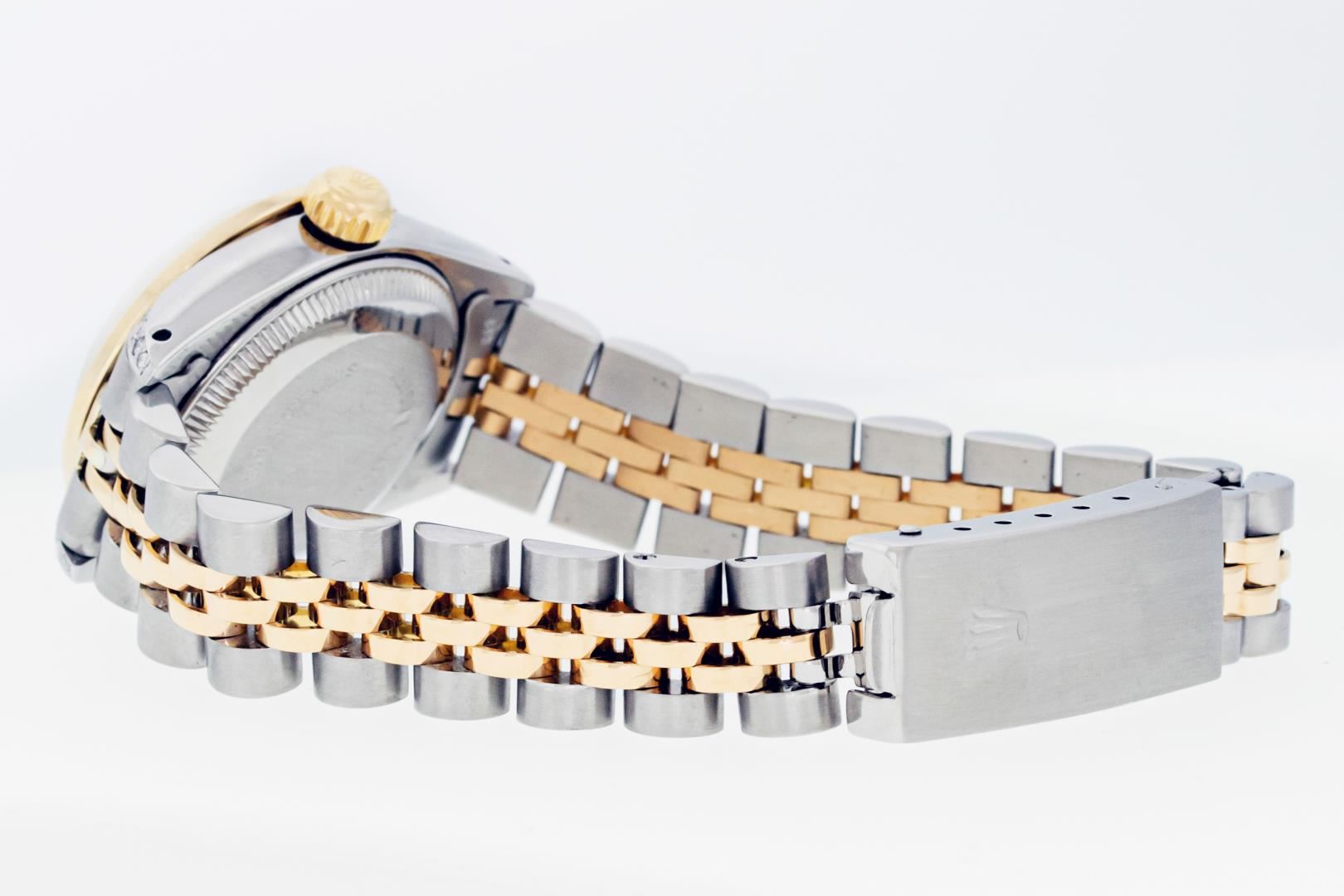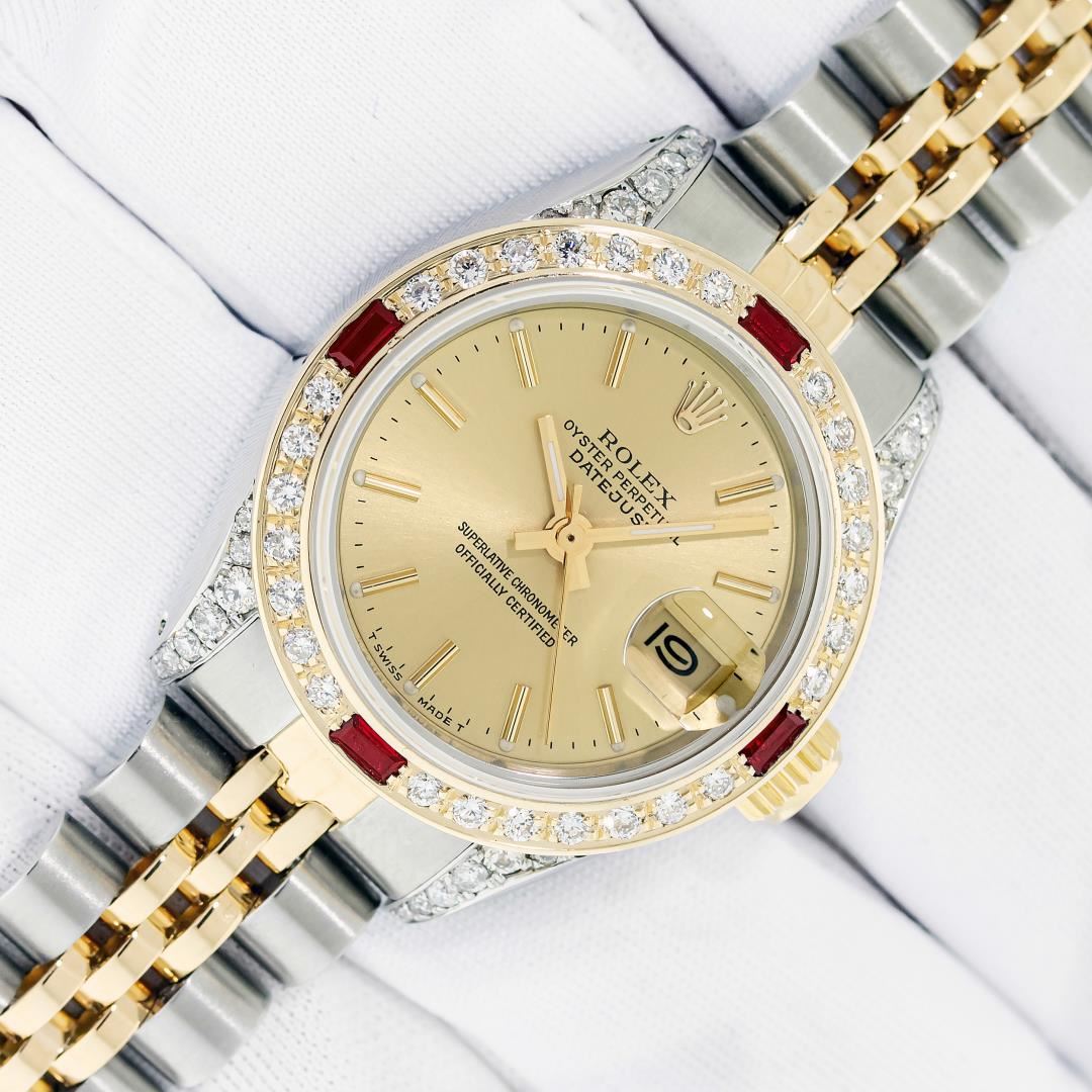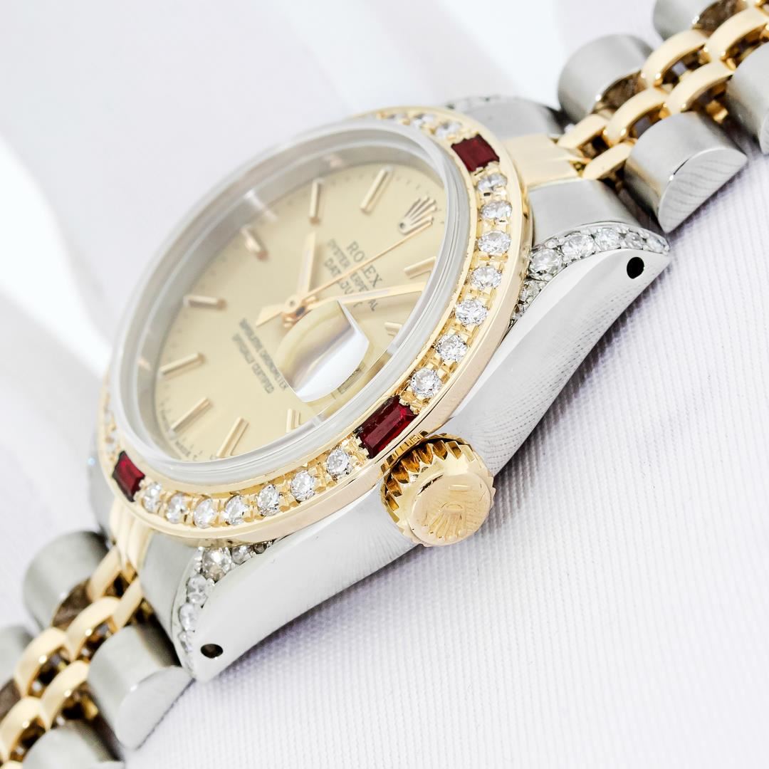 Rolex Ladies Pre Owned Quickset 18K Yellow Gold and Stainless Steel Two Tone Wristwatch Polished Bright with Satin Finish, Serviced & Electronically Tested, Rolex Stainless Steel Case: 26mm, Custom Diamond Lugs: Added Diamonds On Lugs, Diamond Count: 24 Diamonds On Lugs, Color: G To H, Clarity: SI-VS. Rolex Yellow Gold Crown, Custom Bezel: New 18K Yellow Gold Beadset And Ruby Diamond Bezel, Stone Count: 28 Diamonds + 4 Rubies On Bezel. Custom Crystal: New Sapphire With Magnified Date Window. Custom Hands: New Hands. Rolex Movement: Automatic Winding Movement. Rolex Dial: Champagne Dial With Dash Track & Lumi Dots, Date Window: 3 O'Clock Position Date Display, Model: Quickset Datejust, Condition: G-6 Extra Fine. Rolex Bracelet: Stainless Steel and 18K Yellow Gold Jubilee Band. Bright Polish & Satin Finish. 6.0 Inch Length, Adjustable. Standard Clasp, With Rolex Logo. This Watch Has Been Serviced Time Tested And Is In Excellent Condition It Is Free Of All Scratches And Dents.
