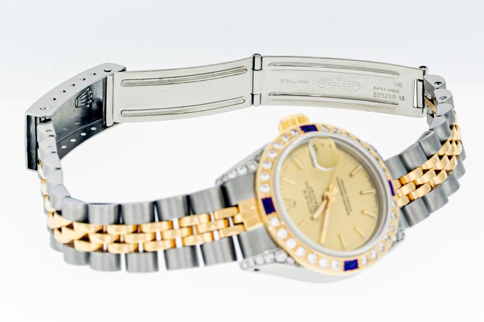 Rolex Ladies Pre Owned Quickset 18K Yellow Gold and Stainless Steel Two Tone Wristwatch Polished Bright with Satin Finish, Serviced & Electronically Tested, Rolex Stainless Steel Case: 26mm, Custom Diamond Lugs: Added Diamonds On Lugs, Diamond Count: 24 Diamonds On Lugs, Color: G To H, Clarity: SI-VS. Rolex Yellow Gold Crown, Custom Bezel: New 18K Yellow Gold Beadset And Sapphire Diamond Bezel, Stone Count: 28 Diamonds + 4 Sapphires On Bezel. Custom Crystal: New Sapphire With Magnified Date Window. Custom Hands: New Hands. Rolex Movement: Automatic Winding Movement. Rolex Dial: Champagne Dial With Dash Track & Lumi Dots, Date Window: 3 O'Clock Position Date Display, Model: Quickset Datejust, Condition: G-6 Extra Fine. Rolex Bracelet: Stainless Steel and 18K Yellow Gold Jubilee Band. Bright Polish & Satin Finish. 6.0 Inch Length, Adjustable. Standard Clasp, With Rolex Logo. This Watch Has Been Serviced Time Tested And Is In Excellent Condition It Is Free Of All Scratches And Dents.