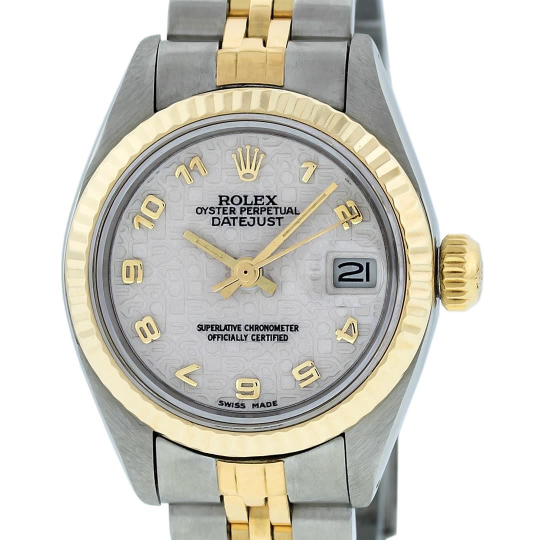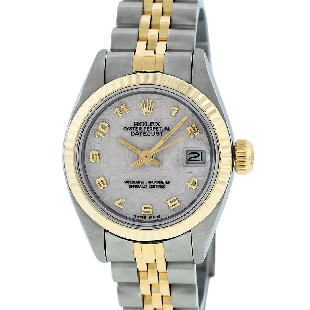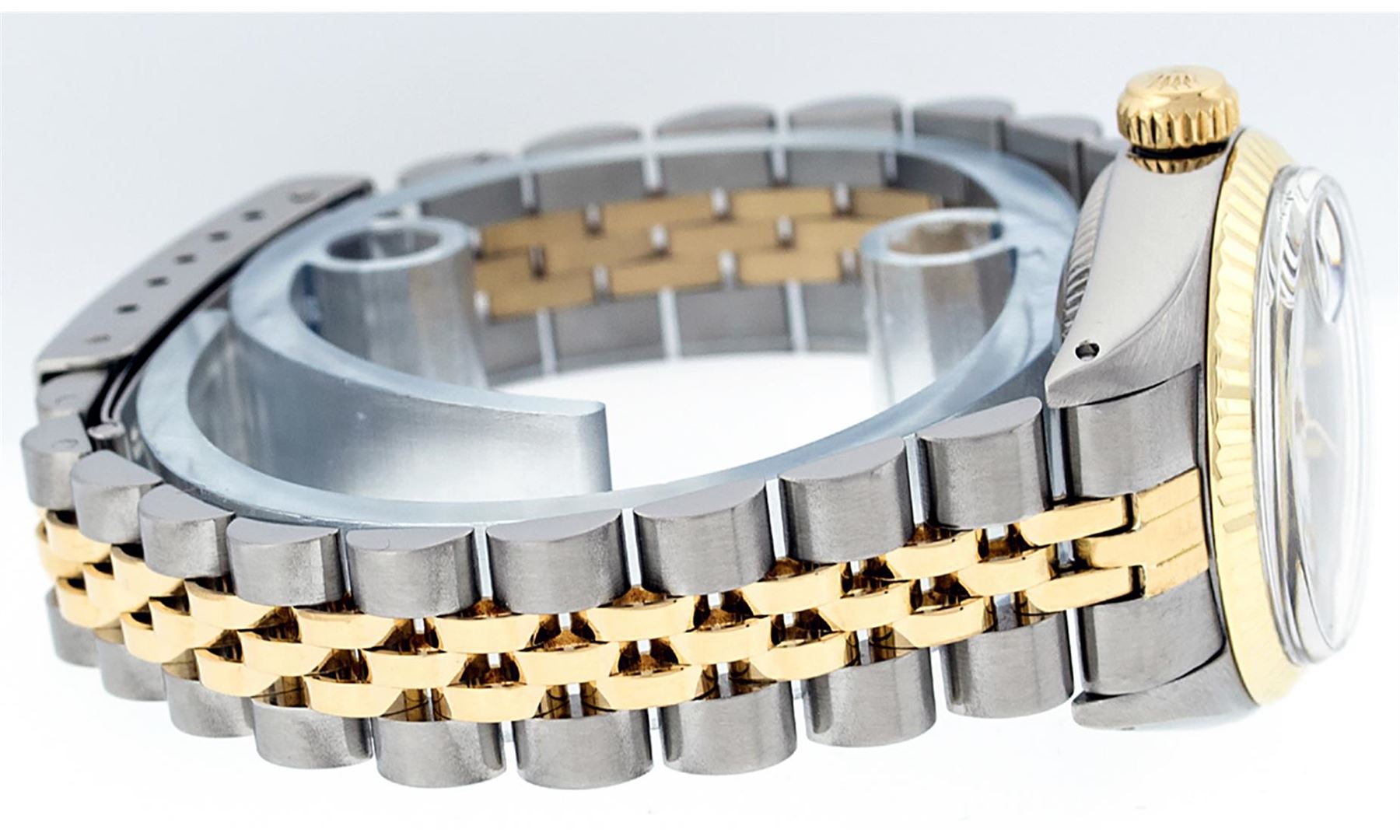 One Ladies Yellow Gold & Stainless Steel Two Tone Rolex Datejust Polished, Serviced & Electronically Tested, Yellow Gold & Stainless Steel Case: 26mm, Yellow Gold Crown, Bezel: Yellow Gold Fluted Bezel. Custom Crystal: New With Cyclops Lens. Hands: Lumine