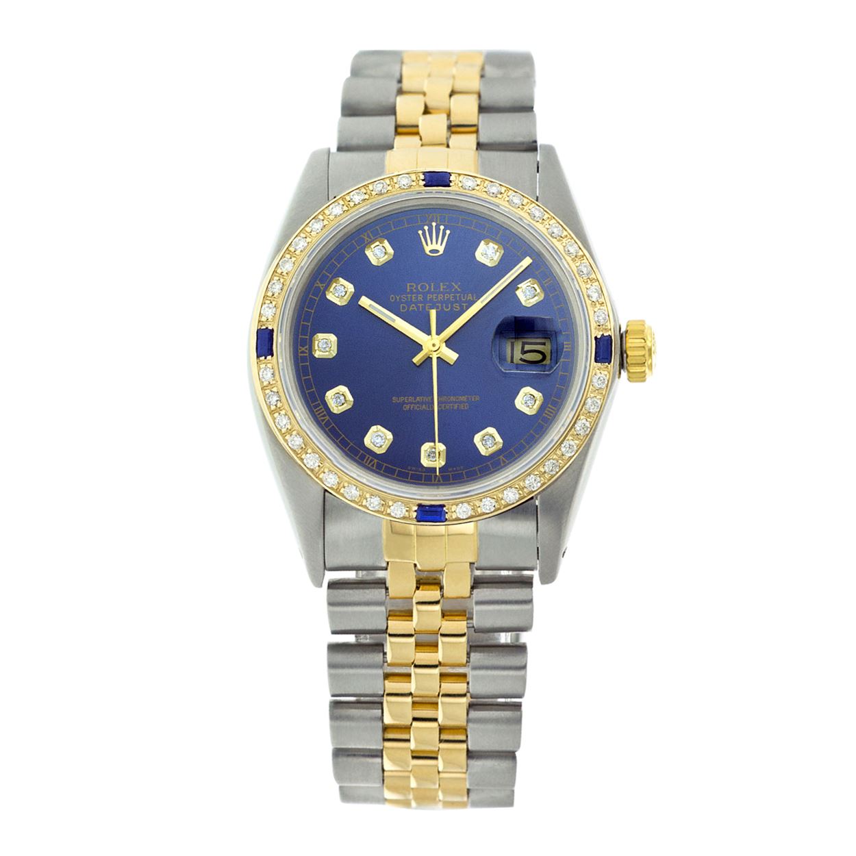 WATCH DETAILS: ITEM: WatchBRAND: RolexTYPE: Two ToneFEATURE: MODEL: DateJustMADE: Swiss MadeGENDER: LadiesCONDITION: Pre-OwnedFUNCTION: DateDIAL COLOR: BlueHOUR MARKERS: 10 Round Custom Made DiamondBEZEL TYPE: Custom Made Diamond & Sapphire BezelBEZEL STONE: Diamond 1 CTW G-VVS1 & Ceylon Blue SapphireBEZEL MATERIAL: 18K GoldBRACELET TYPE: Jubilee BRACELET MATERIAL: 14K Yellow Gold & Stainless SteelCLASP TYPE: Folding ClaspCLASP MATERIAL: Stainless SteelCASE STONE: CASE SIZE: 26mmCRYSTAL: Scratch Resistance Sapphire CrystalMOVEMENT: Automatic (Self Winding)CALIBER: 2030CROWN TYPE: Screw Down CrownWATER RESISTANCE: Waterproof to 10 ATM/100 meters/330 feetMODEL #: 6917SKU #: ALTJNS178We Buy/Sell/Trade Valuable watches, Please call us