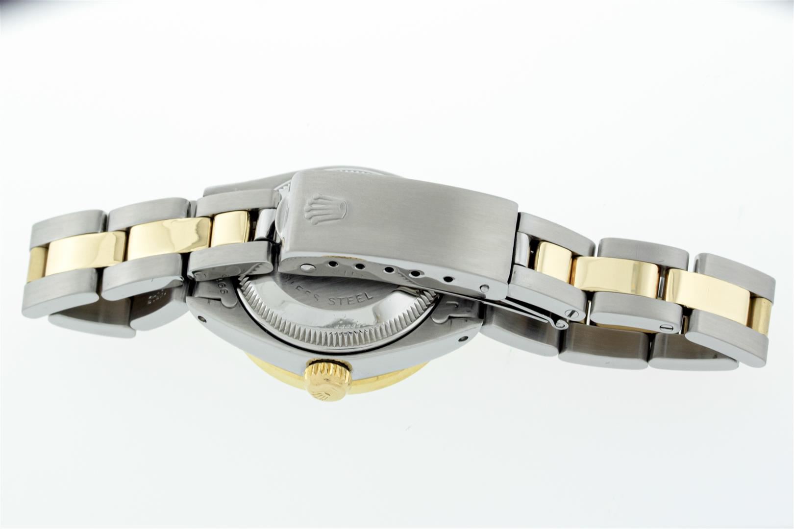 One Ladies Two Tone Rolex Datejust Polished. Serviced & Electronically Tested, Rolex Yellow Gold & Stainless Steel Case: 26mm, Rolex Yellow Gold Crown, Custom Bezel: New 18K Yellow Gold Diamond Bezel, Diamond Count: 24 Diamonds, Clarity: SI-VS, Color: G to H. Custom Crystal: New Sapphire With Magnified Date Window. Custom Hands: New Gold Hands. Rolex Movement: Automatic Winding Movement. Custom Dial: Refinished To Green With Custom Added Diamonds On Dial, Diamond Count: 10 Diamonds On Dial, G To H In Color, VS Clarity. Date Window: 3 O'clock Position Date Display, Model: Datejust, Condition: G-6 Extra Fine. Rolex Bracelet: Two Tone Yellow Gold & Stainless Steel Oyster Band. Bright Polish. 6.0 Inch Length, Adjustable. Standard Clasp, With Rolex Logo. This Pre Owned Watch Has Been Serviced Time Tested And Is In Excellent Condition It Is Free Of All Scratches And Dents. This Watch Comes With A Rolex Box.