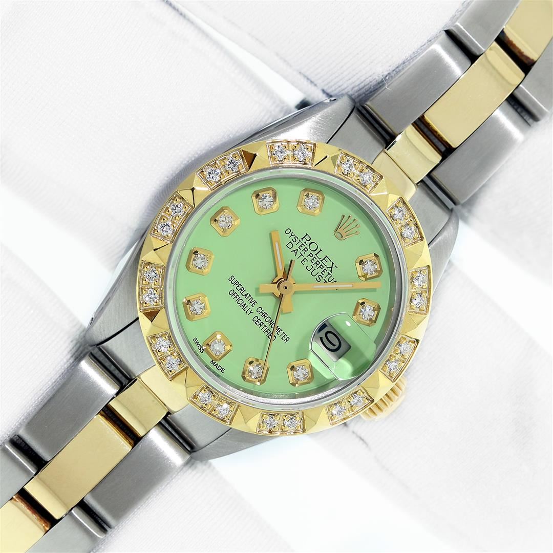 One Ladies Two Tone Rolex Datejust Polished. Serviced & Electronically Tested, Rolex Yellow Gold & Stainless Steel Case: 26mm, Rolex Yellow Gold Crown, Custom Bezel: New 18K Yellow Gold Diamond Bezel, Diamond Count: 24 Diamonds, Clarity: SI-VS, Color: G to H. Custom Crystal: New Sapphire With Magnified Date Window. Custom Hands: New Gold Hands. Rolex Movement: Automatic Winding Movement. Custom Dial: Refinished To Green With Custom Added Diamonds On Dial, Diamond Count: 10 Diamonds On Dial, G To H In Color, VS Clarity. Date Window: 3 O'clock Position Date Display, Model: Datejust, Condition: G-6 Extra Fine. Rolex Bracelet: Two Tone Yellow Gold & Stainless Steel Oyster Band. Bright Polish. 6.0 Inch Length, Adjustable. Standard Clasp, With Rolex Logo. This Pre Owned Watch Has Been Serviced Time Tested And Is In Excellent Condition It Is Free Of All Scratches And Dents. This Watch Comes With A Rolex Box.