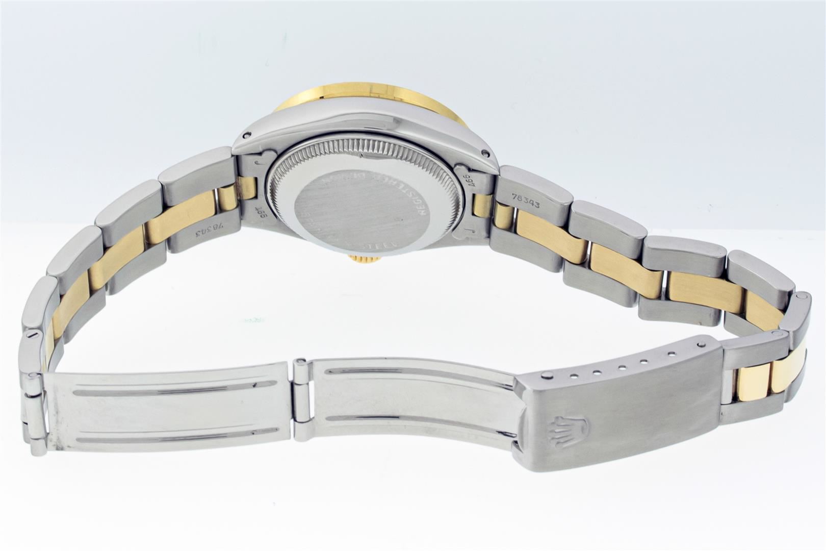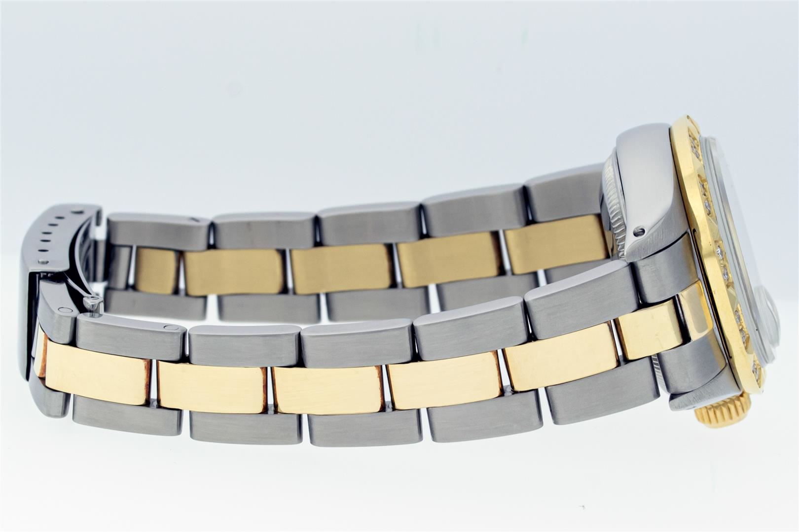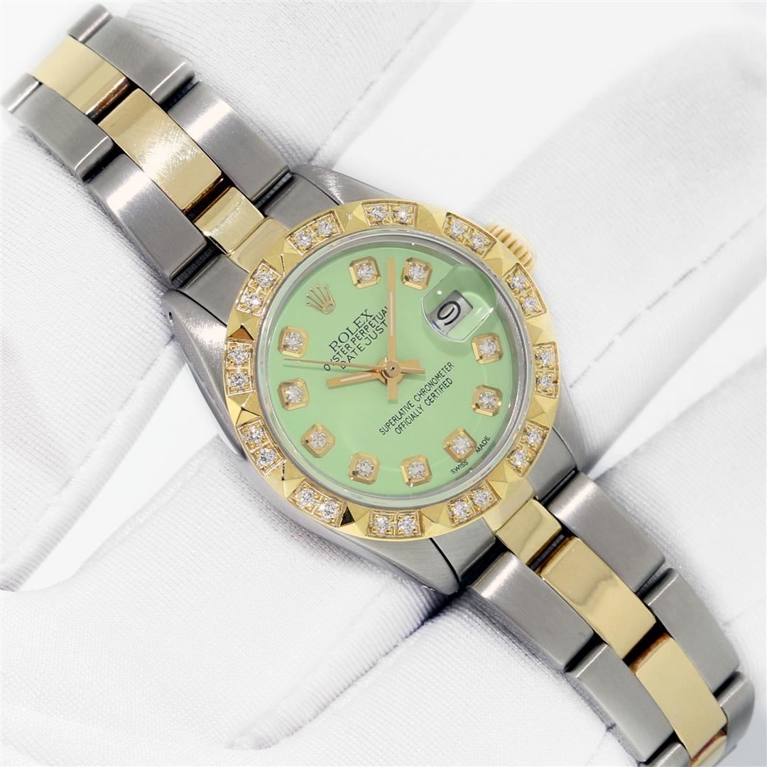 One Ladies Two Tone Rolex Datejust Polished. Serviced & Electronically Tested, Rolex Yellow Gold & Stainless Steel Case: 26mm, Rolex Yellow Gold Crown, Custom Bezel: New 18K Yellow Gold Diamond Bezel, Diamond Count: 24 Diamonds, Clarity: SI-VS, Color: G to H. Custom Crystal: New Sapphire With Magnified Date Window. Custom Hands: New Gold Hands. Rolex Movement: Automatic Winding Movement. Custom Dial: Refinished To Green With Custom Added Diamonds On Dial, Diamond Count: 10 Diamonds On Dial, G To H In Color, VS Clarity. Date Window: 3 O'clock Position Date Display, Model: Datejust, Condition: G-6 Extra Fine. Rolex Bracelet: Two Tone Yellow Gold & Stainless Steel Oyster Band. Bright Polish. 6.0 Inch Length, Adjustable. Standard Clasp, With Rolex Logo. This Pre Owned Watch Has Been Serviced Time Tested And Is In Excellent Condition It Is Free Of All Scratches And Dents. This Watch Comes With A Rolex Box.