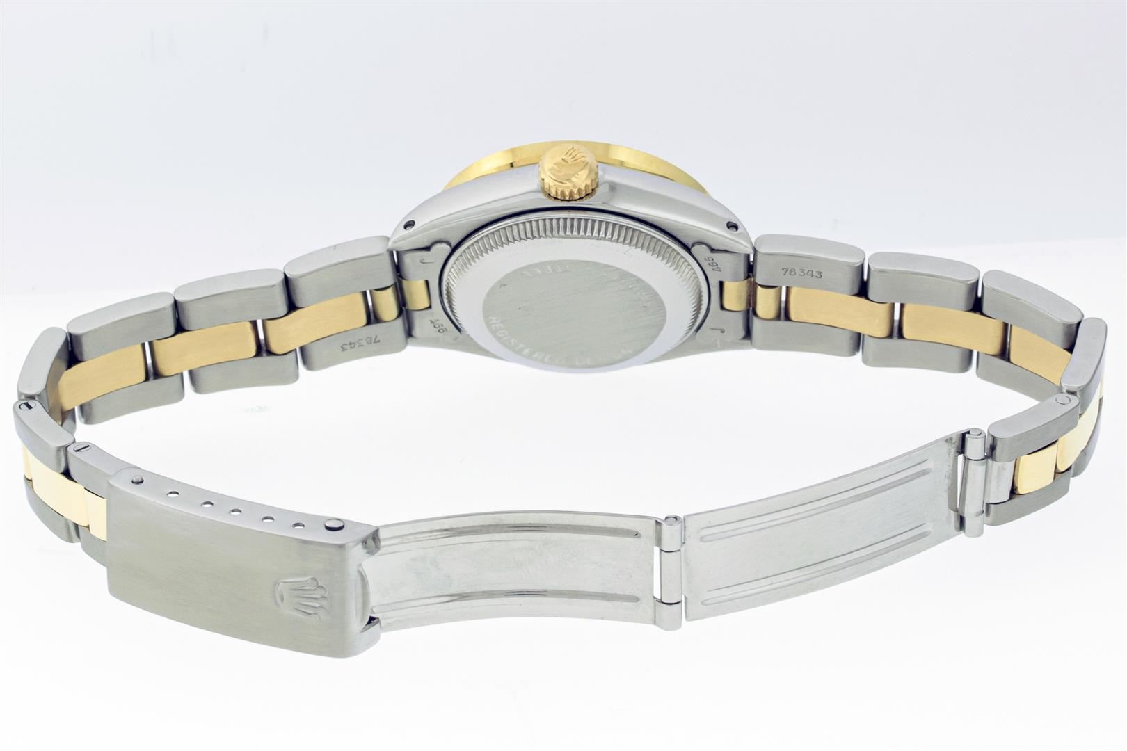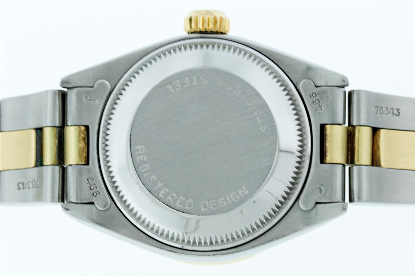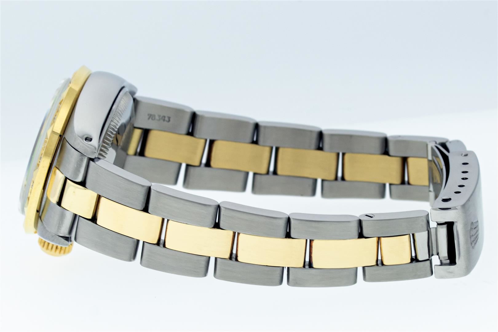 One Ladies Two Tone Rolex Datejust Polished. Serviced & Electronically Tested, Rolex Yellow Gold & Stainless Steel Case: 26mm, Rolex Yellow Gold Crown, Custom Bezel: New 18K Yellow Gold Diamond Bezel, Diamond Count: 24 Diamonds, Clarity: SI-VS, Color: G to H. Custom Crystal: New Sapphire With Magnified Date Window. Custom Hands: New Gold Hands. Rolex Movement: Automatic Winding Movement. Custom Dial: Refinished To Green With Custom Added Diamonds On Dial, Diamond Count: 10 Diamonds On Dial, G To H In Color, VS Clarity. Date Window: 3 O'clock Position Date Display, Model: Datejust, Condition: G-6 Extra Fine. Rolex Bracelet: Two Tone Yellow Gold & Stainless Steel Oyster Band. Bright Polish. 6.0 Inch Length, Adjustable. Standard Clasp, With Rolex Logo. This Pre Owned Watch Has Been Serviced Time Tested And Is In Excellent Condition It Is Free Of All Scratches And Dents. This Watch Comes With A Rolex Box.