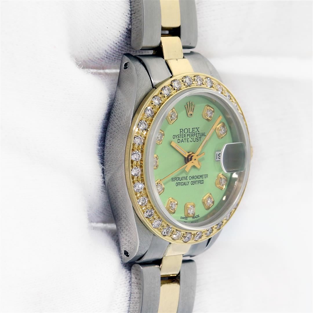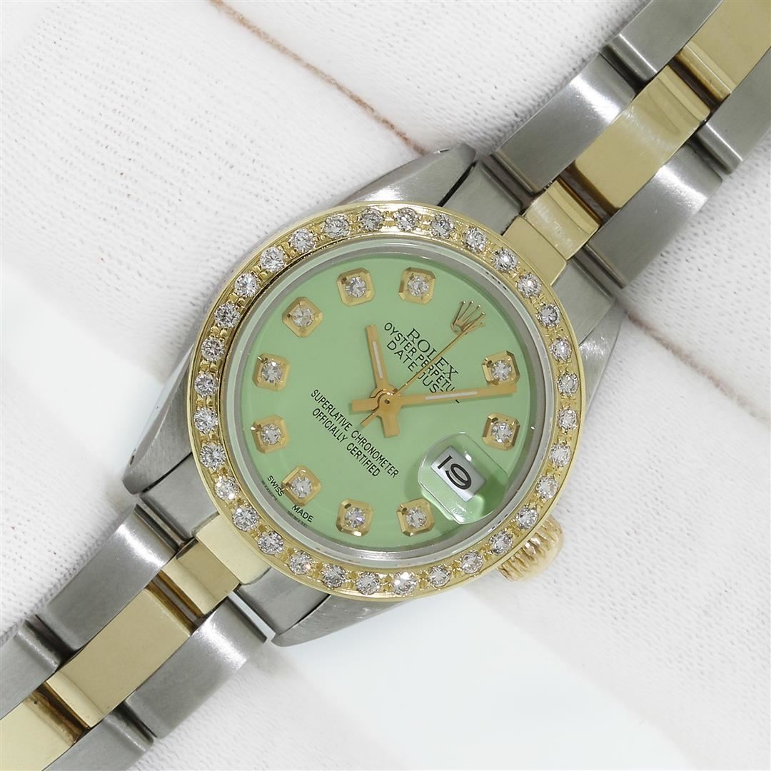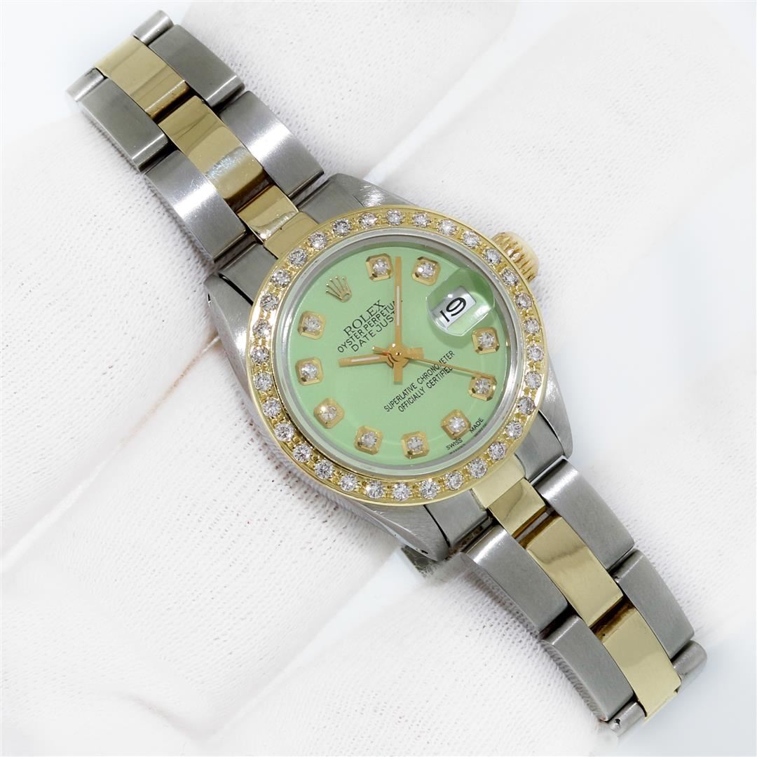 One Ladies Two Tone Rolex Datejust Polished, Serviced & Electronically Tested, Rolex Yellow Gold & Stainless Steel Case: 26mm, Rolex Yellow Gold Crown, Custom Bezel: New 18K Yellow Gold Diamond Bezel, Diamond Count: 32 Diamonds, Clarity: SI-VS, Color: G to H. Custom Crystal: New Sapphire With Magnified Date Window. Custom Hands: New Gold Hands. Rolex Movement: Automatic Winding Movement. Custom Dial: Refinished Green With Added Diamonds On Dial, Diamond Count: 10 Diamonds On Dial, G To H In Color, VS Clarity. Date Window: 3 O'clock Position Date Display, Model: Datejust, Condition: G-6 Extra Fine. Rolex Bracelet: Two Tone Yellow Gold & Stainless Steel Oyster Band. Bright Polish. 6.0 Inch Length, Adjustable. Standard Clasp, With Rolex Logo. This Pre Owned Watch Has Been Serviced Time Tested And Is In Excellent Condition It Is Free Of All Scratches And Dents.