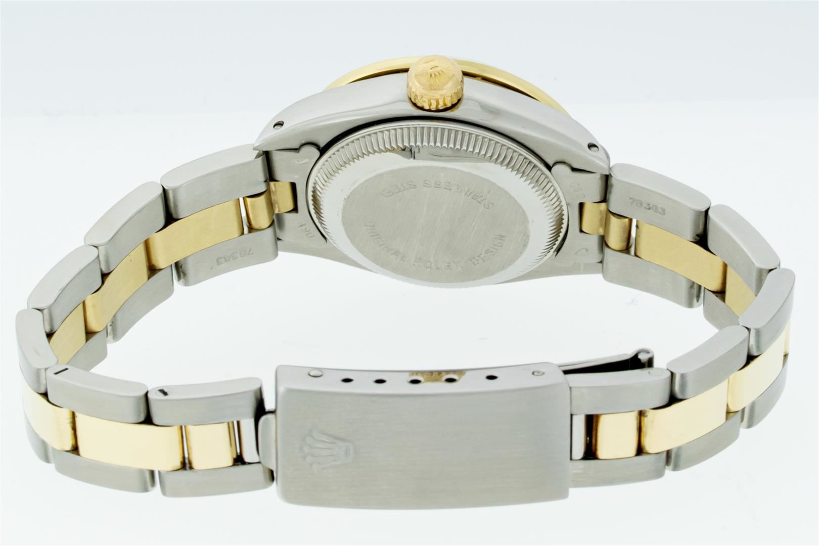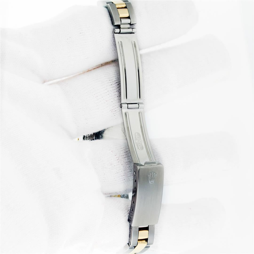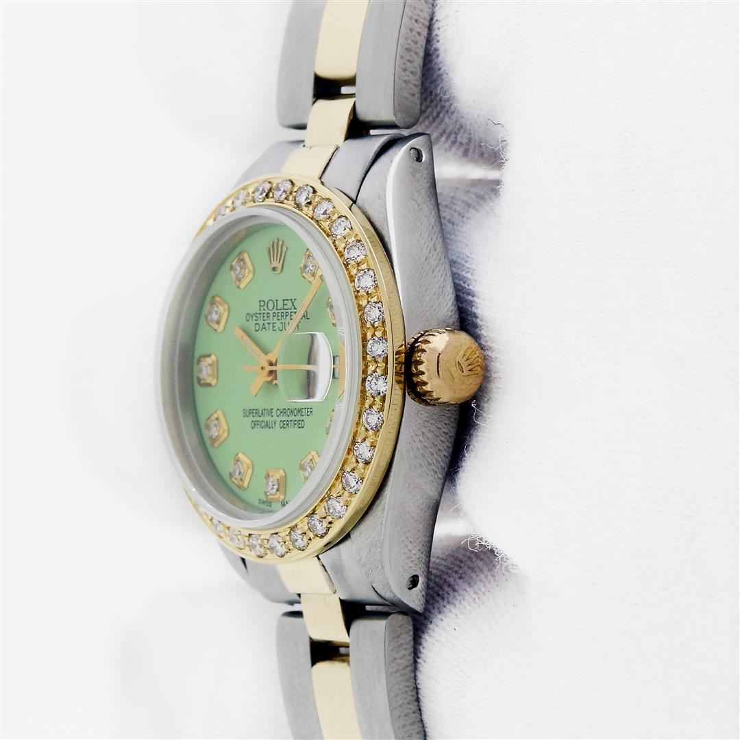 One Ladies Two Tone Rolex Datejust Polished, Serviced & Electronically Tested, Rolex Yellow Gold & Stainless Steel Case: 26mm, Rolex Yellow Gold Crown, Custom Bezel: New 18K Yellow Gold Diamond Bezel, Diamond Count: 32 Diamonds, Clarity: SI-VS, Color: G to H. Custom Crystal: New Sapphire With Magnified Date Window. Custom Hands: New Gold Hands. Rolex Movement: Automatic Winding Movement. Custom Dial: Refinished Green With Added Diamonds On Dial, Diamond Count: 10 Diamonds On Dial, G To H In Color, VS Clarity. Date Window: 3 O'clock Position Date Display, Model: Datejust, Condition: G-6 Extra Fine. Rolex Bracelet: Two Tone Yellow Gold & Stainless Steel Oyster Band. Bright Polish. 6.0 Inch Length, Adjustable. Standard Clasp, With Rolex Logo. This Pre Owned Watch Has Been Serviced Time Tested And Is In Excellent Condition It Is Free Of All Scratches And Dents.