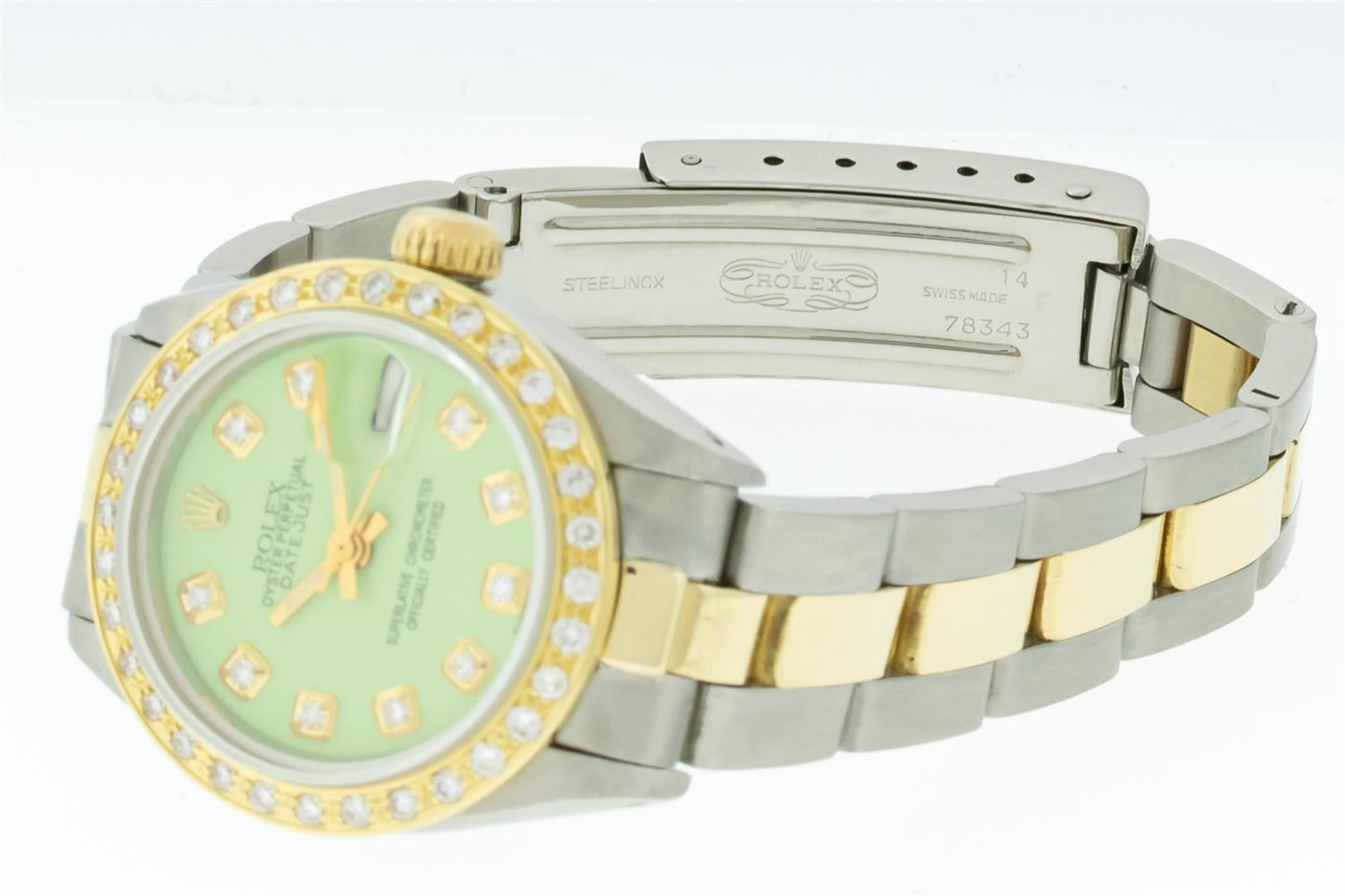 One Ladies Two Tone Rolex Datejust Polished, Serviced & Electronically Tested, Rolex Yellow Gold & Stainless Steel Case: 26mm, Rolex Yellow Gold Crown, Custom Bezel: New 18K Yellow Gold Diamond Bezel, Diamond Count: 32 Diamonds, Clarity: SI-VS, Color: G to H. Custom Crystal: New Sapphire With Magnified Date Window. Custom Hands: New Gold Hands. Rolex Movement: Automatic Winding Movement. Custom Dial: Refinished Green With Added Diamonds On Dial, Diamond Count: 10 Diamonds On Dial, G To H In Color, VS Clarity. Date Window: 3 O'clock Position Date Display, Model: Datejust, Condition: G-6 Extra Fine. Rolex Bracelet: Two Tone Yellow Gold & Stainless Steel Oyster Band. Bright Polish. 6.0 Inch Length, Adjustable. Standard Clasp, With Rolex Logo. This Pre Owned Watch Has Been Serviced Time Tested And Is In Excellent Condition It Is Free Of All Scratches And Dents.