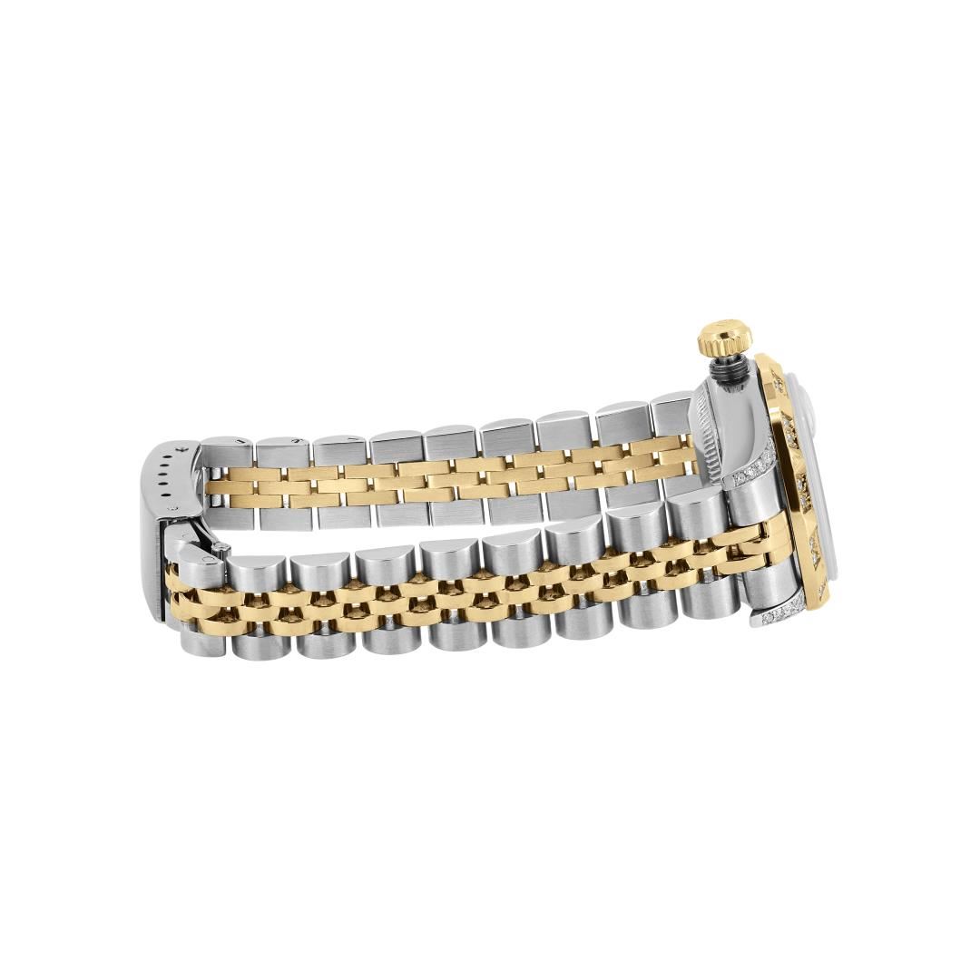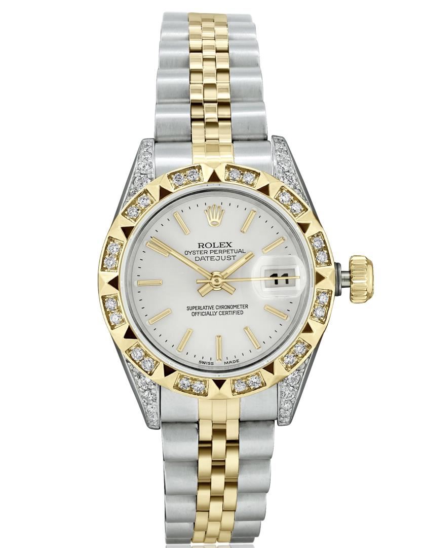 Rolex Ladies Pre Owned Sapphire Quickset 18K Yellow Gold and Stainless Steel Two Tone Datejust Polished Bright with Satin Finish, Serviced & Electronically Tested, Rolex Stainless Steel Case: 26mm, Custom Diamond Lugs: 24 Added Diamonds On Lugs. Rolex 18K Yellow Gold Crown, Custom Bezel: New 18K Yellow Gold Pyramid Diamond Bezel, Diamond Count: 24 Diamonds On Bezel. Custom Crystal: New Sapphire With Magnified Date Window. Custom Hands: New Lumi Hands. Rolex Movement: Automatic Winding Movement 2235. Rolex Dial: Factory Silver Index Dial With Dash Track And Lumi Dots. Date Window: 3 O'Clock Position Date Display, Model: Quickset Datejust, Condition: G-6 Extra Fine. Rolex Bracelet: 18K Yellow Gold & Stainless Steel Jubilee Band. Bright Polish & Satin Finish. 6.0 Inch Length, Adjustable. Fold Clasp, With Rolex Logo. This Watch Has Been Serviced Time Tested And Is In Excellent Condition It Is Free Of All Scratches And Dents. This Watch Comes With A Rolex Box.