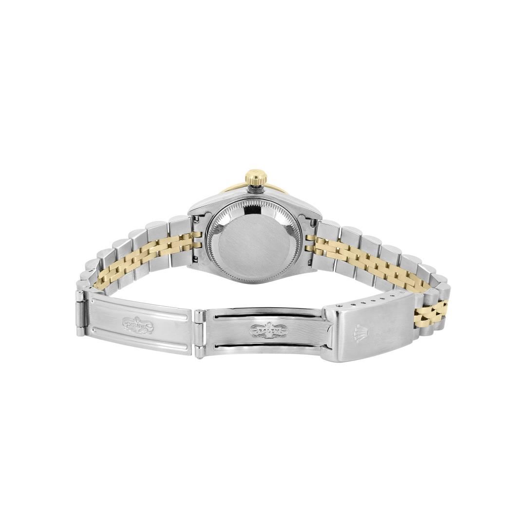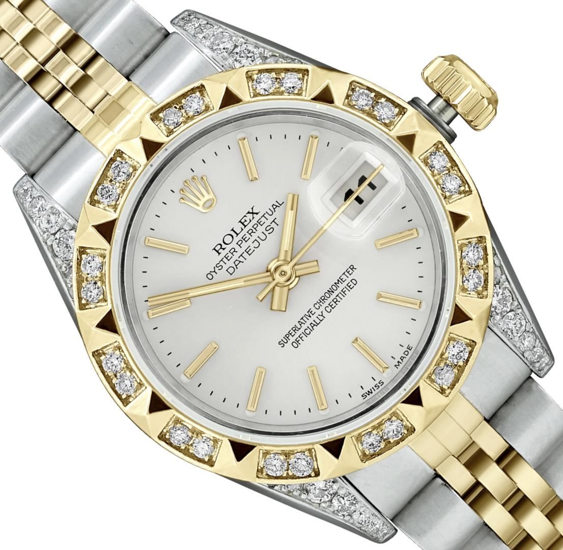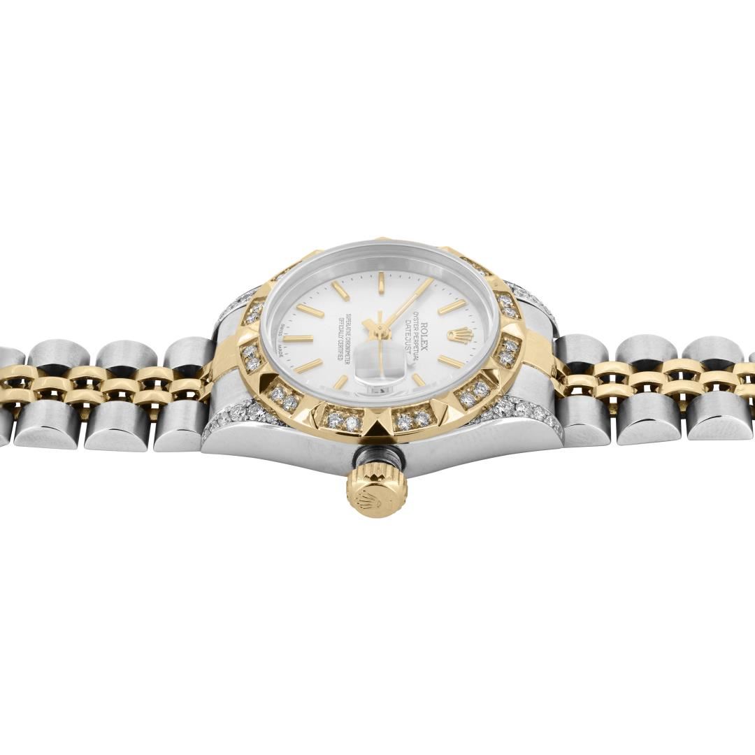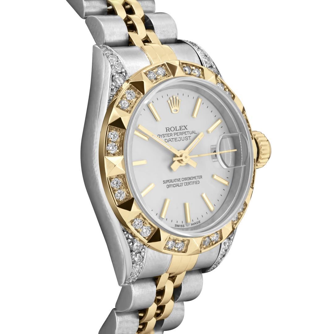 Rolex Ladies Pre Owned Sapphire Quickset 18K Yellow Gold and Stainless Steel Two Tone Datejust Polished Bright with Satin Finish, Serviced & Electronically Tested, Rolex Stainless Steel Case: 26mm, Custom Diamond Lugs: 24 Added Diamonds On Lugs. Rolex 18K Yellow Gold Crown, Custom Bezel: New 18K Yellow Gold Pyramid Diamond Bezel, Diamond Count: 24 Diamonds On Bezel. Custom Crystal: New Sapphire With Magnified Date Window. Custom Hands: New Lumi Hands. Rolex Movement: Automatic Winding Movement 2235. Rolex Dial: Factory Silver Index Dial With Dash Track And Lumi Dots. Date Window: 3 O'Clock Position Date Display, Model: Quickset Datejust, Condition: G-6 Extra Fine. Rolex Bracelet: 18K Yellow Gold & Stainless Steel Jubilee Band. Bright Polish & Satin Finish. 6.0 Inch Length, Adjustable. Fold Clasp, With Rolex Logo. This Watch Has Been Serviced Time Tested And Is In Excellent Condition It Is Free Of All Scratches And Dents. This Watch Comes With A Rolex Box.