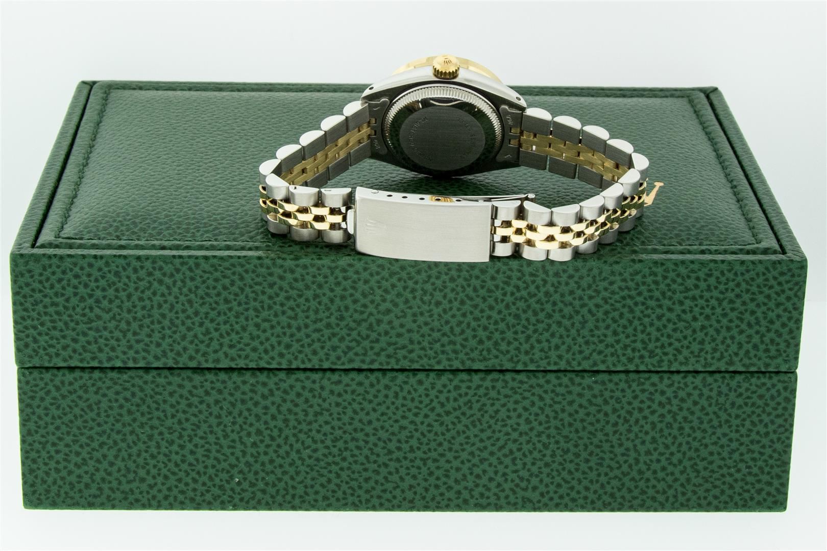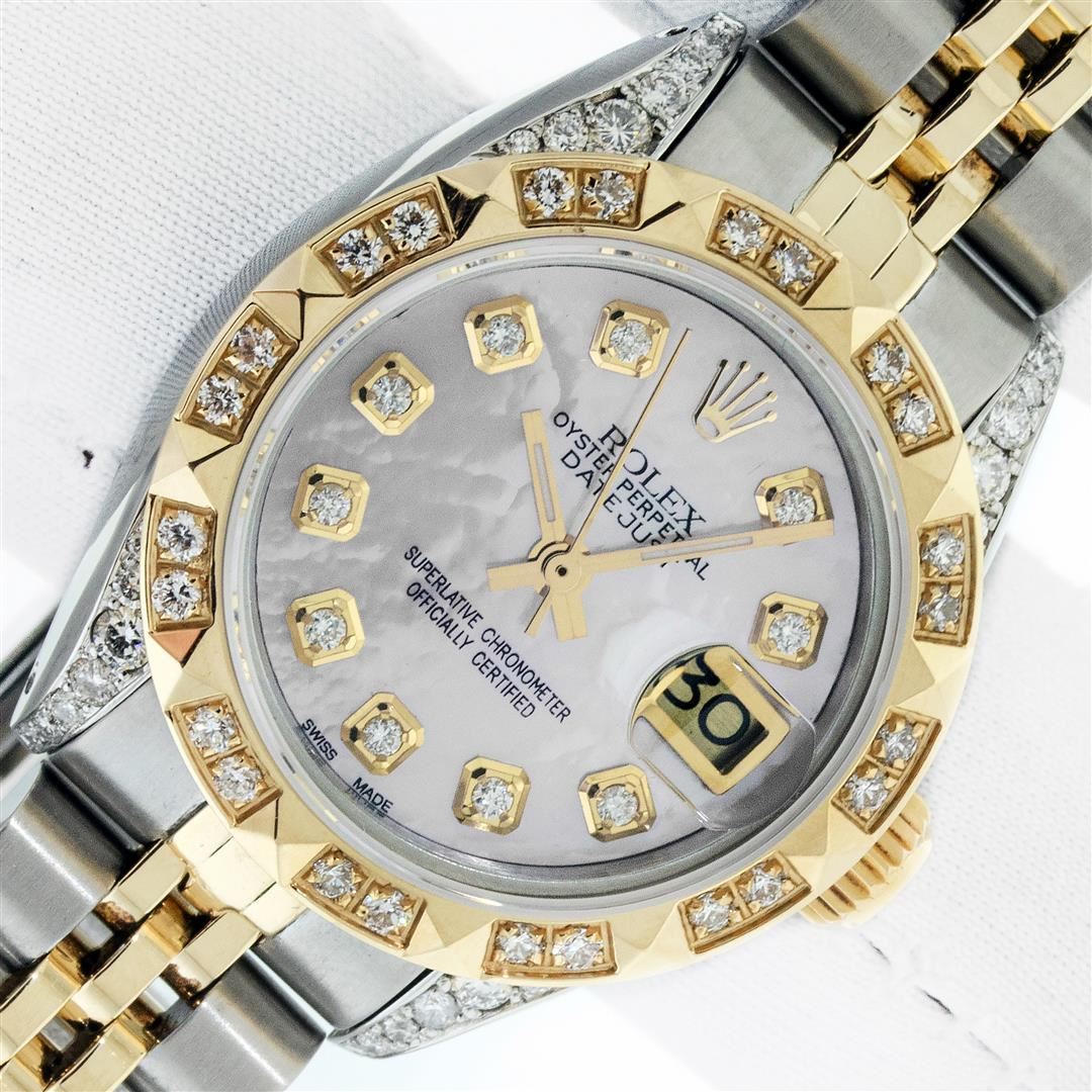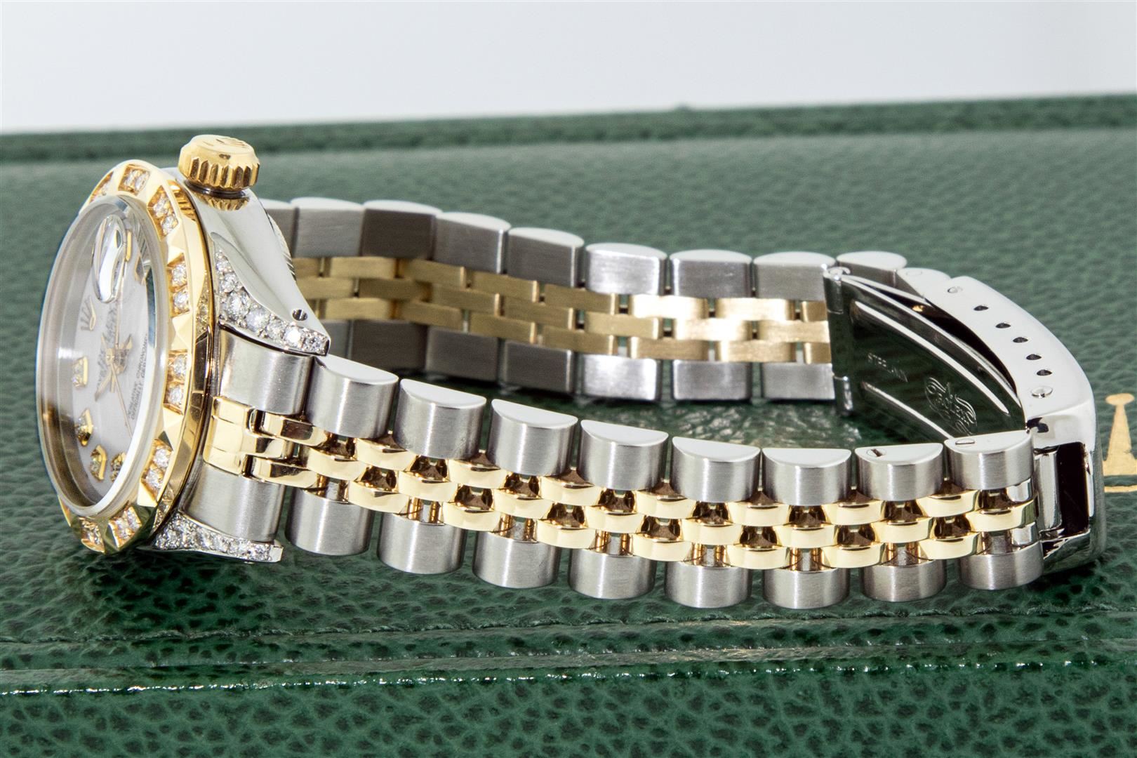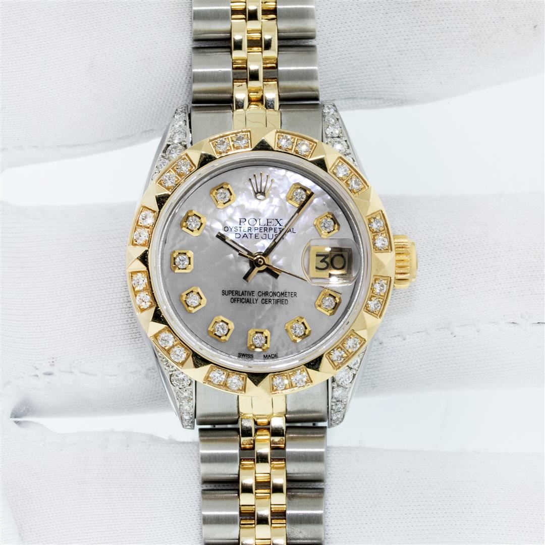 One Ladies Two Tone Rolex Datejust Polished, Serviced & Electronically Tested, Rolex Yellow Gold & Stainless Steel Case: 26mm, Rolex Yellow Gold Crown, Custom Diamond Lugs: 24 Diamonds On Lugs, Clarity: SI-VS, Color: G to H. Custom Bezel: New 18K Yellow Gold Pyramid Diamond Bezel, Diamond Count: 24 Diamonds, Clarity: SI-VS, Color: G to H. Custom Crystal: New Sapphire with Magnified Date Window. Custom Hands: New Luminescent Hands. Rolex Movement: Automatic Winding Movement. Custom Dial: Mother Of Pearl with Diamond Hour Markers, Diamond Count: 10 Diamonds In Dial, Clarity: SI-VS, Color: G to H. Date Window: 3 O'Clock Position Date Display, Model: Datejust. Condition: G-6 Extra Fine. Rolex Bracelet: Two Tone Yellow Gold & Stainless Steel Jubilee Band. Bright Polish. 6.0 Inch Length, Adjustable. Standard Clasp, with Rolex Logo. This Pre Owned Watch Has Been Serviced Time Tested And Is In Excellent Condition It Is Free Of All Scratches And Dents. This Watch Comes with A Rolex Box.