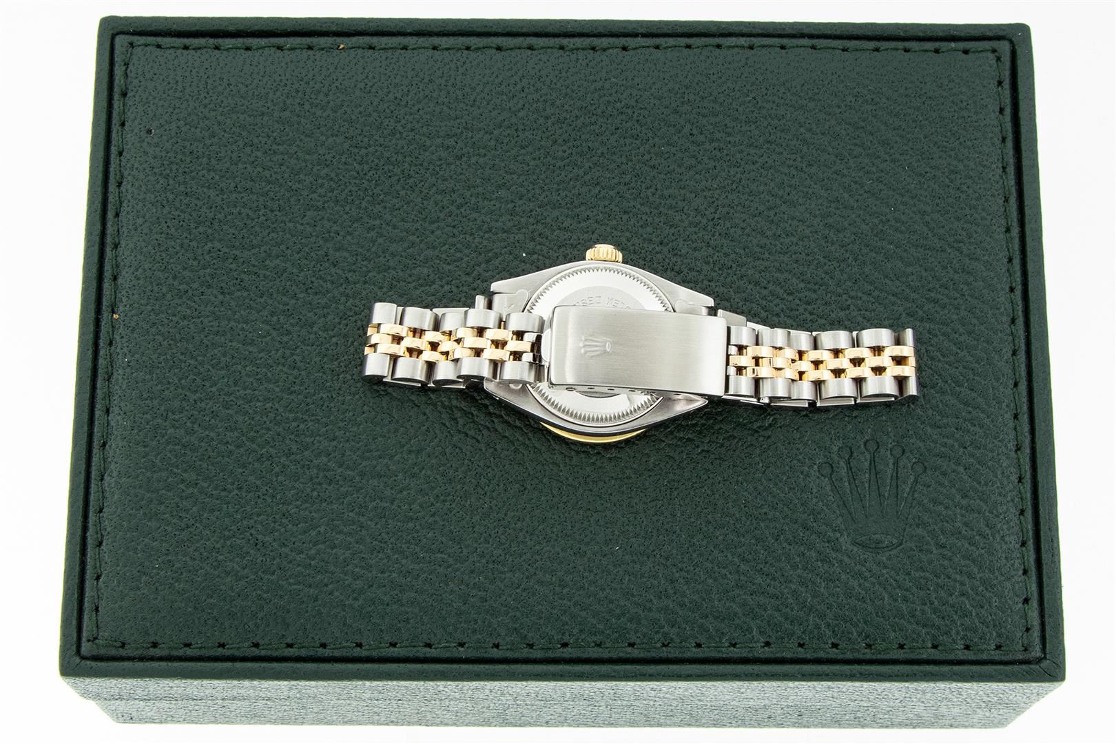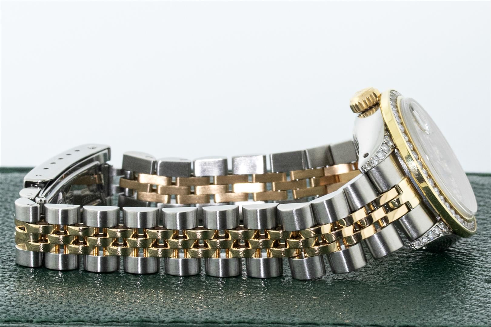 One Ladies Two Tone Rolex Datejust Polished, Serviced & Electronically Tested, Yellow Gold & Stainless Steel Case: 26mm, Yellow Gold Crown, Custom Diamond Lugs: 24 Diamonds On Lugs, Clarity: SI-VS, Color: G to H, Clarity SI-VS. Custom Bezel: New 18K Yellow Gold Channel Set Diamond Bezel, Diamond Count: 44 Diamonds On Bezel, Clarity: SI-VS, Color: G to H. Custom Crystal: New Sapphire with Date Window. Custom Hands: New Luminescent Hands. Rolex Movement: Automatic Winding Movement. Custom Dial: Refinished To Blue Vignette with Custom Added Diamonds, Stone Count: 43 Diamonds In Dial, Clarity: SI-VS, Color: G to H. Date Window: 3 O'Clock Position Date Display, Model: Datejust. Condition: G-6 Extra Fine. Rolex Bracelet: Two Tone Yellow Gold & Stainless Steel Jubilee. Bright Polish. 6.0 Inch Length, Adjustable. Standard Clasp, with Rolex Logo. This Watch Has Been Serviced Time Tested And Is In Excellent Condition It Is Free Of All Scratches And Dents.
