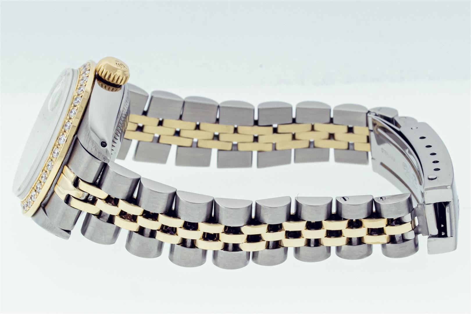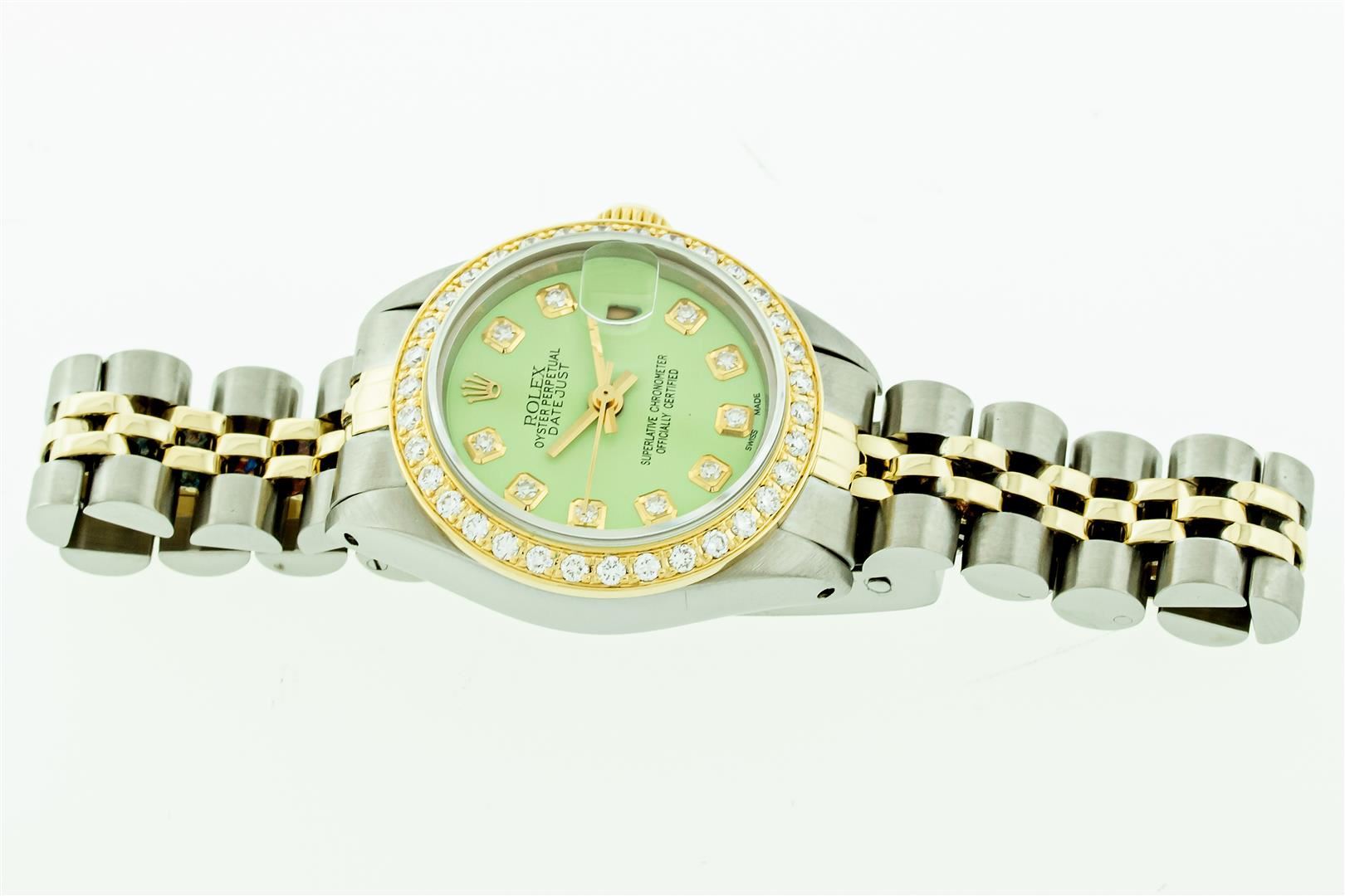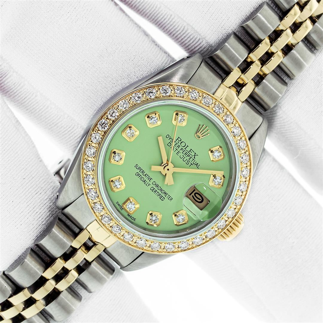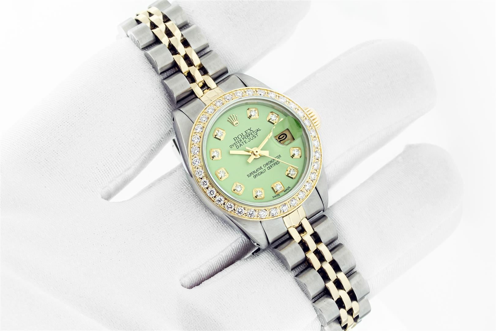 One Ladies Two Tone Rolex Datejust Polished, Serviced & Electronically Tested, Yellow Gold & Stainless Steel Case: 26mm, Rolex Yellow Gold Crown, Custom Bezel: New 18K Yellow Gold Beadset Diamond Bezel, Diamond Count: 32 Diamonds, Clarity: Si-VS, Color: G to H. Custom Crystal: New Sapphire with Magnified Date Window. Custom Hands: New Gold Hands. Rolex Movement: Automatic Winding Movement. Custom Dial: Refinished To Green with Added Diamonds, Diamond Count: 10 Diamonds in Dial, G To H In Color, VS Clarity. Date Window: 3 O'Clock Position Date Display, Model: Datejust, Condition: G-6 Extra Fine. Rolex Bracelet: Two Tone Yellow Gold & Stainless Steel Jubilee Band. Bright Polish. 6.0 Inch Length, Adjustable. Standard Clasp, with Rolex Logo. This Pre Owned Watch Has Been Serviced Time Tested And Is In Excellent Condition It Is Free Of All Scratches And Dents.