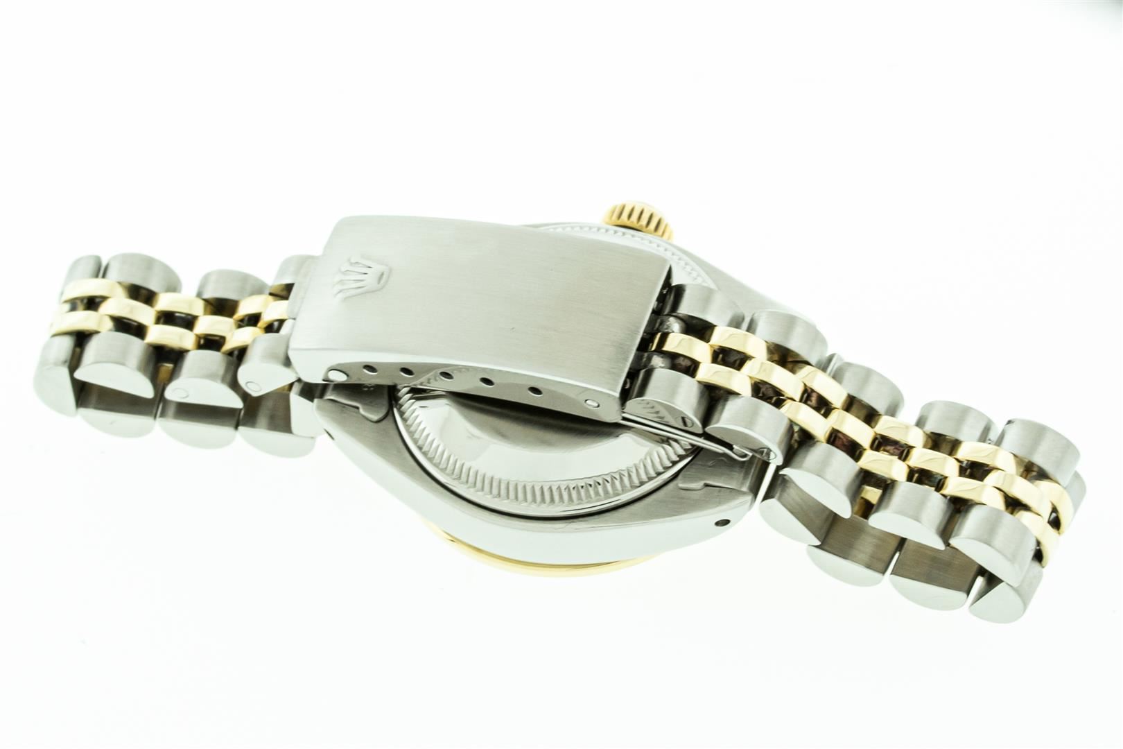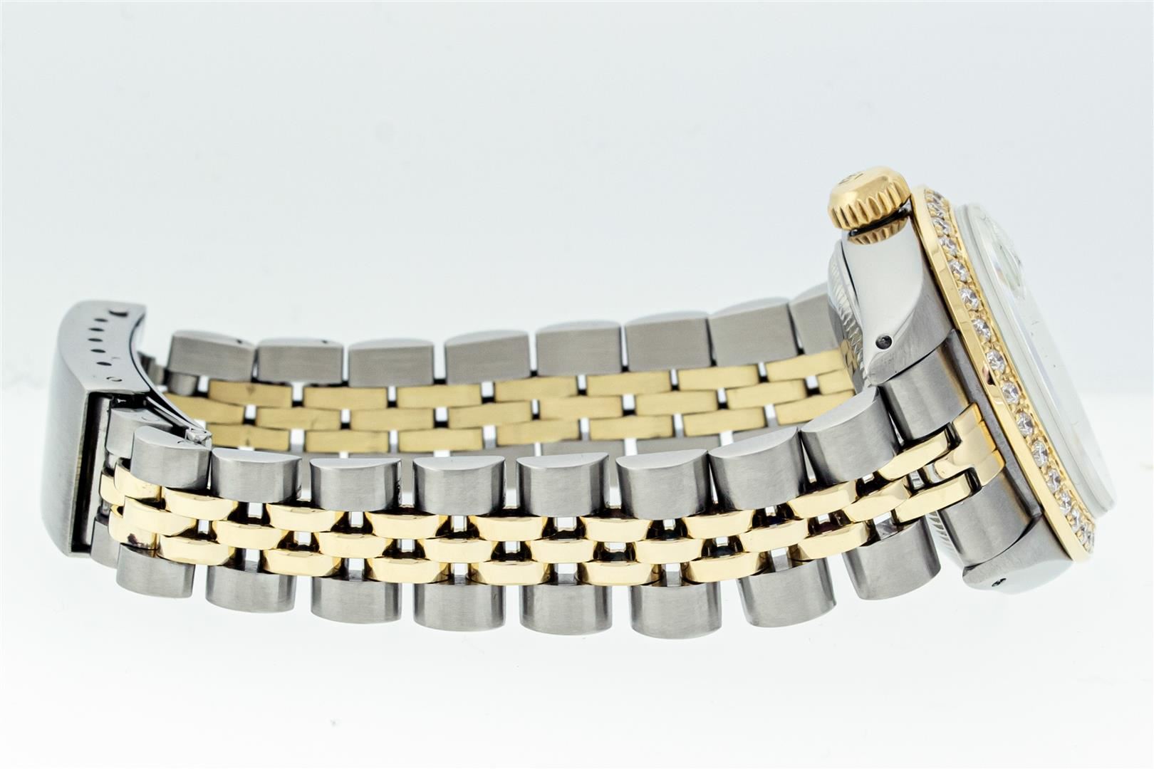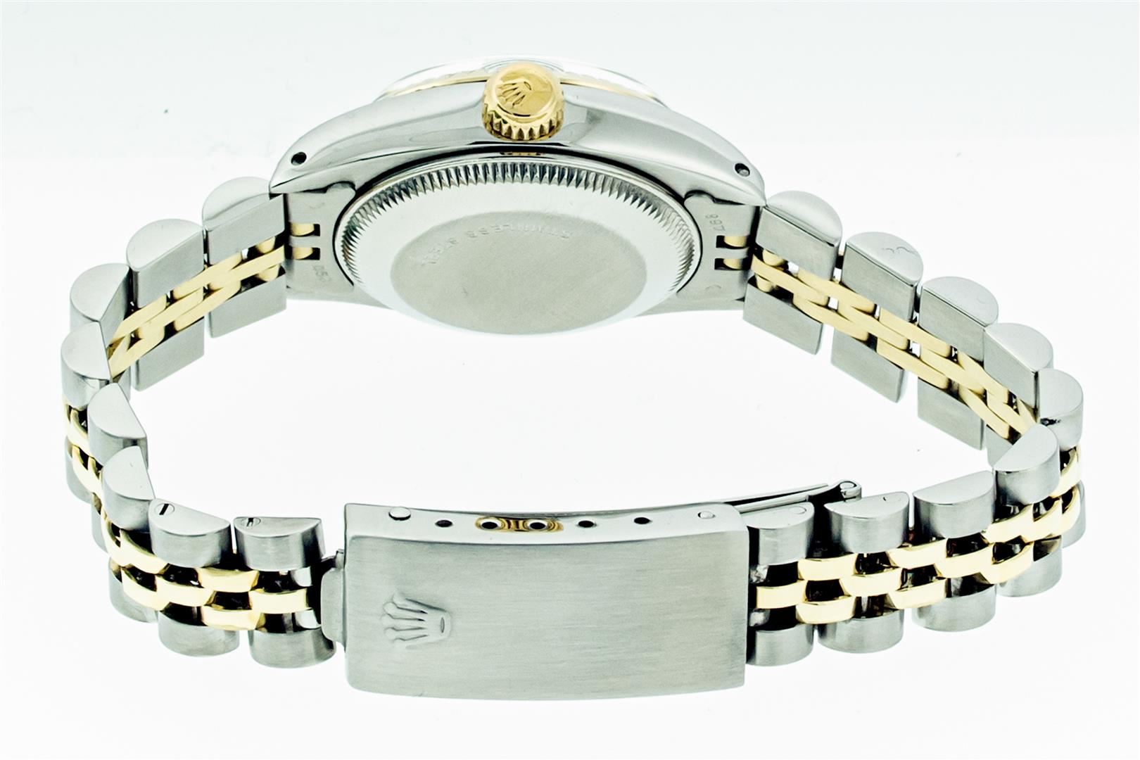One Ladies Two Tone Rolex Datejust Polished, Serviced & Electronically Tested, Yellow Gold & Stainless Steel Case: 26mm, Rolex Yellow Gold Crown, Custom Bezel: New 18K Yellow Gold Beadset Diamond Bezel, Diamond Count: 32 Diamonds, Clarity: Si-VS, Color: G to H. Custom Crystal: New Sapphire with Magnified Date Window. Custom Hands: New Gold Hands. Rolex Movement: Automatic Winding Movement. Custom Dial: Refinished To Green with Added Diamonds, Diamond Count: 10 Diamonds in Dial, G To H In Color, VS Clarity. Date Window: 3 O'Clock Position Date Display, Model: Datejust, Condition: G-6 Extra Fine. Rolex Bracelet: Two Tone Yellow Gold & Stainless Steel Jubilee Band. Bright Polish. 6.0 Inch Length, Adjustable. Standard Clasp, with Rolex Logo. This Pre Owned Watch Has Been Serviced Time Tested And Is In Excellent Condition It Is Free Of All Scratches And Dents.
