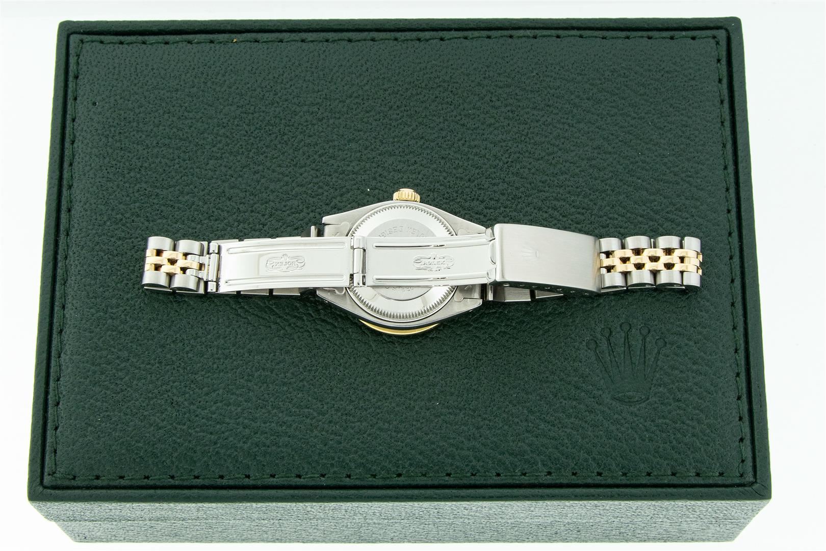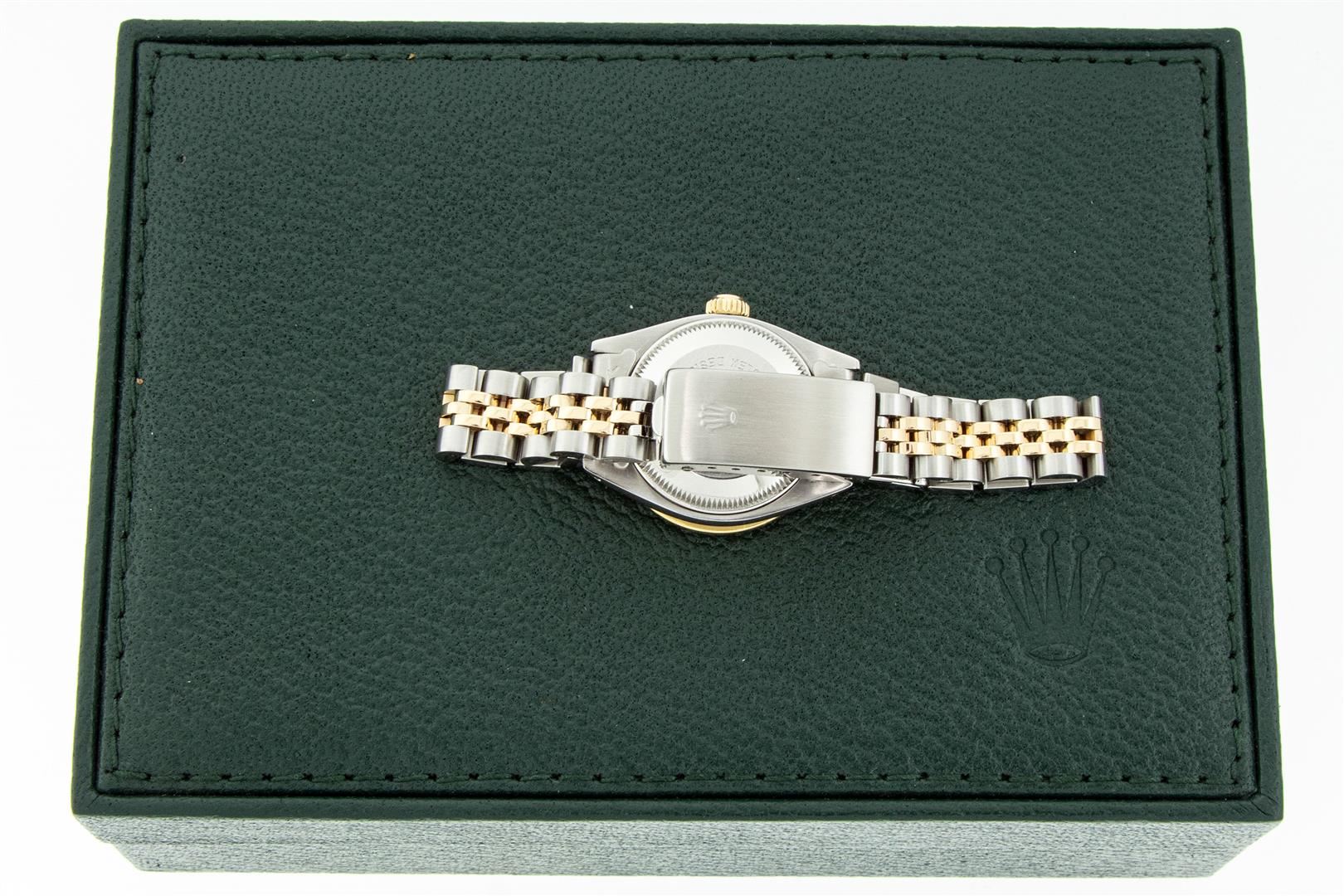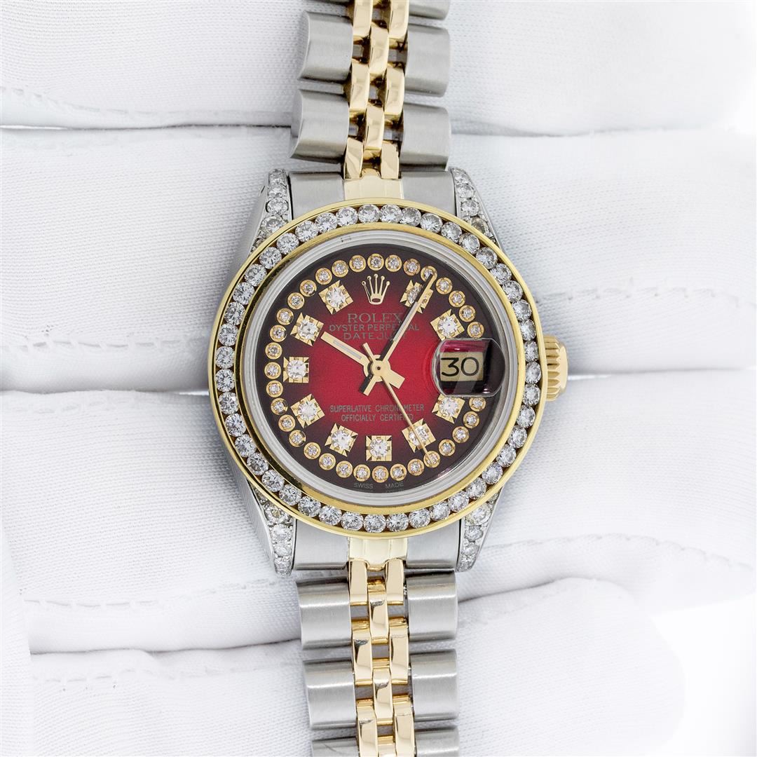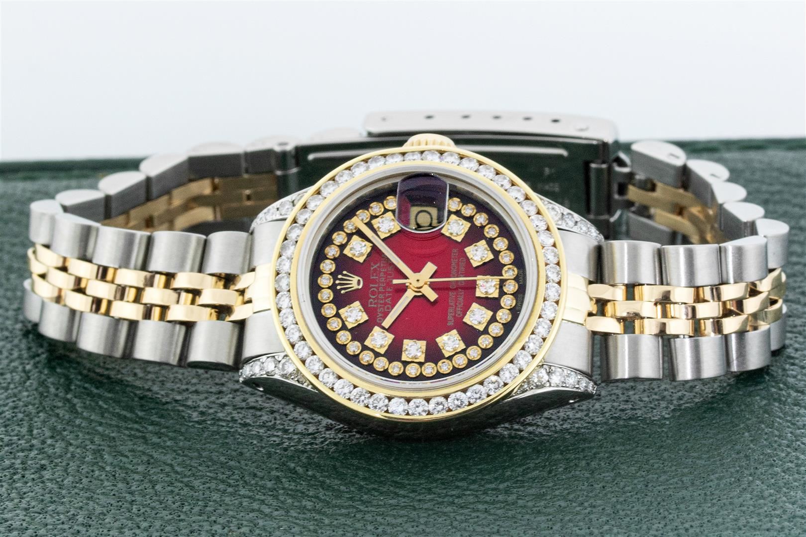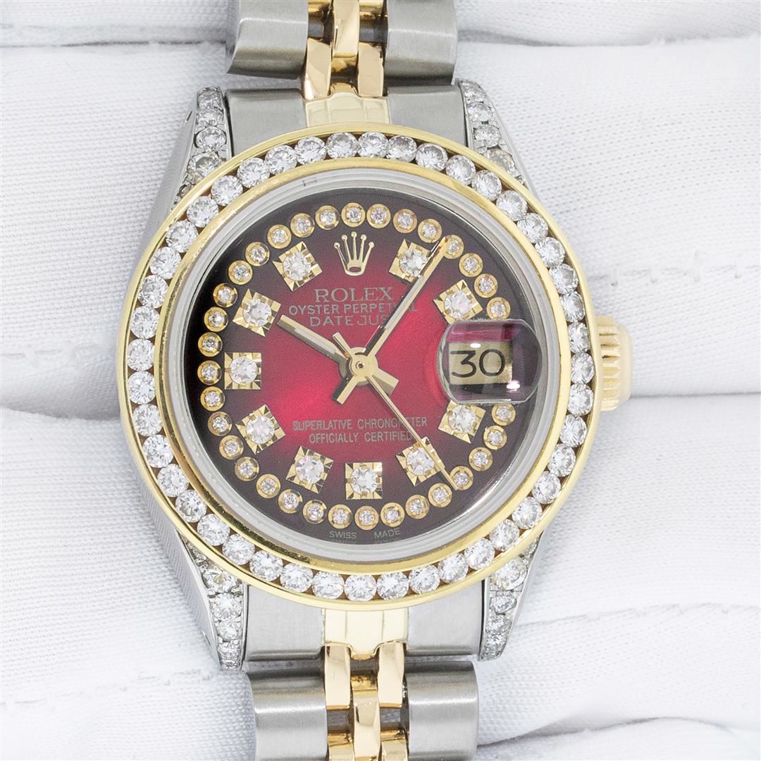 One Ladies Two Tone Rolex Datejust Polished, Serviced & Electronically Tested, Yellow Gold & Stainless Steel Case: 26mm, Yellow Gold Crown, Custom Diamond Lugs: 24 Diamonds On Lugs, Clarity: SI-VS, Color: G to H, Clarity SI-VS. Custom Bezel: New 18K Yellow Gold Channel Set Diamond Bezel, Diamond Count: 44 Diamonds On Bezel, Clarity: SI-VS, Color: G to H. Custom Crystal: New Sapphire with Date Window. Custom Hands: New Luminescent Hands. Rolex Movement: Automatic Winding Movement. Custom Dial: Refinished To Red Vignette with Custom Added Diamonds, Stone Count: 43 Diamonds In Dial, Clarity: SI-VS, Color: G to H. Date Window: 3 O'Clock Position Date Display, Model: Datejust. Condition: G-6 Extra Fine. Rolex Bracelet: Two Tone Yellow Gold & Stainless Steel Jubilee. Bright Polish. 6.0 Inch Length, Adjustable. Standard Clasp, with Rolex Logo. This Watch Has Been Serviced Time Tested And Is In Excellent Condition It Is Free Of All Scratches And Dents.