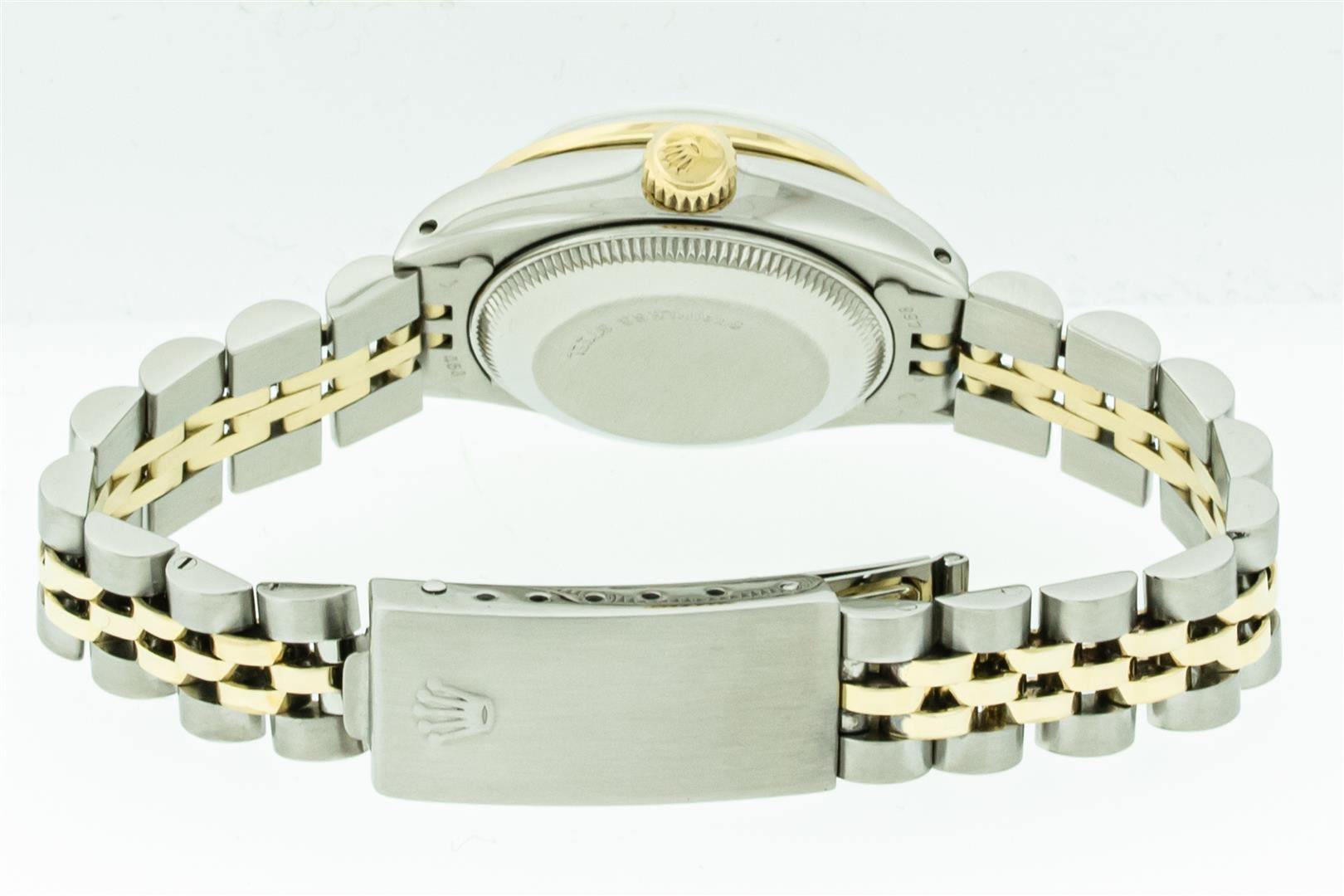 One Ladies Two Tone Rolex Datejust Polished, Serviced & Electronically Tested, Yellow Gold & Stainless Steel Case: 26mm, Rolex Yellow Gold Crown, Custom Bezel: New 18K Yellow Gold Beadset Diamond Bezel, Diamond Count: 32 Diamonds, Clarity: Si-VS, Color: G to H. Custom Crystal: New Sapphire with Magnified Date Window. Custom Hands: New Gold Hands. Rolex Movement: Automatic Winding Movement. Custom Dial: Refinished To Green with Added Diamonds, Diamond Count: 10 Diamonds in Dial, G To H In Color, VS Clarity. Date Window: 3 O'Clock Position Date Display, Model: Datejust, Condition: G-6 Extra Fine. Rolex Bracelet: Two Tone Yellow Gold & Stainless Steel Jubilee Band. Bright Polish. 6.0 Inch Length, Adjustable. Standard Clasp, with Rolex Logo. This Pre Owned Watch Has Been Serviced Time Tested And Is In Excellent Condition It Is Free Of All Scratches And Dents.