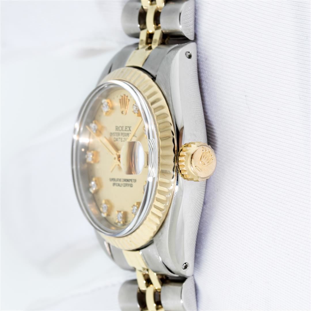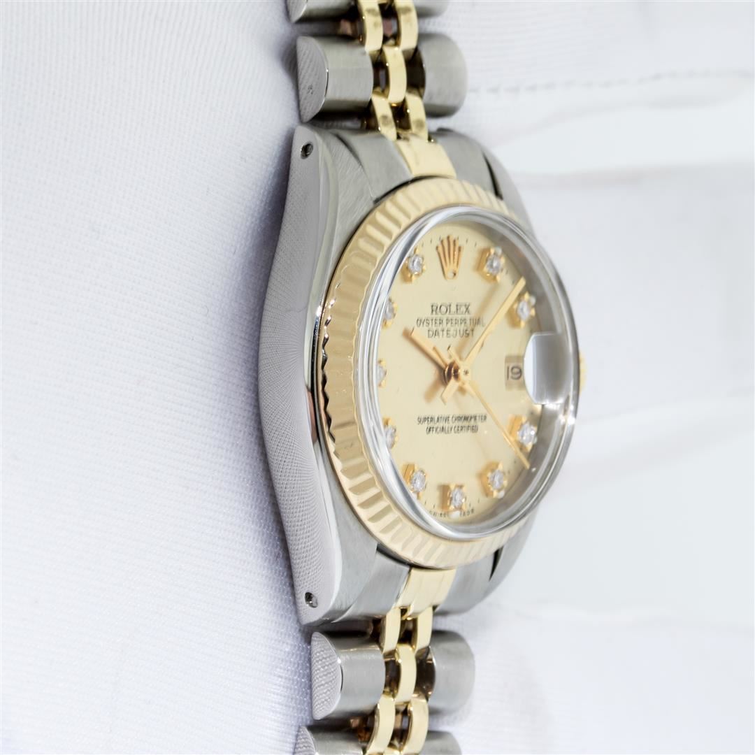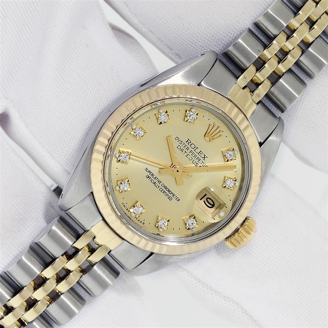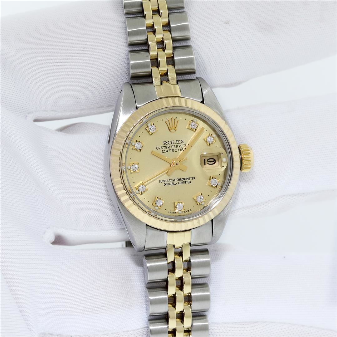 One Ladies Pre Owned Two Tone Rolex Datejust Polished, Serviced & Electronically Tested, Rolex Yellow Gold & Stainless Steel Case: 26mm, Rolex Yellow Gold Crown, Rolex Bezel: Rolex Yellow Gold Fluted Bezel. Custom Crystal: New Plastic with Date Window. Custom Hands: Non Luminescent Hands. Rolex Movement: Automatic Winding Movement. Rolex Dial: Champagne with Diamond Hour Markers, Diamond Count: 10 Diamonds In Dial, Clarity: VS. Date Window: 3 O'Clock Position Date Display, Model: Datejust. Condition: G-6 Extra Fine. Rolex Bracelet: Two Tone Yellow Gold & Stainless Steel Jubilee Band. Bright Polish. 6.0 Inch Length, Adjustable. Standard Clasp, with Rolex Logo. This Watch Has Been Serviced Time Tested And Is In Excellent Condition It Is Free Of All Scratches And Dents.
