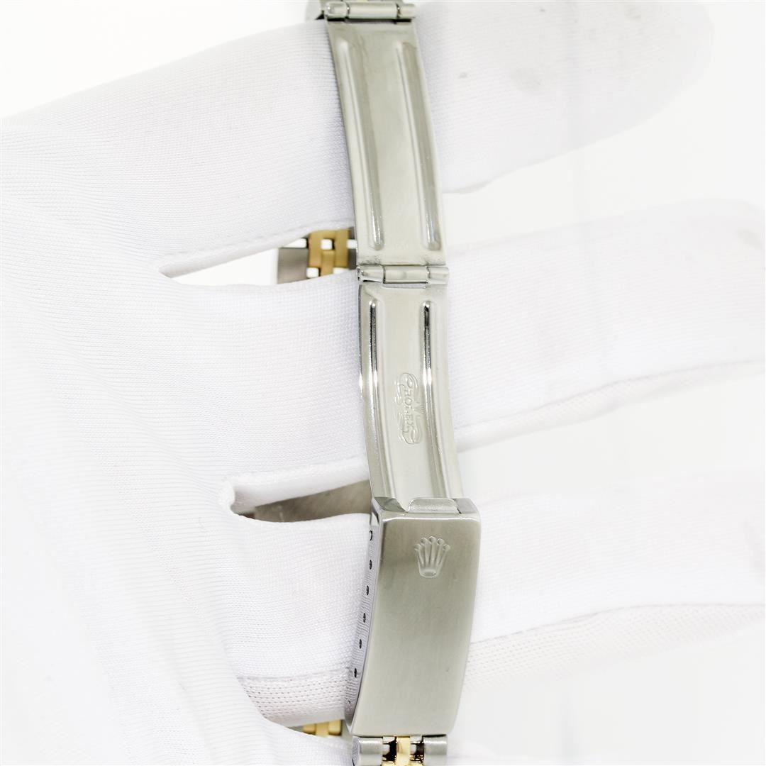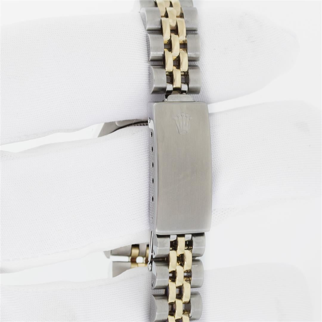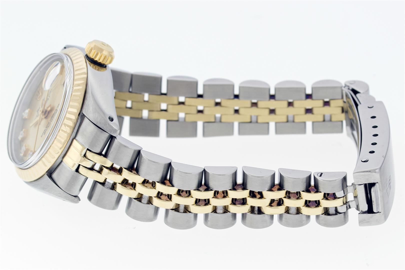 One Ladies Pre Owned Two Tone Rolex Datejust Polished, Serviced & Electronically Tested, Rolex Yellow Gold & Stainless Steel Case: 26mm, Rolex Yellow Gold Crown, Rolex Bezel: Rolex Yellow Gold Fluted Bezel. Custom Crystal: New Plastic with Date Window. Custom Hands: Non Luminescent Hands. Rolex Movement: Automatic Winding Movement. Rolex Dial: Champagne with Diamond Hour Markers, Diamond Count: 10 Diamonds In Dial, Clarity: VS. Date Window: 3 O'Clock Position Date Display, Model: Datejust. Condition: G-6 Extra Fine. Rolex Bracelet: Two Tone Yellow Gold & Stainless Steel Jubilee Band. Bright Polish. 6.0 Inch Length, Adjustable. Standard Clasp, with Rolex Logo. This Watch Has Been Serviced Time Tested And Is In Excellent Condition It Is Free Of All Scratches And Dents.
