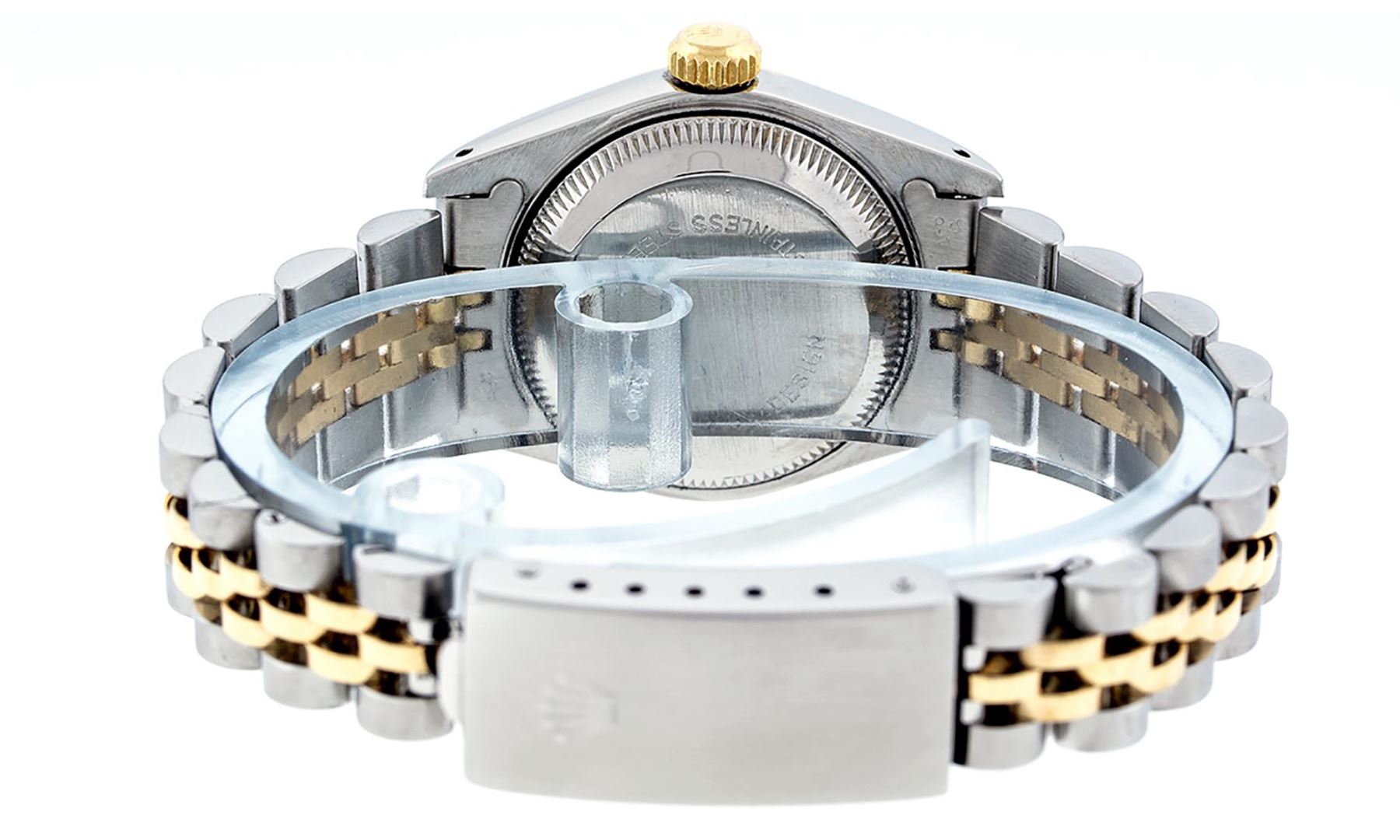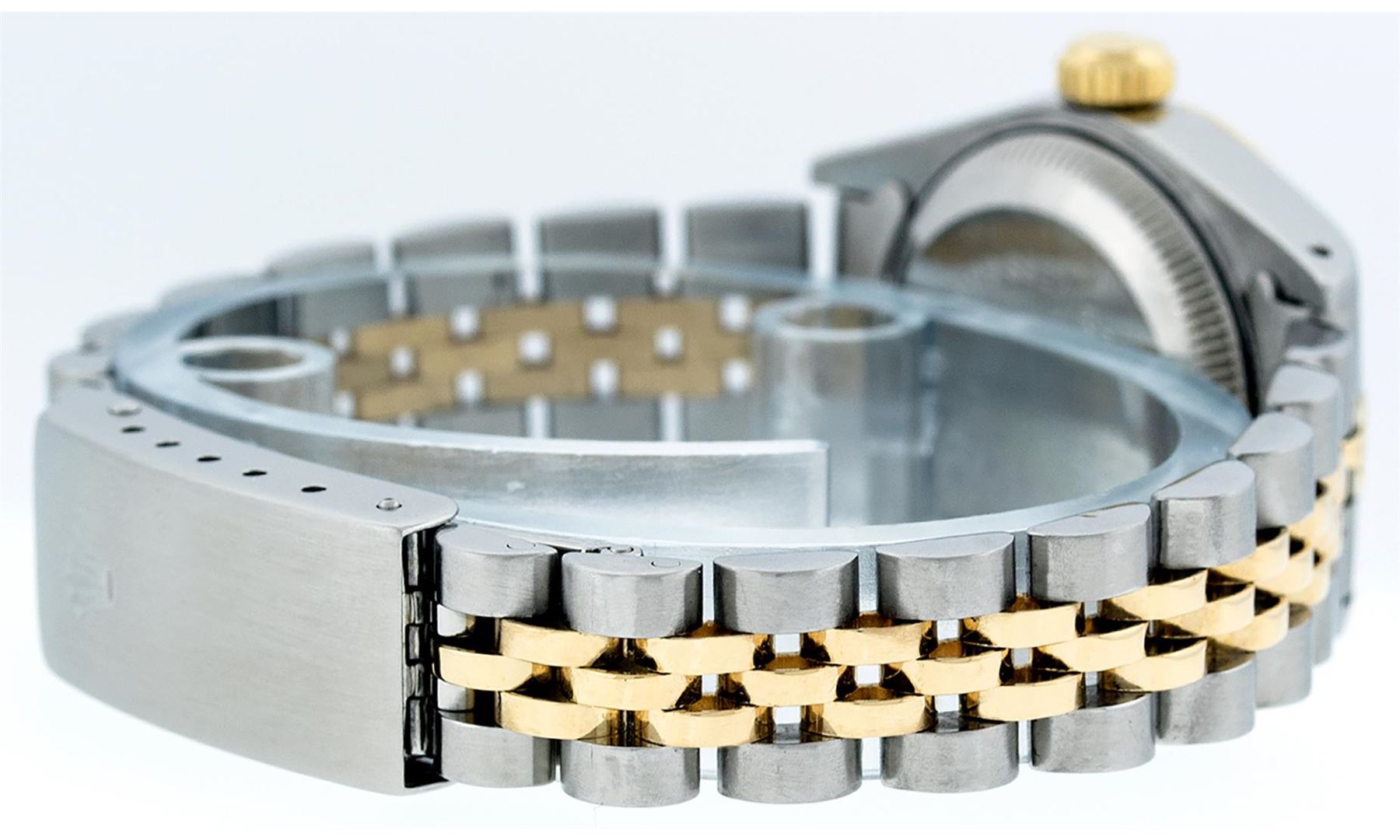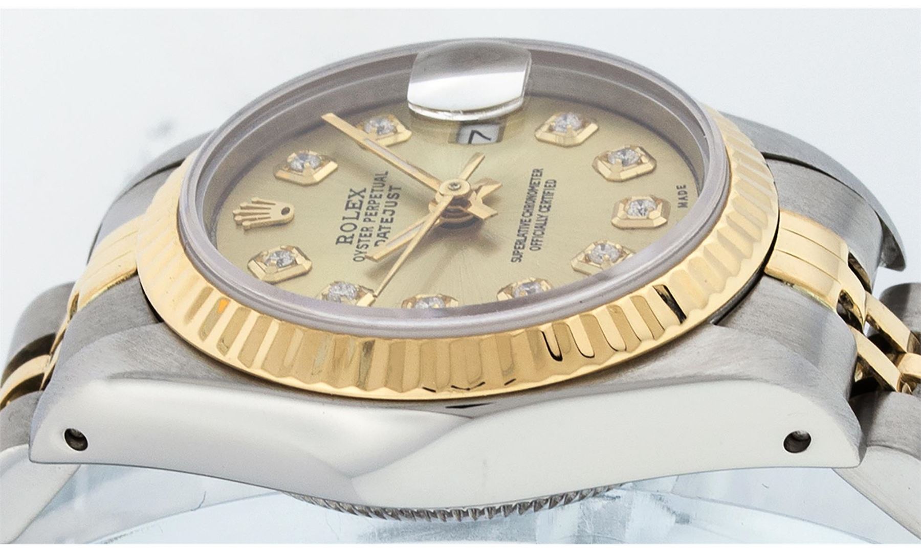 One Ladies Pre Owned Rolex Quickset Two Tone 18K Yellow Gold And Stainless Steel Datejust Polished, Serviced & Electronically Tested, Rolex Yellow Gold And Stainless Steel Case: 26mm, Rolex Yellow Gold Crown, Rolex Bezel: Rolex 18K Yellow Gold Fluted Bezel. Custom Crystal: New Sapphire With Magnified Date Window. Custom Hands: New Luminescent Hands. Rolex Movement: Automatic Winding Movement 2135. Custom Dial: Custom Champagne Dial With Added Diamond Hour Markers, Diamond Count: 10 Diamonds In Dial. Date Window: 3 O'Clock Position Date Display, Model: Quickset Datejust. Condition: G-6 Extra Fine. Rolex Bracelet: Two Tone 18K Yellow Gold And Stainless Steel Jubilee Band. Bright Polish. 6.0 Inch Length, Adjustable. Standard Clasp, With Rolex Logo. This Watch Has Been Serviced Time Tested And Is In Excellent Condition It Is Free Of All Scratches And Dents.