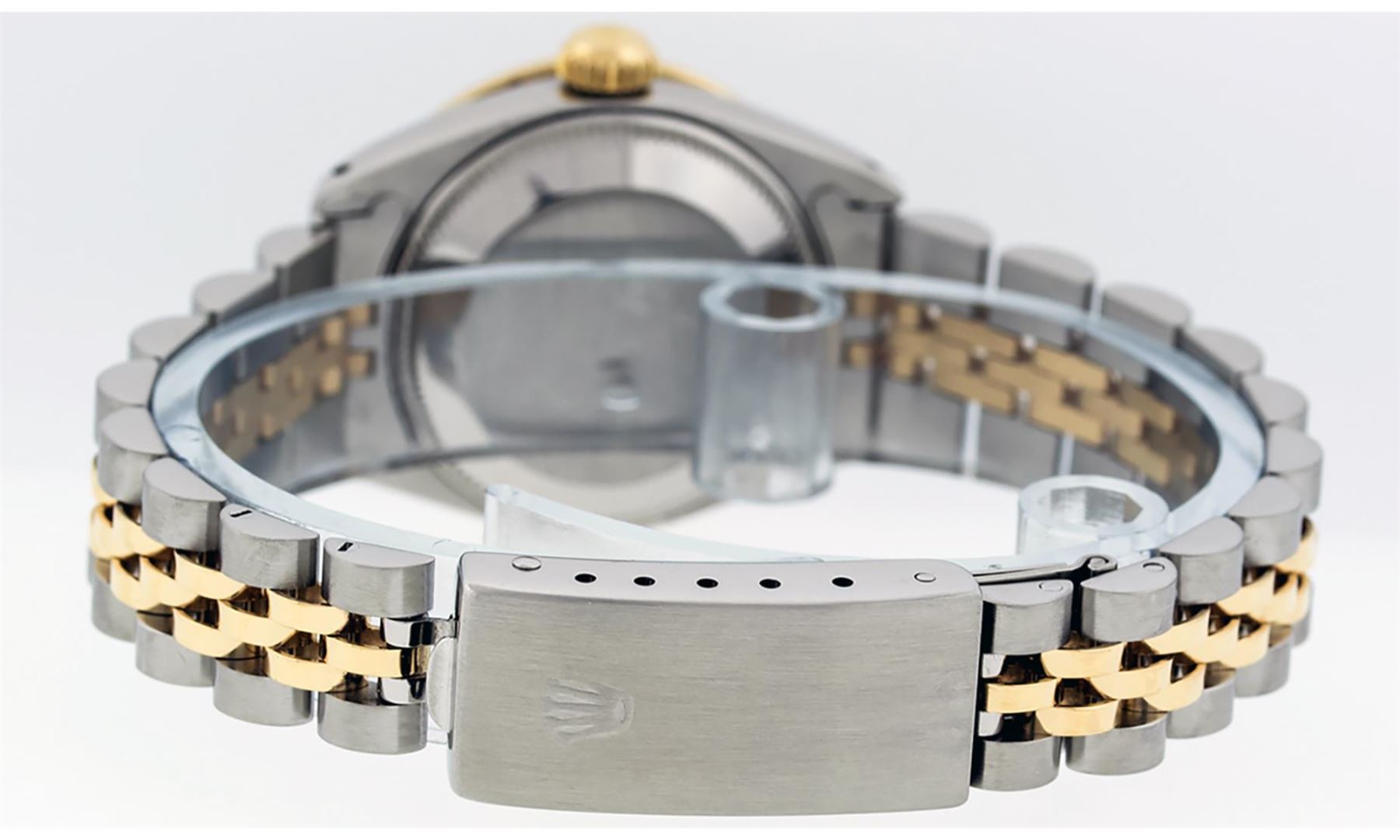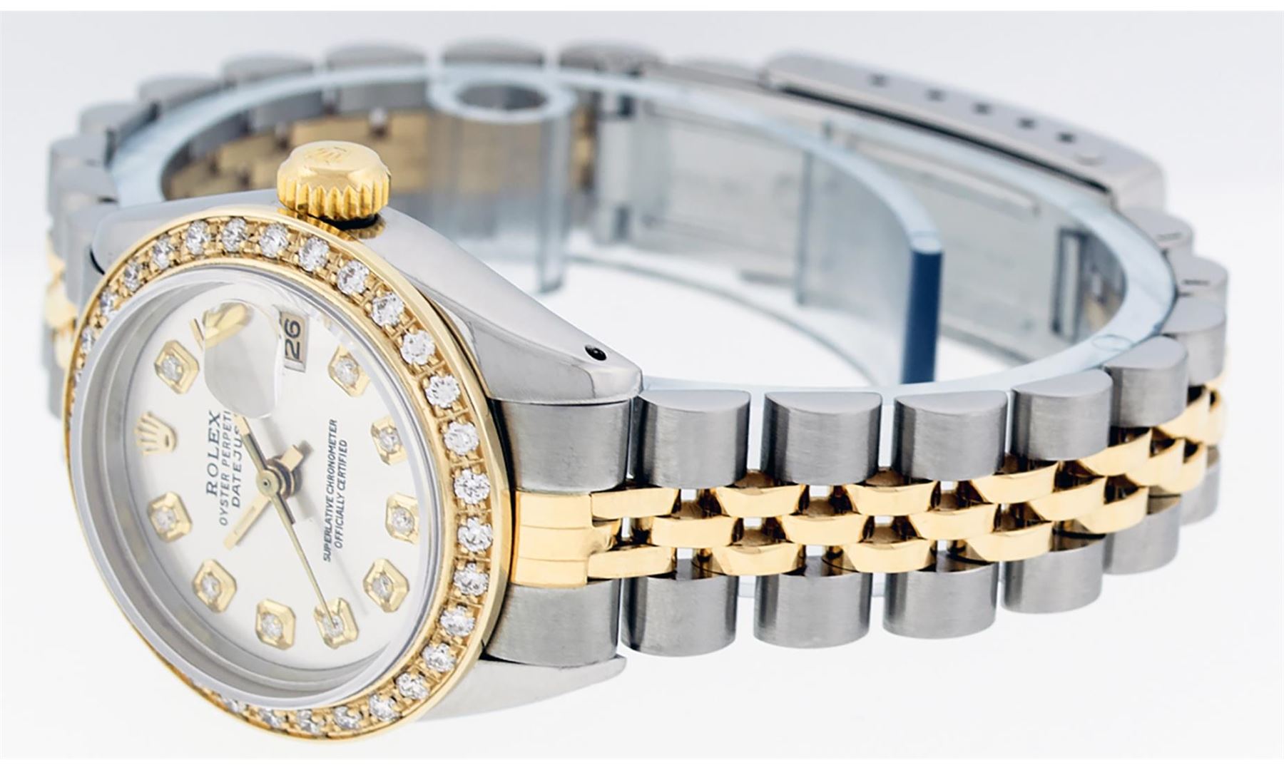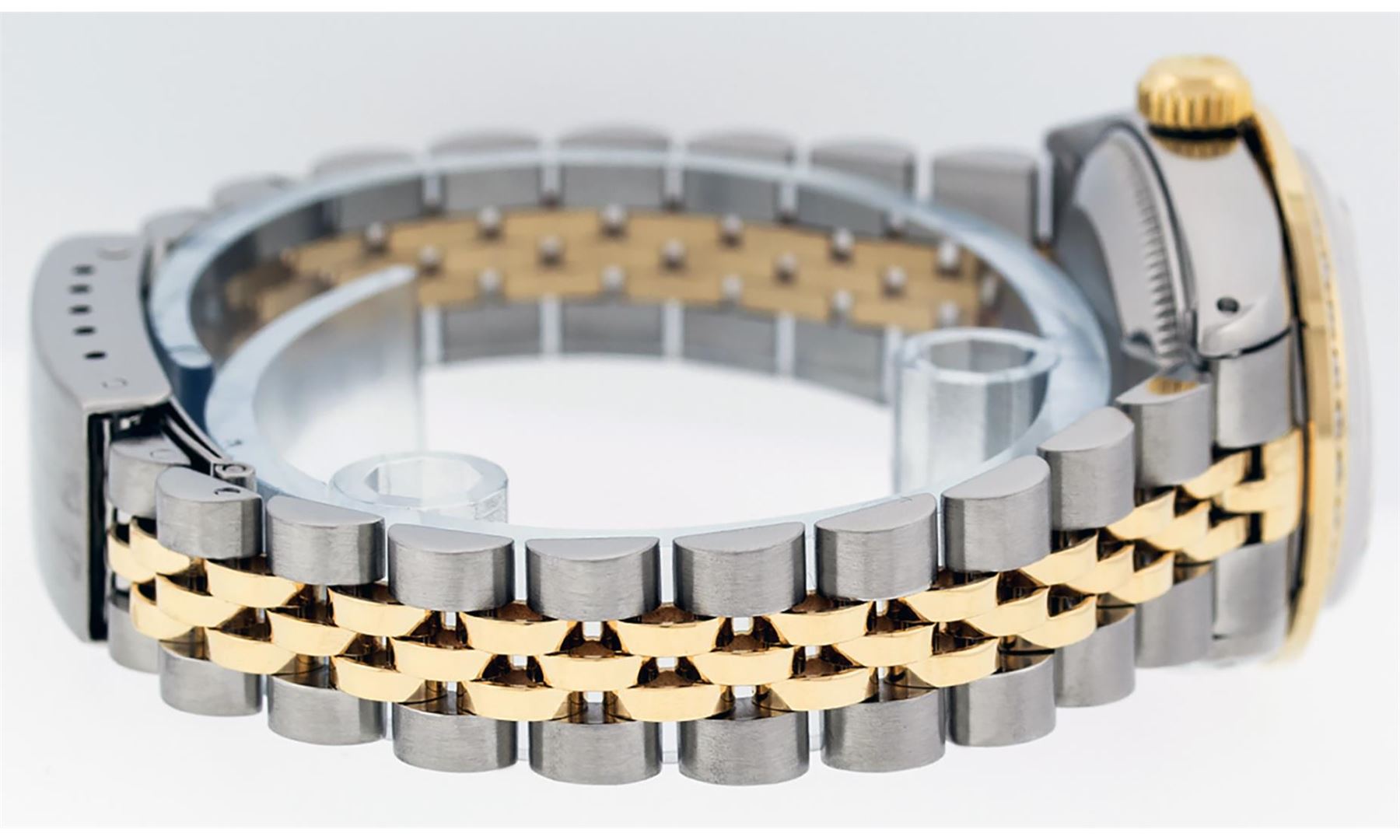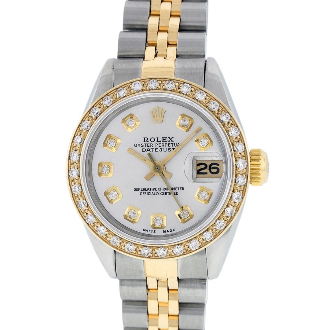 One Ladies Pre Owned Quickset Two Tone 18K Yellow Gold And Stainless Steel Rolex Datejust Polished, Serviced And Electronically Tested, Yellow Gold And Stainless Steel Case: 26mm, Yellow Gold Crown, Custom Bezel: New 18K Yellow Gold Beadset Diamond Bezel, Diamond Count: 32 Diamonds. Custom Crystal: New Sapphire With Magnified Date Window. Custom Hands: New Luminescent Hands. Movement: Automatic Winding Movement 2135. Custom Dial: Silver Dial Set With Diamond Hour Markers, 10 Diamond in Dial. Date Window: 3 O'Clock Position Date Display, Model: Quickset Datejust. Condition: G-6 Extra Fine. Rolex Bracelet: Two Tone 18K Yellow Gold And Stainless Steel Jubilee Band. Bright Polish. 6.0 Inch Length, Adjustable. Standard Clasp, With Rolex Logo. This Watch Has Been Serviced Time Tested And Is In Excellent Condition It Is Free Of All Scratches And Dents.
