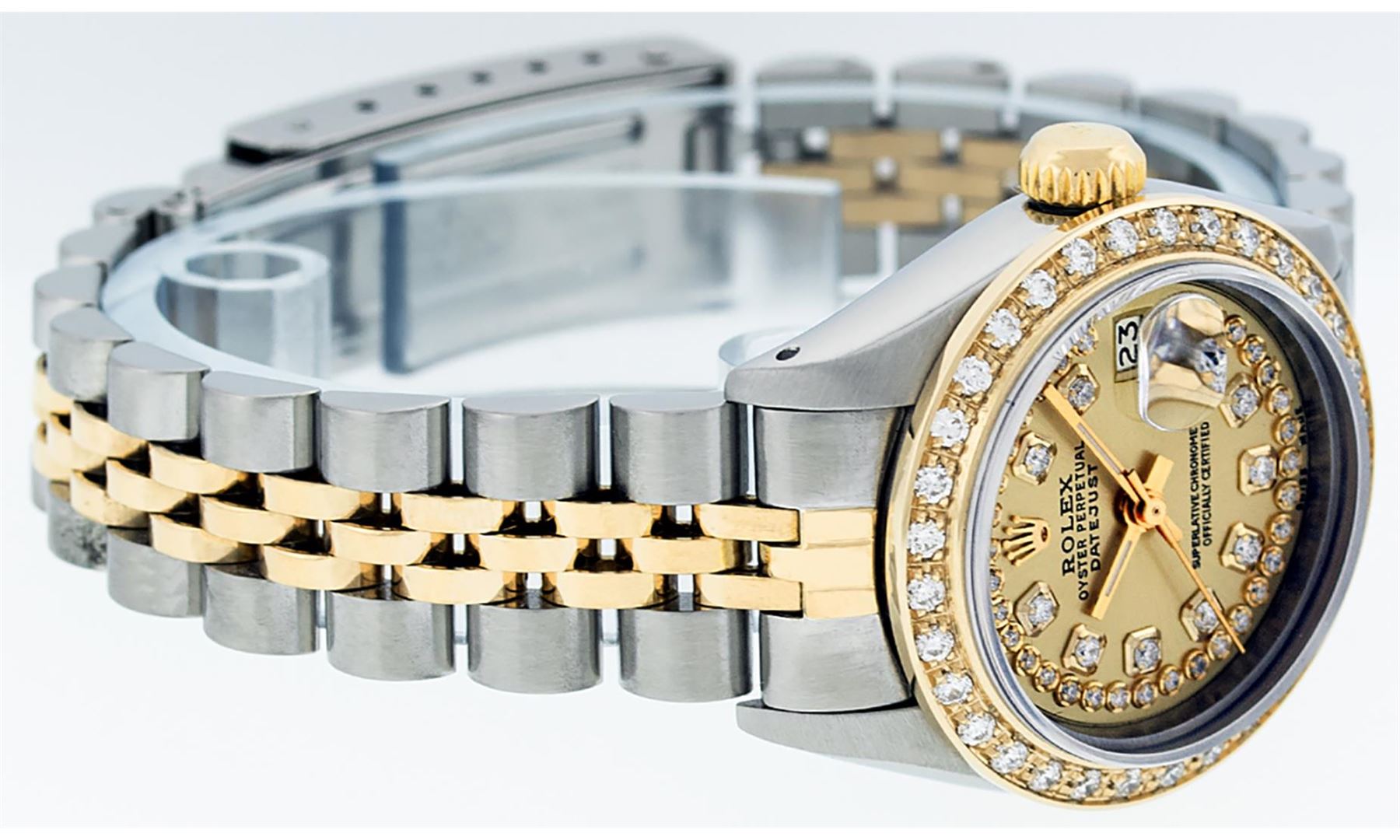 One Ladies Pre Owned Quickset Two Tone 18K Yellow Gold And Stainless Steel Rolex Datejust Polished, Serviced And Electronically Tested, Yellow Gold And Stainless Steel Case: 26mm, Yellow Gold Crown, Custom Bezel: New 18K Yellow Gold Beadset Diamond Bezel, Diamond Count: 32 Diamonds. Custom Crystal: New Sapphire With Magnified Date Window. Custom Hands: New Luminescent Hands. Rolex Movement: Automatic Winding Movement 2135. Custom Dial: Custom Champagne Dial With Added Diamonds, Diamond Count: 43 Diamonds. Date Window: 3 O'Clock Position Date Display, Model: Quickset Datejust. Condition: G-6 Extra Fine. Rolex Bracelet: Two Tone Yellow Gold And Stainless Steel Jubilee Band. Bright Polish. 6.0 Inch Length, Adjustable. Standard Clasp, With Rolex Logo. This Watch Has Been Serviced Time Tested And Is In Excellent Condition It Is Free Of All Scratches And Dents.