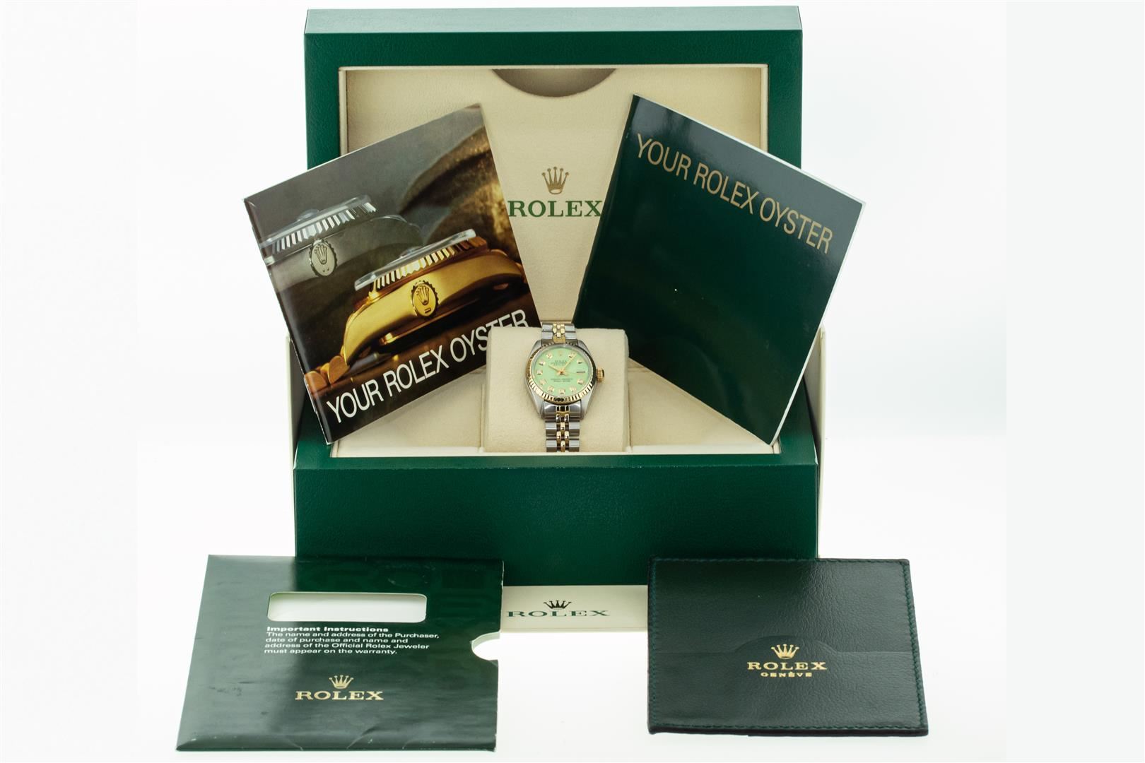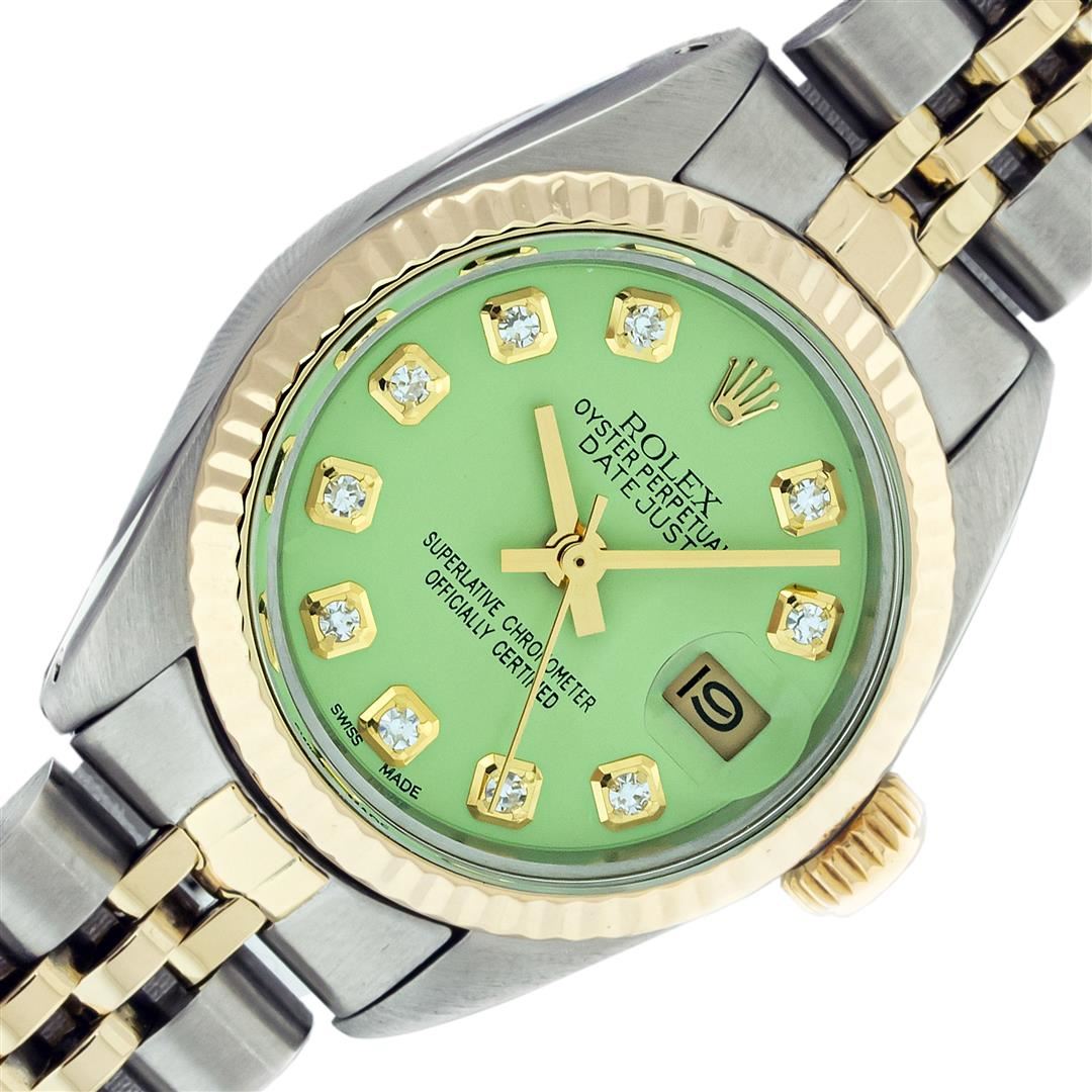 One Ladies Pre Owned Two Tone Rolex Datejust Polished, Serviced & Electronically Tested, Rolex Yellow Gold & Stainless Steel Case: 26mm, Rolex Yellow Gold Crown, Rolex Bezel: Yellow Gold Fluted Bezel. Custom Crystal: New Acrylic Cyclops Lens. Custom Hands: New Yellow Hands. Rolex Movement: Automatic Winding Movement. Custom Dial: Refinish To Green With Added Diamond Hour Markers, Diamond Count: 10 Diamonds, Color: G to H, Clarity: VS2-SI1. Date Window: 3 O'Clock Position Date Display, Model: Datejust. Condition: G-6 Extra Fine. Rolex Bracelet: Two Tone Yellow Gold & Stainless Steel Jubilee Band. Bright Polish. 6.0 Inch Length, Adjustable. Standard Clasp, With Rolex Logo. This Watch Has Been Serviced Time Tested And Is In Excellent Condition It Is Free Of All Scratches And Dents.