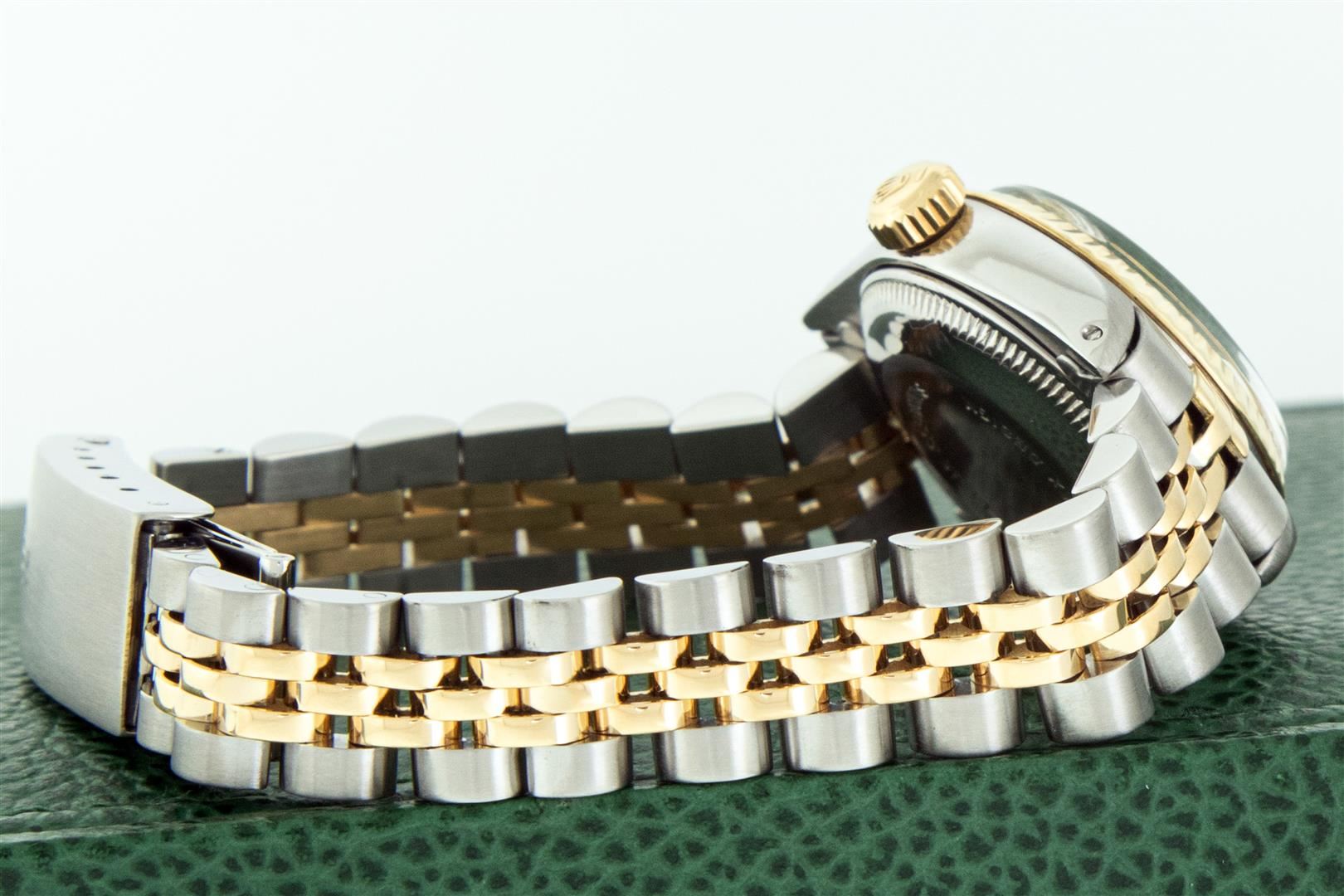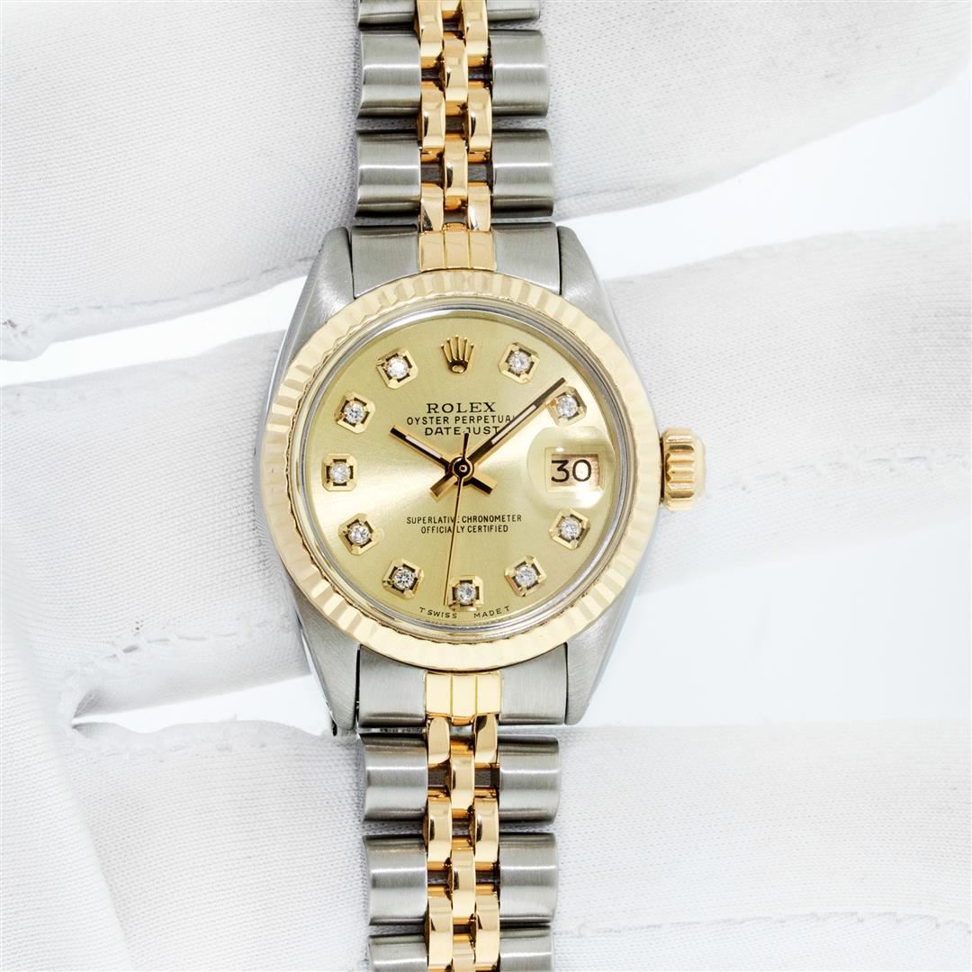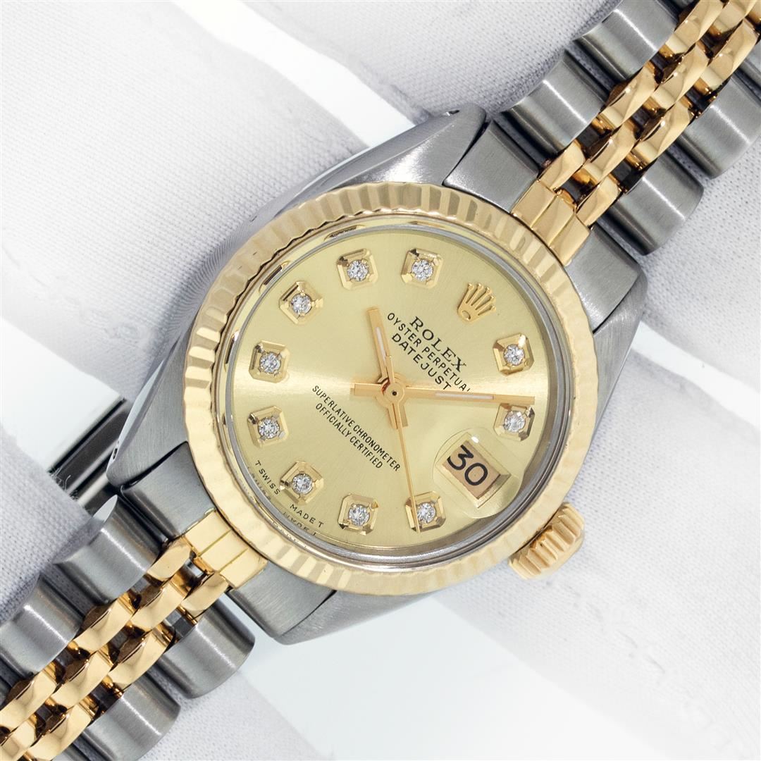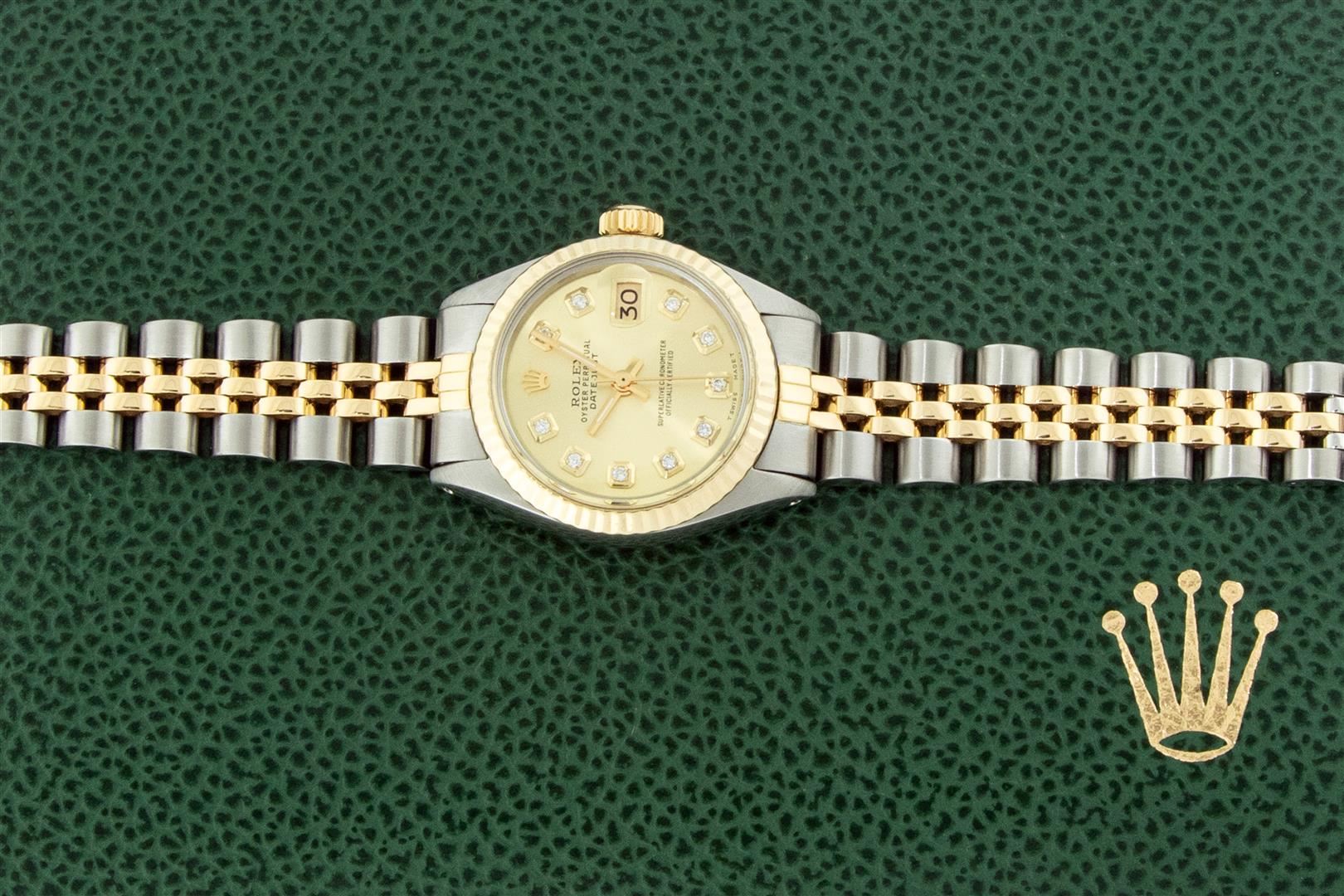 One Ladies Pre Owned Two Tone Rolex Datejust Polished, Serviced & Electronically Tested, Rolex Yellow Gold & Stainless Steel Case: 26mm, Rolex Yellow Gold Crown, Rolex Bezel: Rolex Yellow Gold Fluted Bezel. Custom Crystal: New Acrylic Cyclops Lens. Custom Hands: New Luminescent Hands. Rolex Movement: Automatic Winding Movement. Custom Dial: Refinished To Champagne With Custom Added Diamond Hour Markers, Diamond Count: 10 Diamonds In Dial, Color: G to H, Clarity: VS2-SI1. Date Window: 3 O'Clock Position Date Display, Model: Datejust. Condition: G-6 Extra Fine. Rolex Bracelet: Two Tone Yellow Gold & Stainless Steel Jubilee Band. Bright Polish. 6.0 Inch Length, Adjustable. Standard Clasp, With Rolex Logo. This Watch Has Been Serviced Time Tested And Is In Excellent Condition It Is Free Of All Scratches And Dents. This Watch Comes With A Rolex Box.