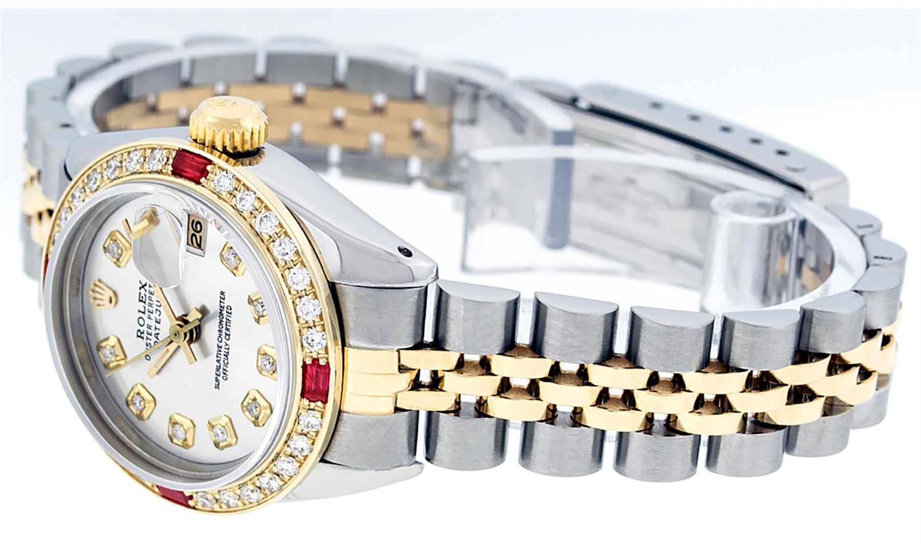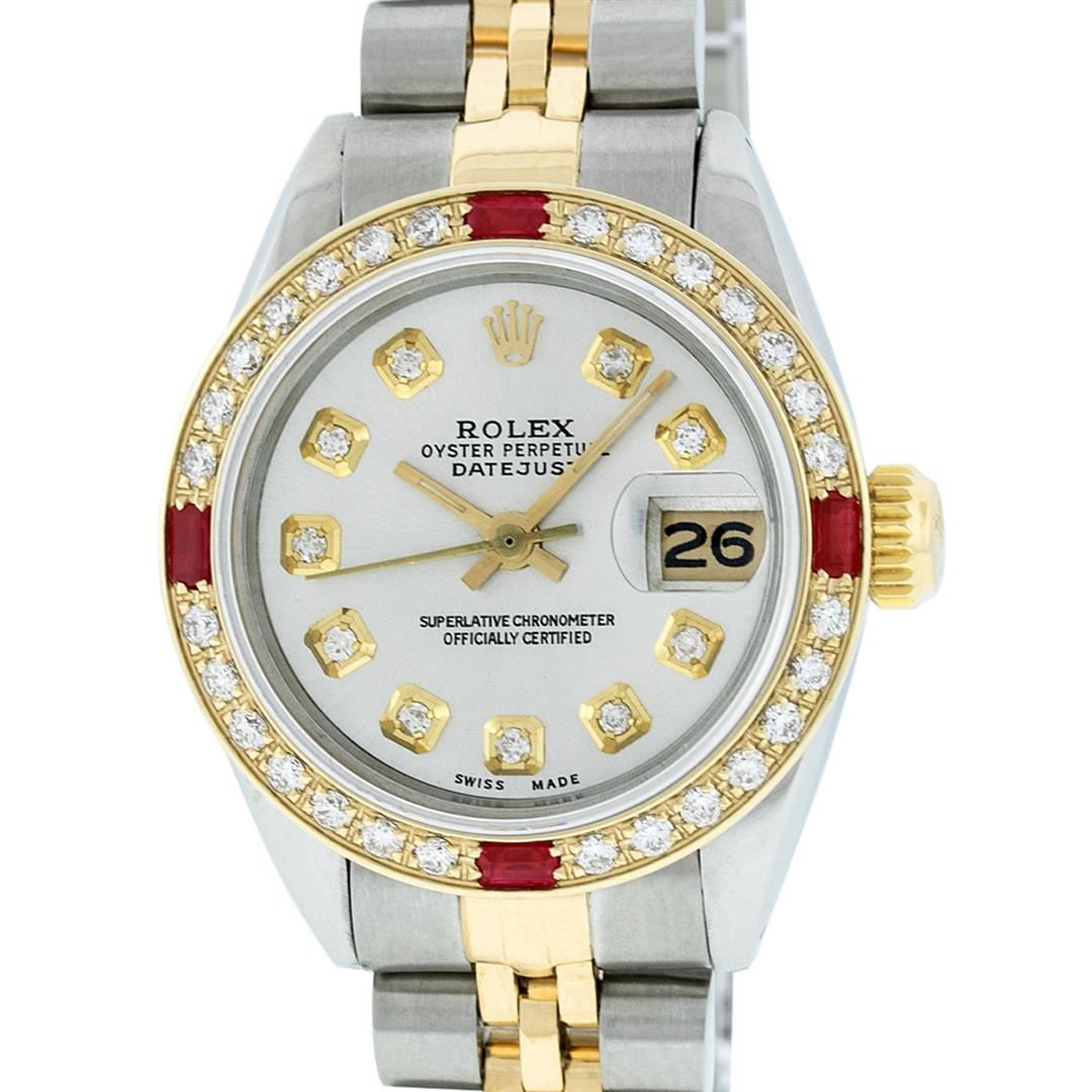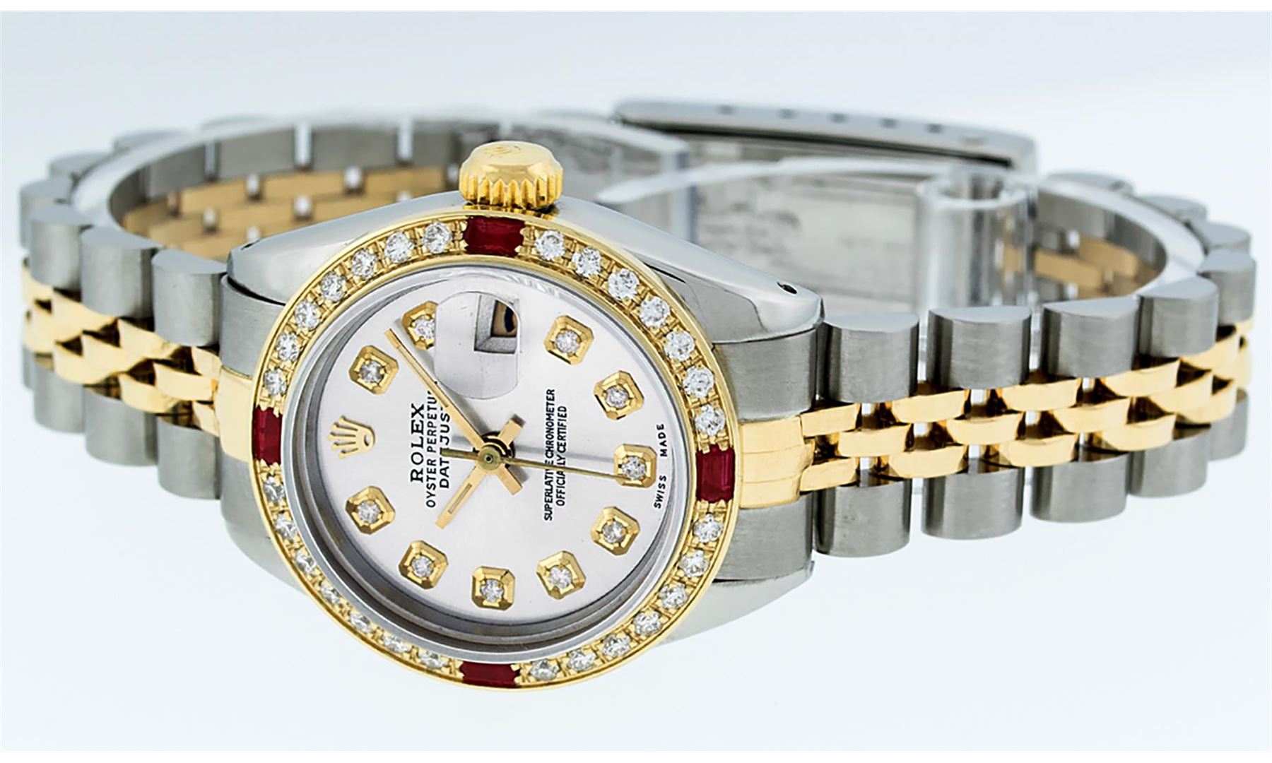 One Ladies Two Tone Rolex Datejust Polished, Serviced & Electronically Tested, Yellow Gold & Stainless Steel Case: 26mm, Yellow Gold Crown, Custom Bezel: New 18K Yellow Gold Ruby Beadset Diamond Bezel, Diamond + Gem Count: 28 Diamonds + 4 Rubies Total Weight .70 Carat, Clarity: Si-VS, Color: G to H. Custom Crystal: New Synthetic Sapphire Cyclops Lens. Custom Hands: New Luminescent Hands. Movement: Automatic Winding Movement. Custom Dial: Silver With Diamond Hour Markers, Diamond Count: 10 Diamonds On Dial, G To H In Color, Si-VS Clarity. Date Window: 3 O'Clock Position Date Display, Model: Datejust, Condition: G-6 Extra Fine. Bracelet: Two Tone Yellow Gold & Stainless Steel Jubilee. Bright Polish. 6.0 Inch Length, Adjustable. Standard Clasp, With Rolex Logo. This Watch Has Been Serviced Time Tested And Is In Excellent Condition It Is Free Of All Scratches And Dents.