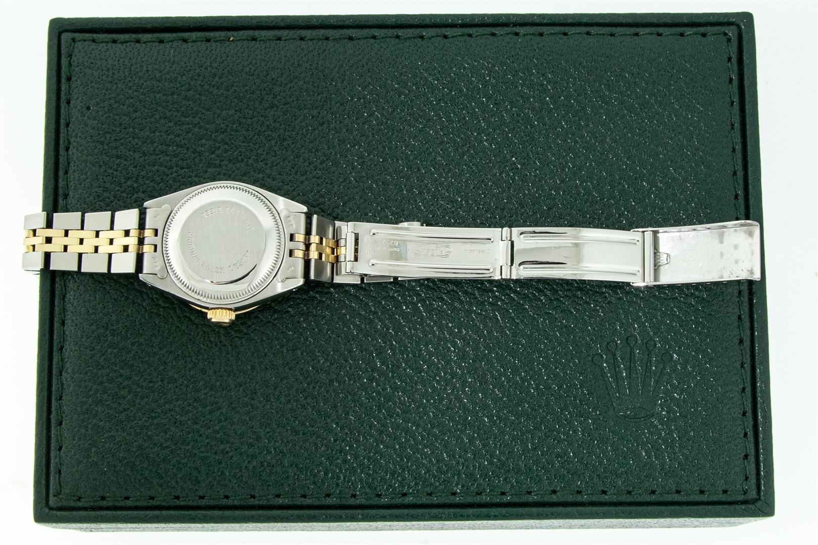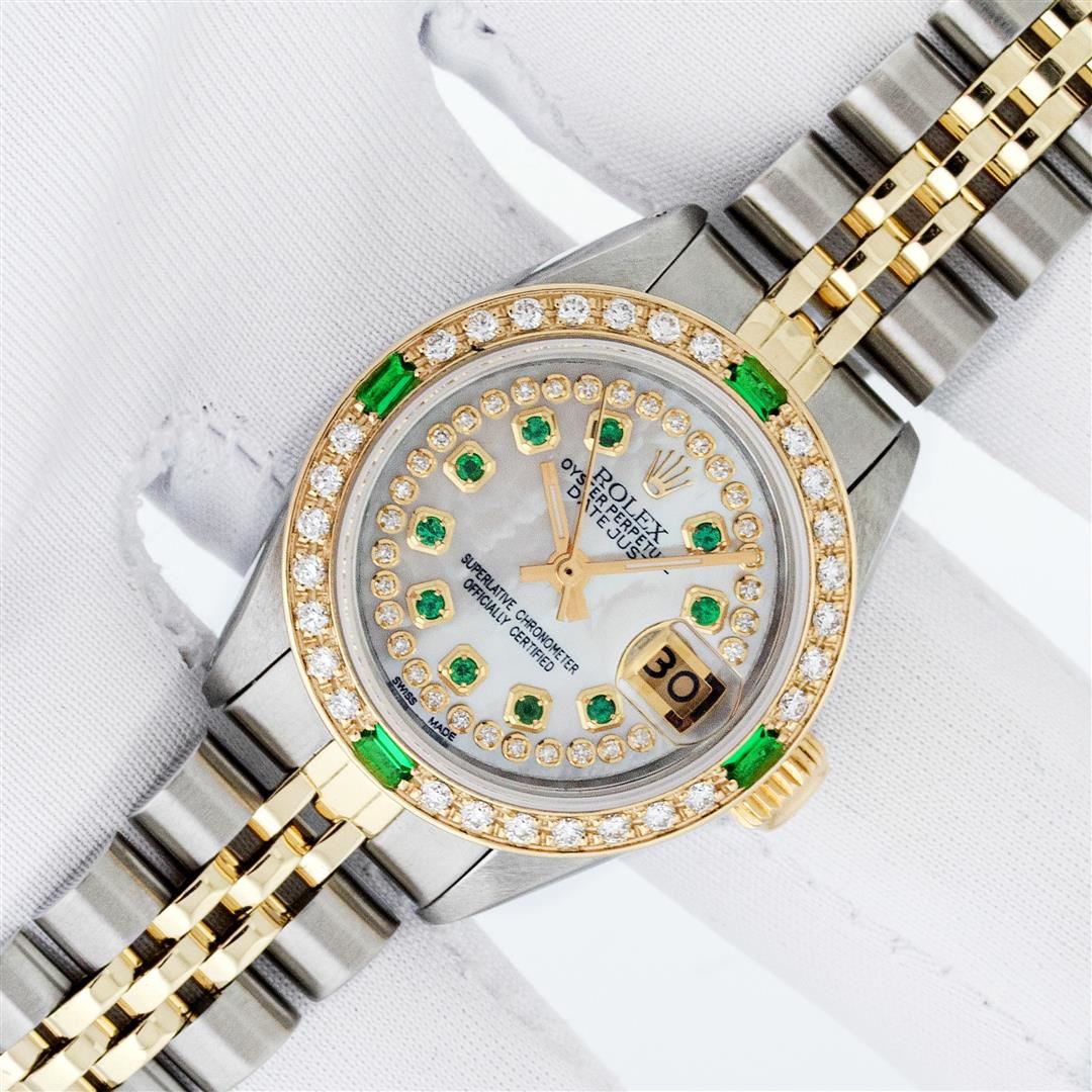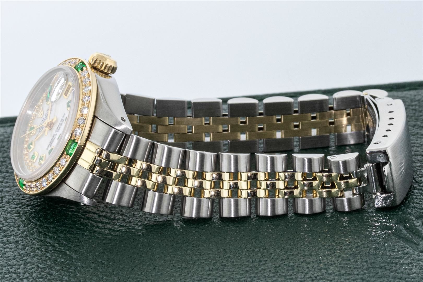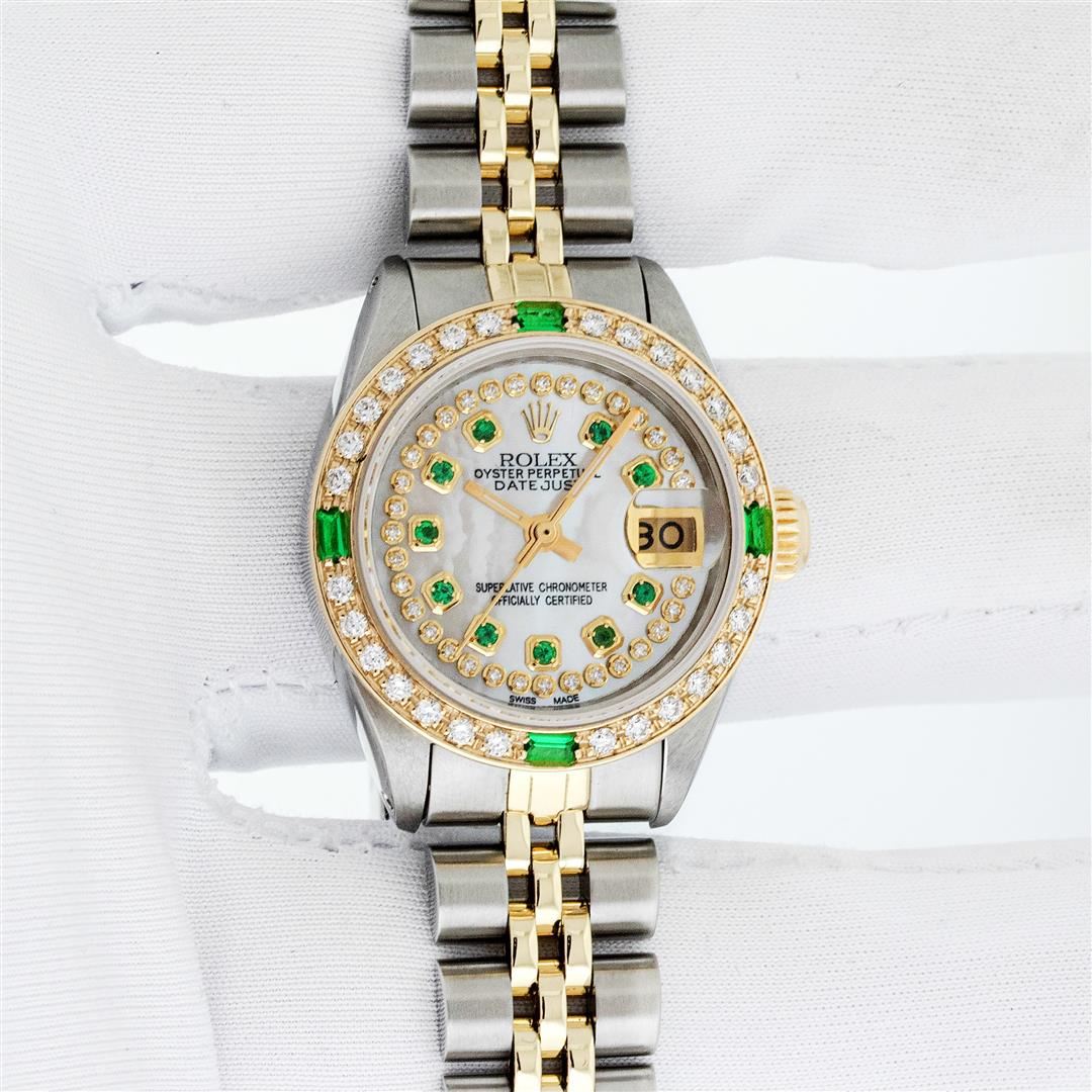 One Ladies Two Tone Rolex Datejust Polished, Serviced & Electronically Tested, Yellow Gold & Stainless Steel Case: 26mm, Yellow Gold Crown, Custom Bezel: New 18K Yellow Gold Emerald Beadset Diamond Bezel, Diamond Count: 28 Diamonds + 4 Emeralds, Clarity: SI-VS, Color: G to H. Custom Crystal: New Sapphire with Date Window. Custom Hands: New Luminescent Hands. Rolex Movement: Automatic Winding Movement. Custom Dial: Mother Of Pearl with Custom Added Green Emerald String Diamond Hour Markers. 10 Emeralds + 33 Diamonds In Dial, Clarity: SI-VS, Color: G to H. Date Window: 3 O'Clock Position Date Display, Model: Datejust. Condition: G-6 Extra Fine. Rolex Bracelet: Two Tone Yellow Gold & Stainless Steel Jubilee. Bright Polish. 6.0 Inch Length, Adjustable. Standard Clasp, with Rolex Logo. This Watch Has Been Serviced Time Tested And Is In Excellent Condition It Is Free Of All Scratches And Dents. This Watch Comes with A Rolex Box.