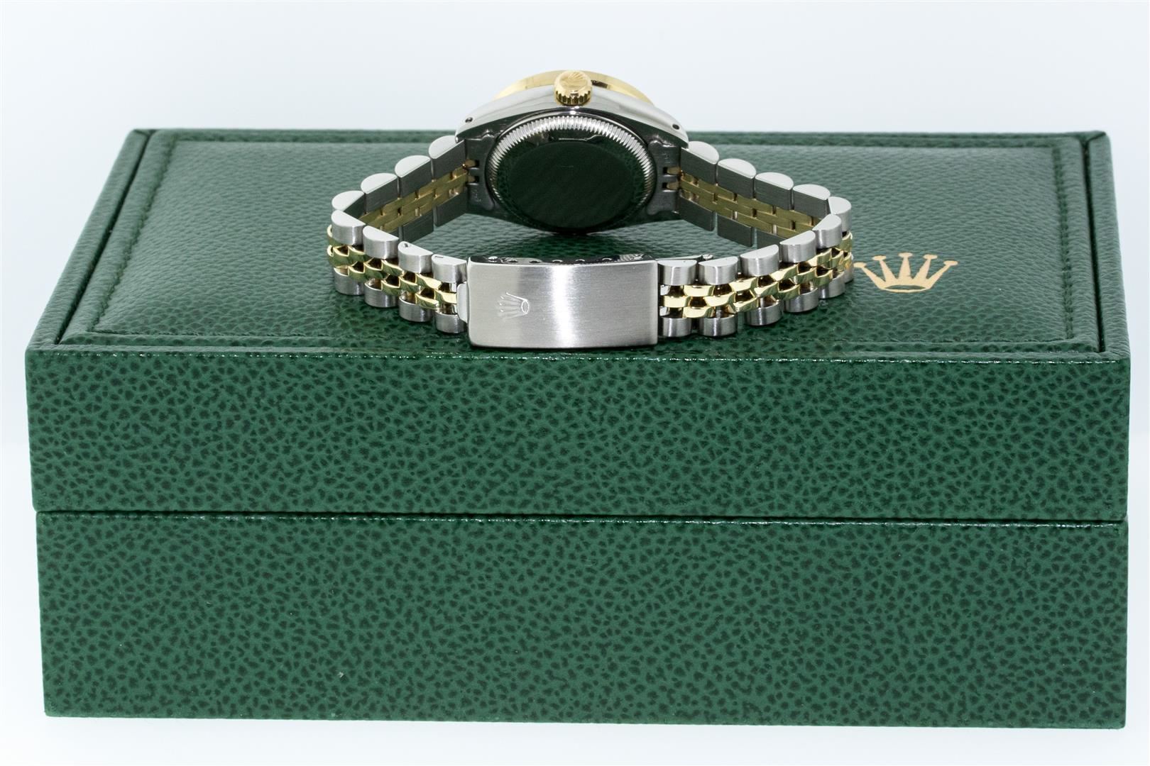 One Ladies Two Tone Rolex Datejust Polished, Serviced & Electronically Tested, Yellow Gold & Stainless Steel Case: 26mm, Yellow Gold Crown, Custom Diamond Lugs: 24 Diamonds On Lugs, Clarity: SI-VS, Color: G to H, Clarity SI-VS. Custom Bezel: New 18K Yellow Gold Pyramid Diamond Bezel, Diamond Count: 24 Diamonds On Bezel, Clarity: SI-VS, Color: G to H. Custom Crystal: New Sapphire with Date Window. Custom Hands: New Luminescent Hands. Rolex Movement: Automatic Winding Movement. Custom Dial: Mother Of Pearl with Emerald Hour Markers, Stone Count: 10 Emeralds + 33 Diamonds In Dial, Clarity: SI-VS, Color: G to H. Date Window: 3 O'Clock Position Date Display, Model: Datejust. Condition: G-6 Extra Fine. Rolex Bracelet: Two Tone Yellow Gold & Stainless Steel Jubilee. Bright Polish. 6.0 Inch Length, Adjustable. Standard Clasp, with Rolex Logo. This Watch Has Been Serviced Time Tested And Is In Excellent Condition It Is Free Of All Scratches And Dents. This Watch Comes with A Rolex Box.