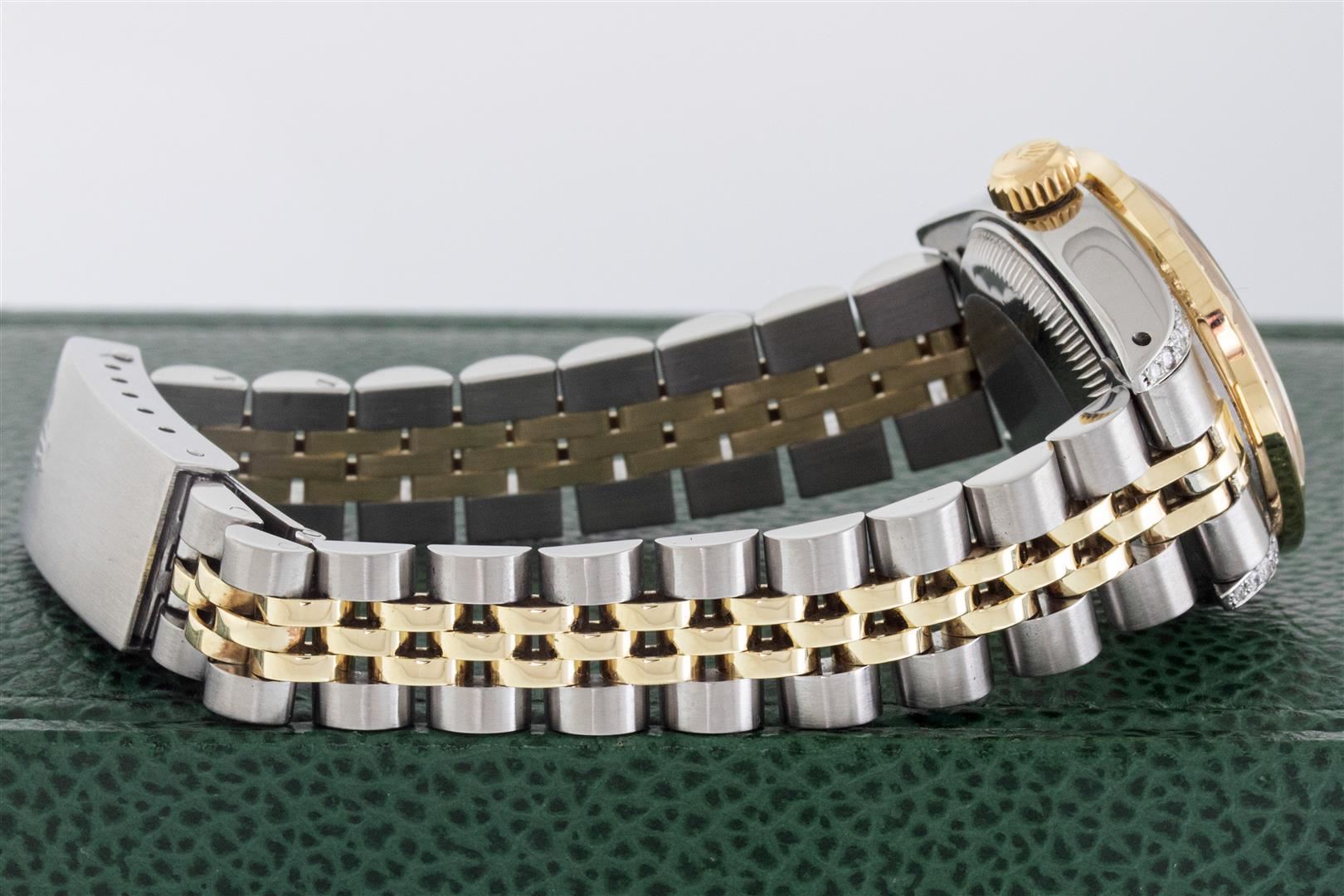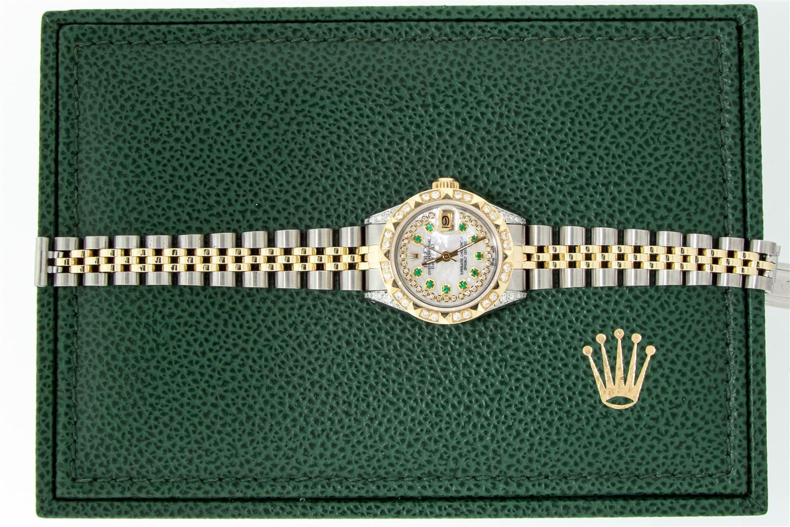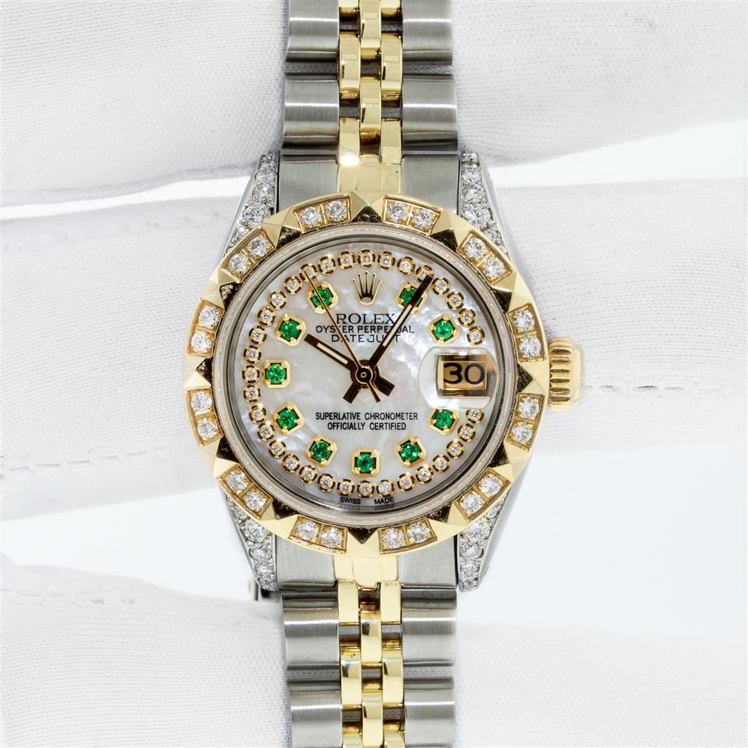 One Ladies Two Tone Rolex Datejust Polished, Serviced & Electronically Tested, Yellow Gold & Stainless Steel Case: 26mm, Yellow Gold Crown, Custom Diamond Lugs: 24 Diamonds On Lugs, Clarity: SI-VS, Color: G to H, Clarity SI-VS. Custom Bezel: New 18K Yellow Gold Pyramid Diamond Bezel, Diamond Count: 24 Diamonds On Bezel, Clarity: SI-VS, Color: G to H. Custom Crystal: New Sapphire with Date Window. Custom Hands: New Luminescent Hands. Rolex Movement: Automatic Winding Movement. Custom Dial: Mother Of Pearl with Emerald Hour Markers, Stone Count: 10 Emeralds + 33 Diamonds In Dial, Clarity: SI-VS, Color: G to H. Date Window: 3 O'Clock Position Date Display, Model: Datejust. Condition: G-6 Extra Fine. Rolex Bracelet: Two Tone Yellow Gold & Stainless Steel Jubilee. Bright Polish. 6.0 Inch Length, Adjustable. Standard Clasp, with Rolex Logo. This Watch Has Been Serviced Time Tested And Is In Excellent Condition It Is Free Of All Scratches And Dents. This Watch Comes with A Rolex Box.
