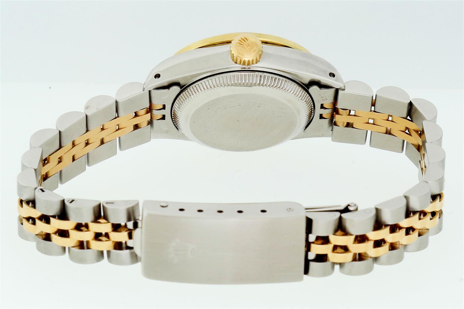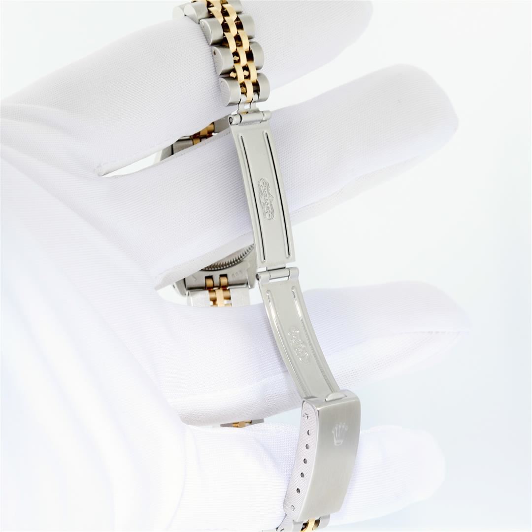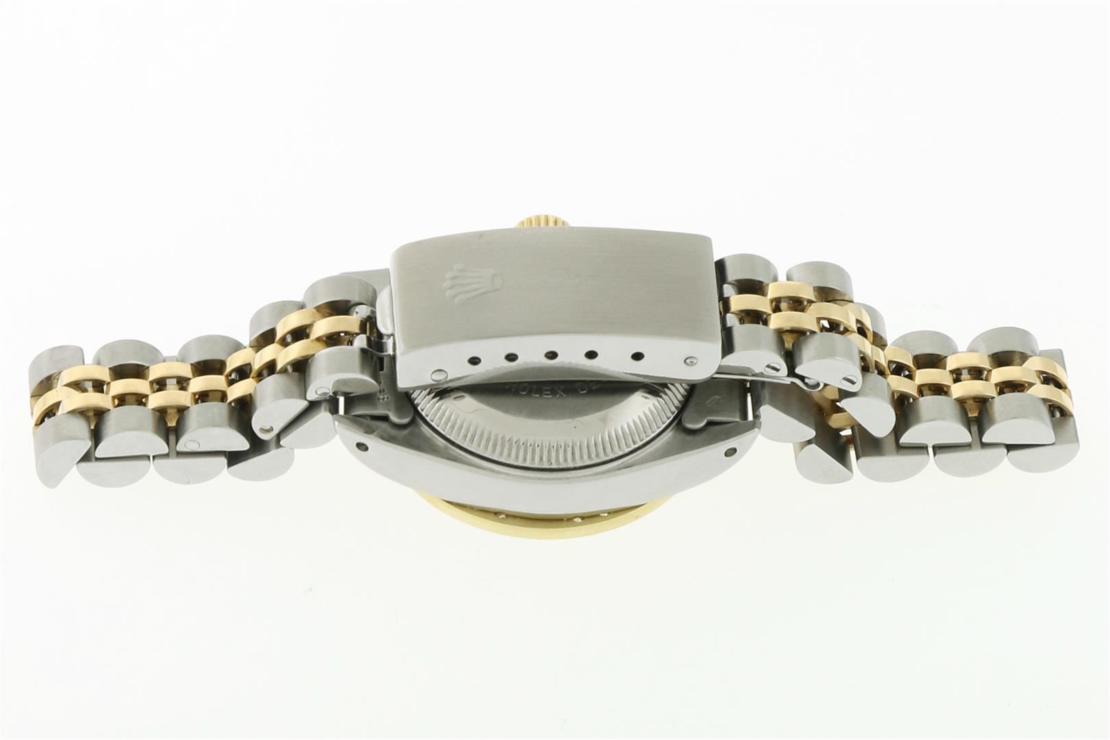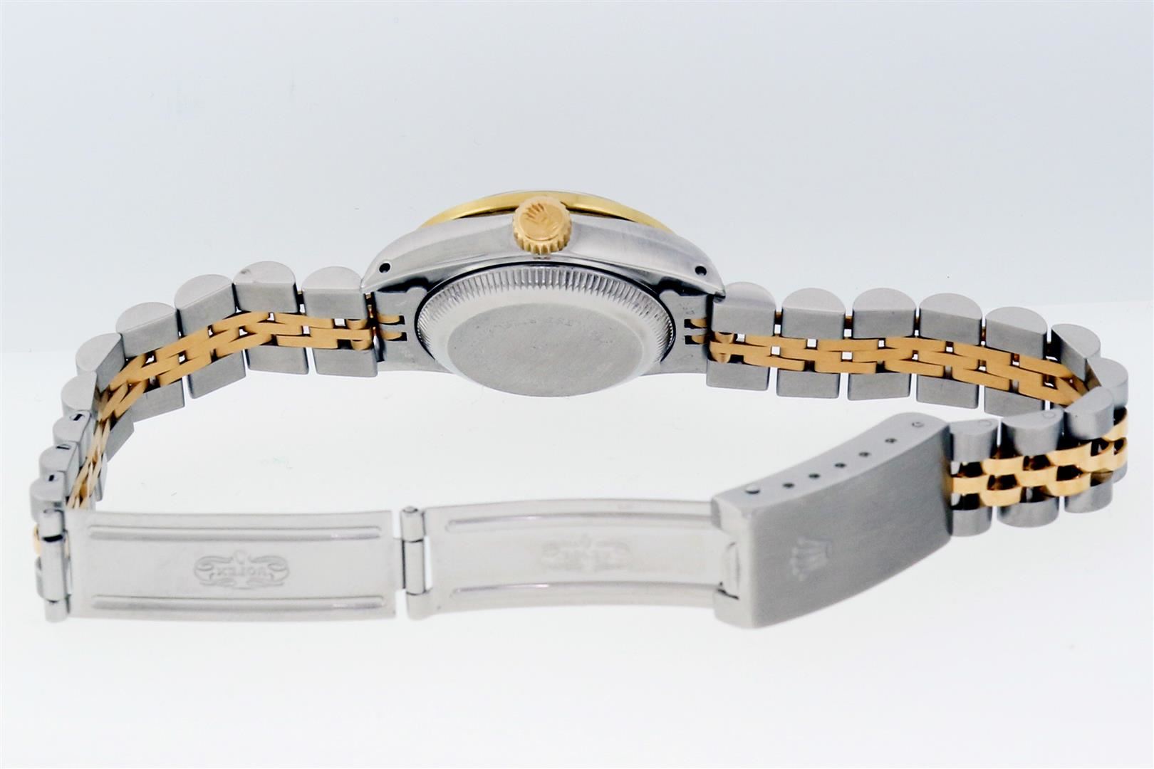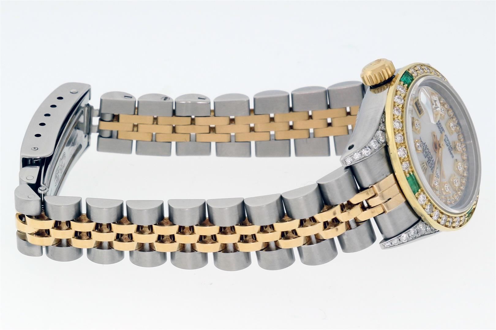 One Ladies Two Tone Rolex Datejust Polished Bright with Satin Finish, Serviced & Electronically Tested, Rolex Stainless Steel Case: 26mm, Rolex Stainless Steel Crown, Custom Diamond Lugs: 24 Diamonds On Lugs, Clarity: SI-VS, Color: G to H. Custom Bezel: New 18K Yellow Gold Emerald Beadset Bezel, Diamond Count: 28 Diamonds + 4 Emerald, Clarity: SI-VS, Color: G to H. Custom Crystal: New Sapphire with Magnified Date Window. Custom Hands: New Luminescent Hands. Rolex Movement: Automatic Winding Movement. Custom Dial: Refinished To Mother of Pearl with Custom Added Diamonds, 43 Diamonds in Dial G To H In Color, Clarity: VS. Date Window: 3 O'Clock Position Date Display, Model: Datejust Condition: G-6 Extra Fine. Rolex Bracelet: Stainless Steel Jubilee Band. Bright Polish & Satin Finish. 6.0 Inch Length, Adjustable. Standard Clasp, with Rolex Logo. This Pre Owned Watch Has Been Serviced Time Tested And Is In Excellent Condition It Is Free Of All Scratches And Dents.